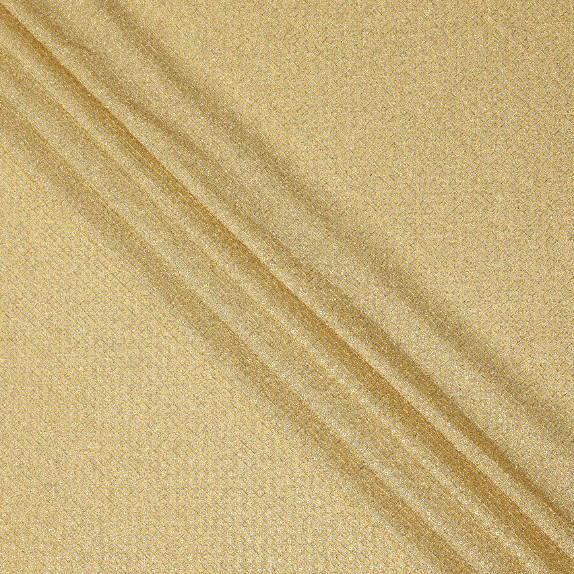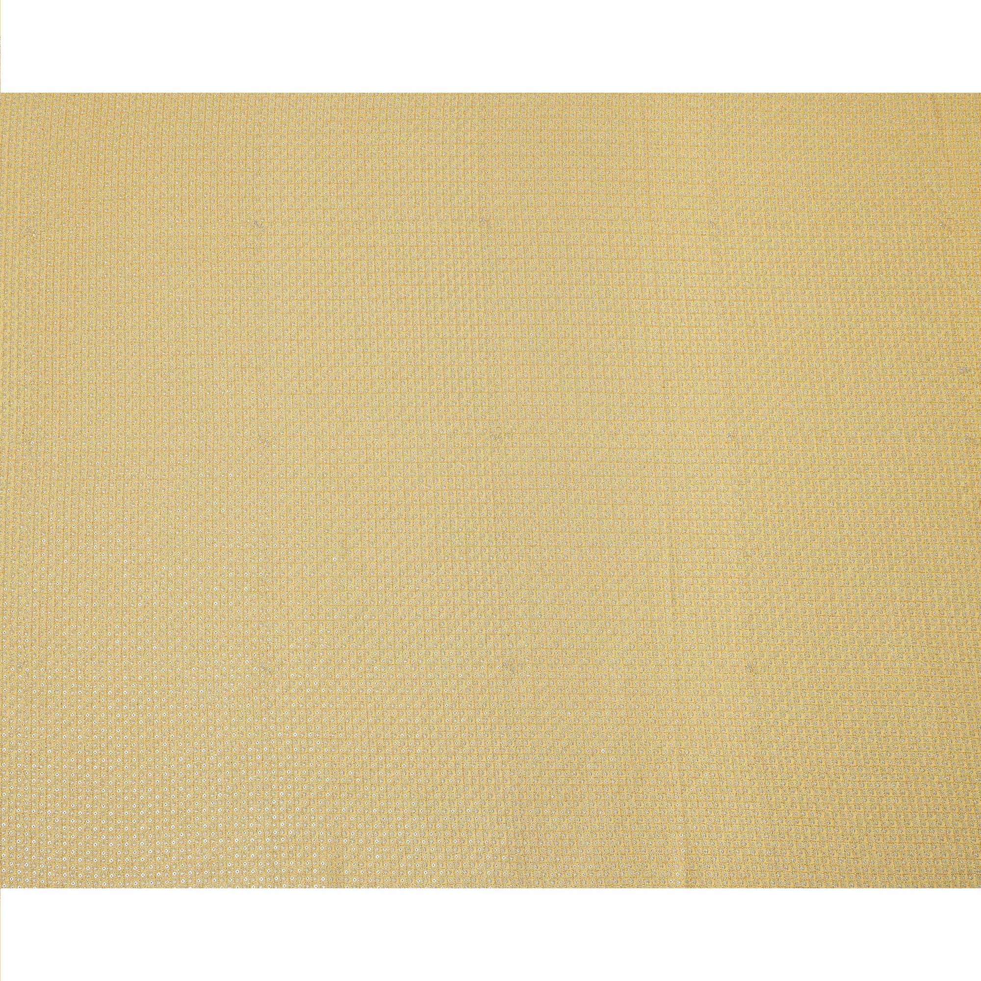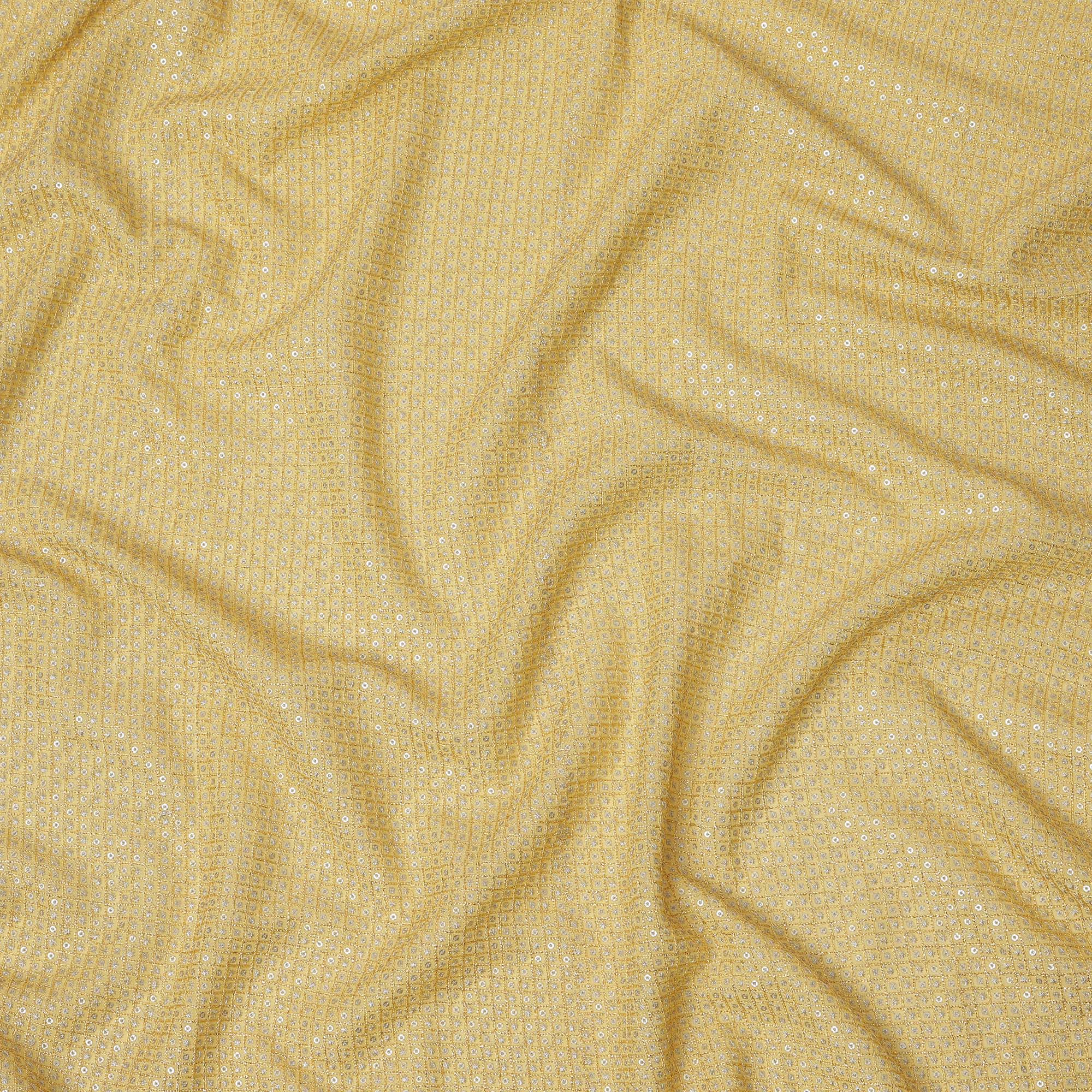 This sunshine yellow synthetic blended viscose fabric radiates festive vibrance with its intricate square grid embroidery, highlighted by delicate floral motifs and gleaming mirror embellishments. The bright golden hue is perfect for daytime celebrations, adding a cheerful elegance to ethnic outfits like lehengas, kurtas, or dupattas. The soft texture and fluid drape of viscose ensure both style and comfort, while the embroidery offers a traditional charm with a subtle sparkle. With a width of 110 cms, this fabric is versatile for creative tailoring. Made in India, it’s ideal for anyone looking to buy online premium festive wear fabric.
