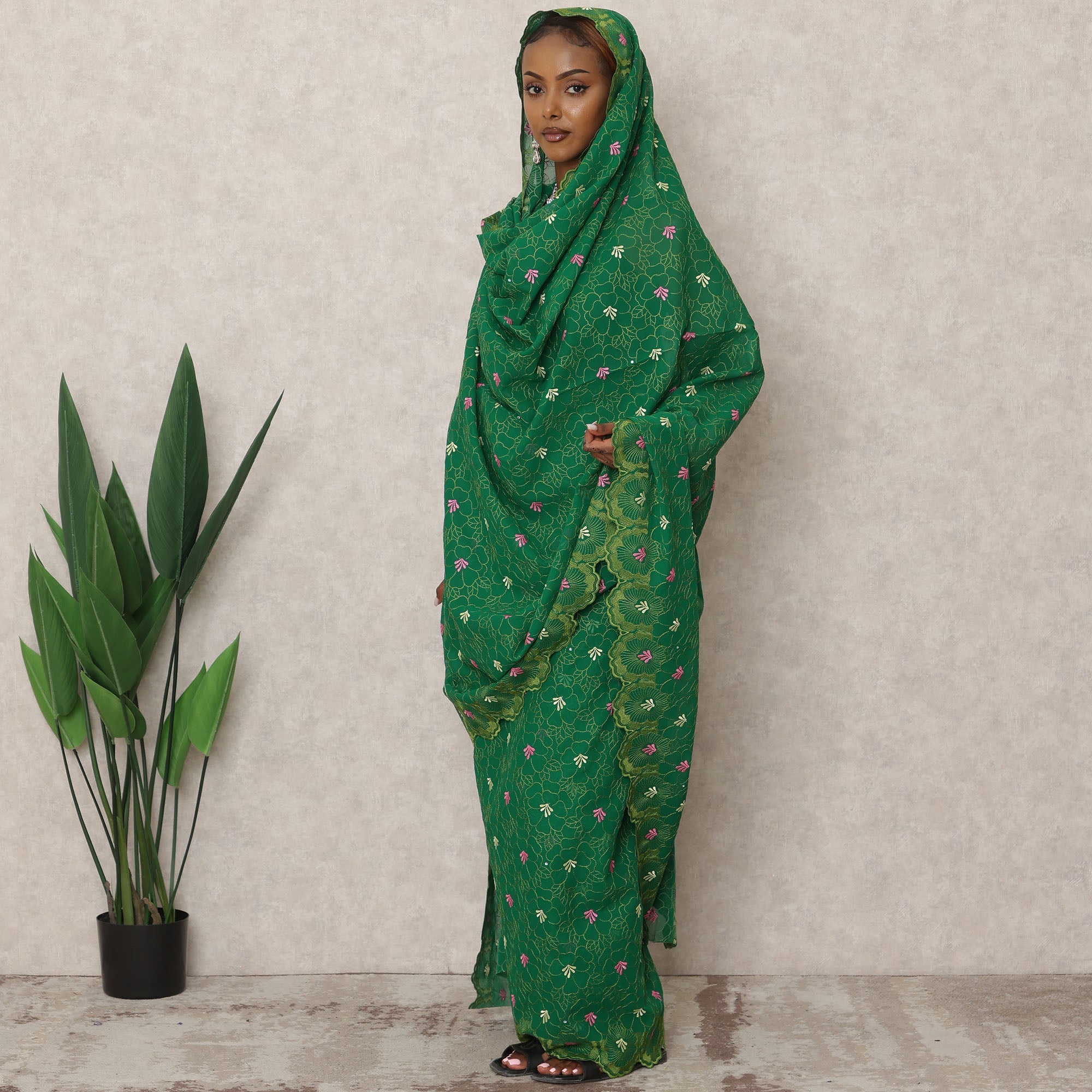 Showcase classic charm and vibrant tradition with this Swiss green traditional Sudanese thobe made from the finest pure cotton voile fabric. Spanning 4.5 meters in length and 140 cms in width, this thobe features beautifully arranged embroidery in pink and white floral motifs, perfectly complemented by delicate stone embellishments. The vivid green base brings a regal freshness to the overall look, while the lightweight Swiss cotton voile ensures all-day comfort and an elegant fall. The scalloped embroidered edges on the drape add a graceful finish, ideal for festive occasions, cultural ceremonies, and traditional gatherings. Crafted in Switzerland, this fabric reflects timeless sophistication combined with breathable ease. Shop online to own a piece that blends cultural elegance with premium European craftsmanship.