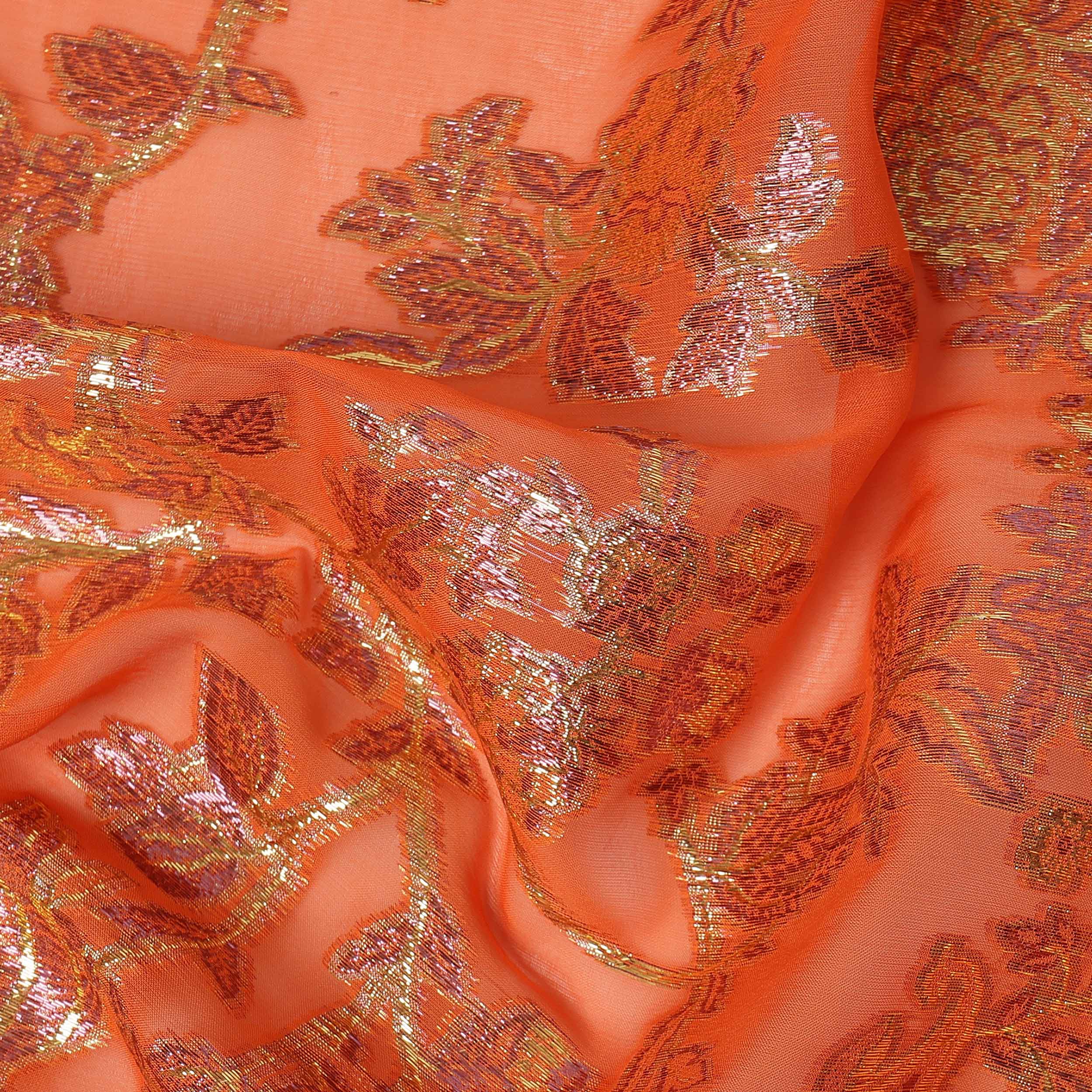 Vibrant tangerine orange silk chiffon fabric with metallic floral lurex design