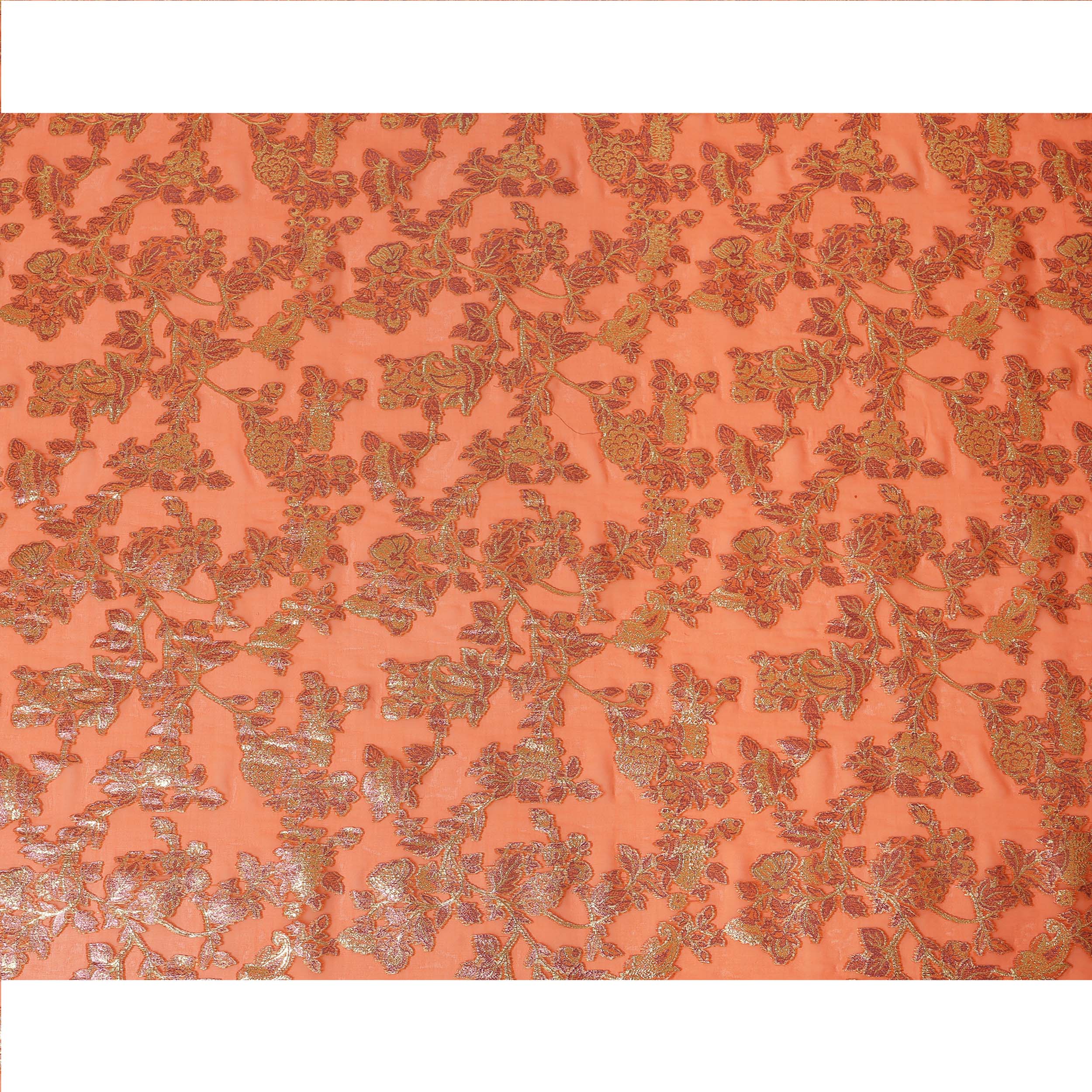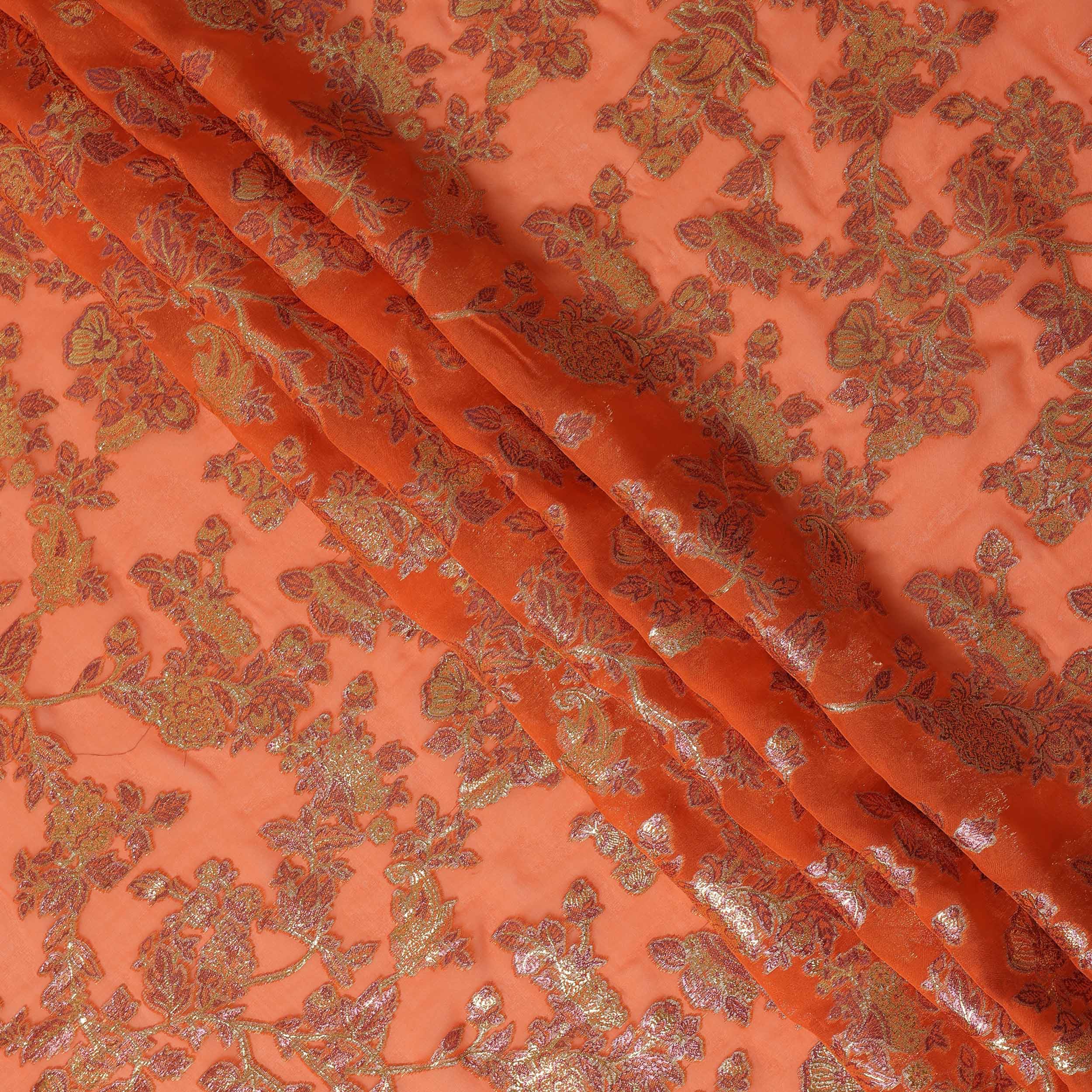 Tangerine Orange Floral Patterned Silk Chiffon Fabric with Metallic Lurex, 110 Cms Width, Made in South Korea-D26348