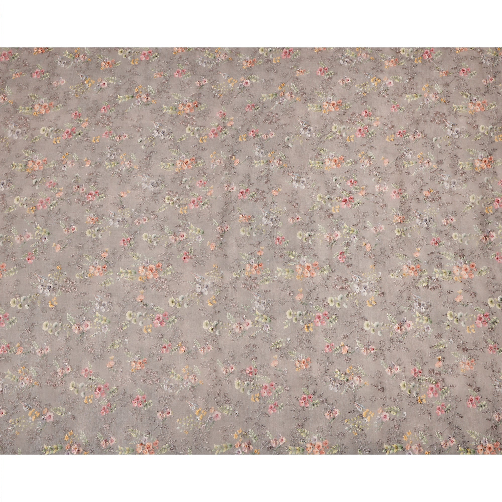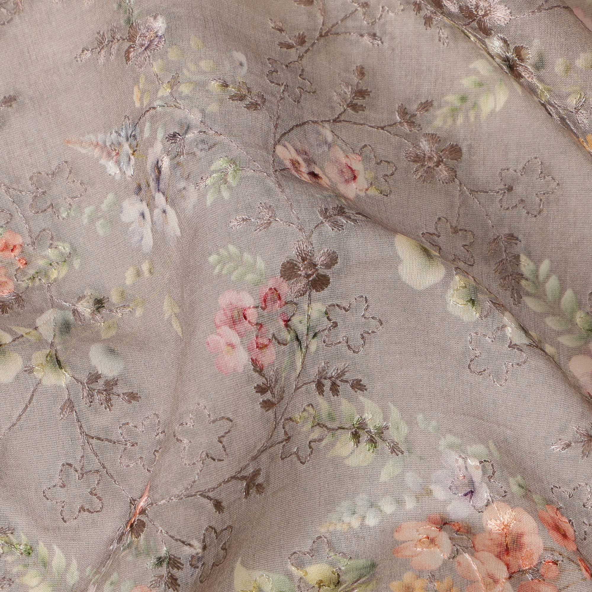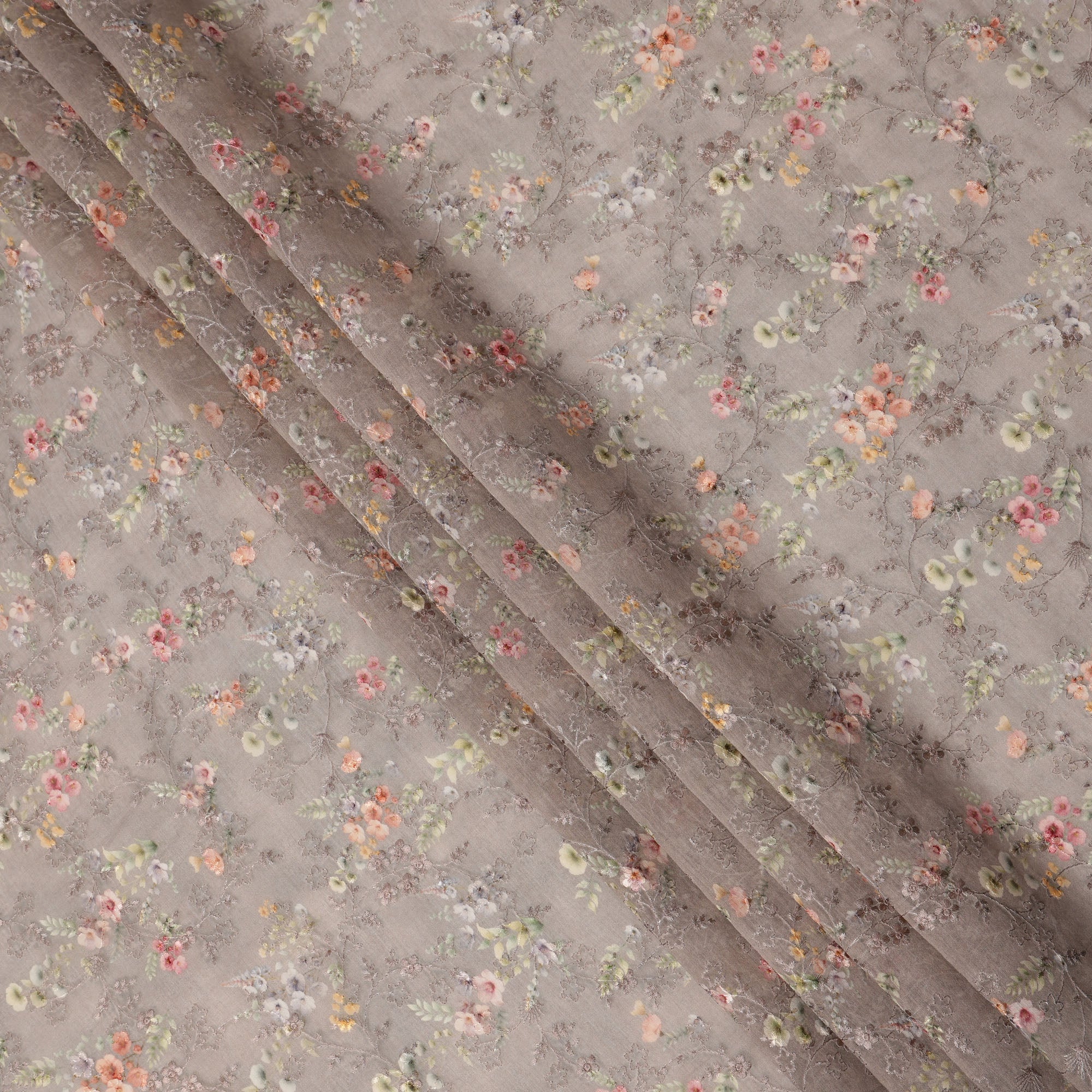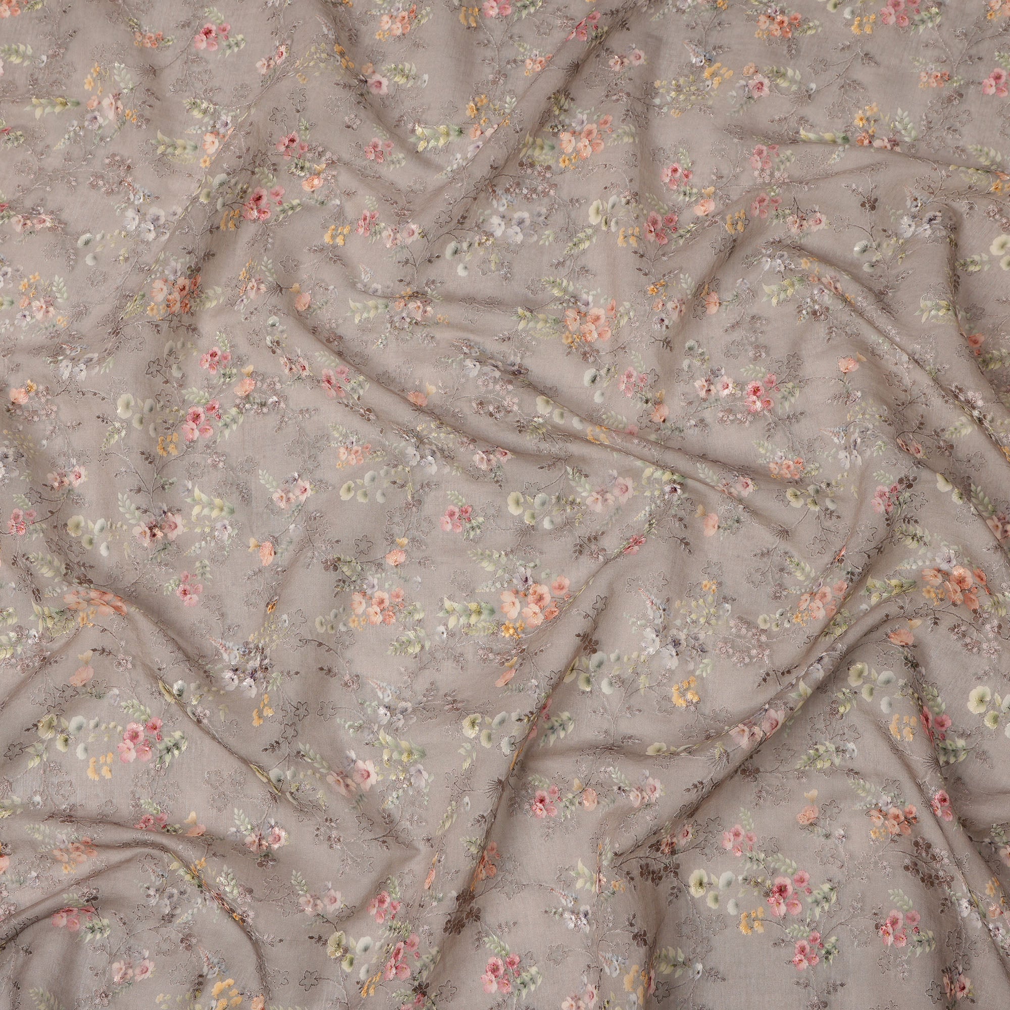 Elegant and refined, this taupe brown cotton voile fabric showcases a delicate micro floral print in pastel tones of peach, mint, blush pink, ivory, and soft yellow, all layered over a breathable, airy base enhanced with intricate tonal self-embroidery. The subtle floral scatter gives it a vintage yet timeless charm, while the soft texture makes it perfect for stylish sarees, flowy dupattas, breezy tunics, or casual ethnic sets. The embroidered accents add quiet sophistication and texture, ideal for those who prefer understated design with fine craftsmanship. With a versatile width of 110 cms, this Made in India fabric is crafted with precision to offer lightness and elegance. Shop online now to elevate your summer wardrobe with this serene and graceful embroidered cotton voile.