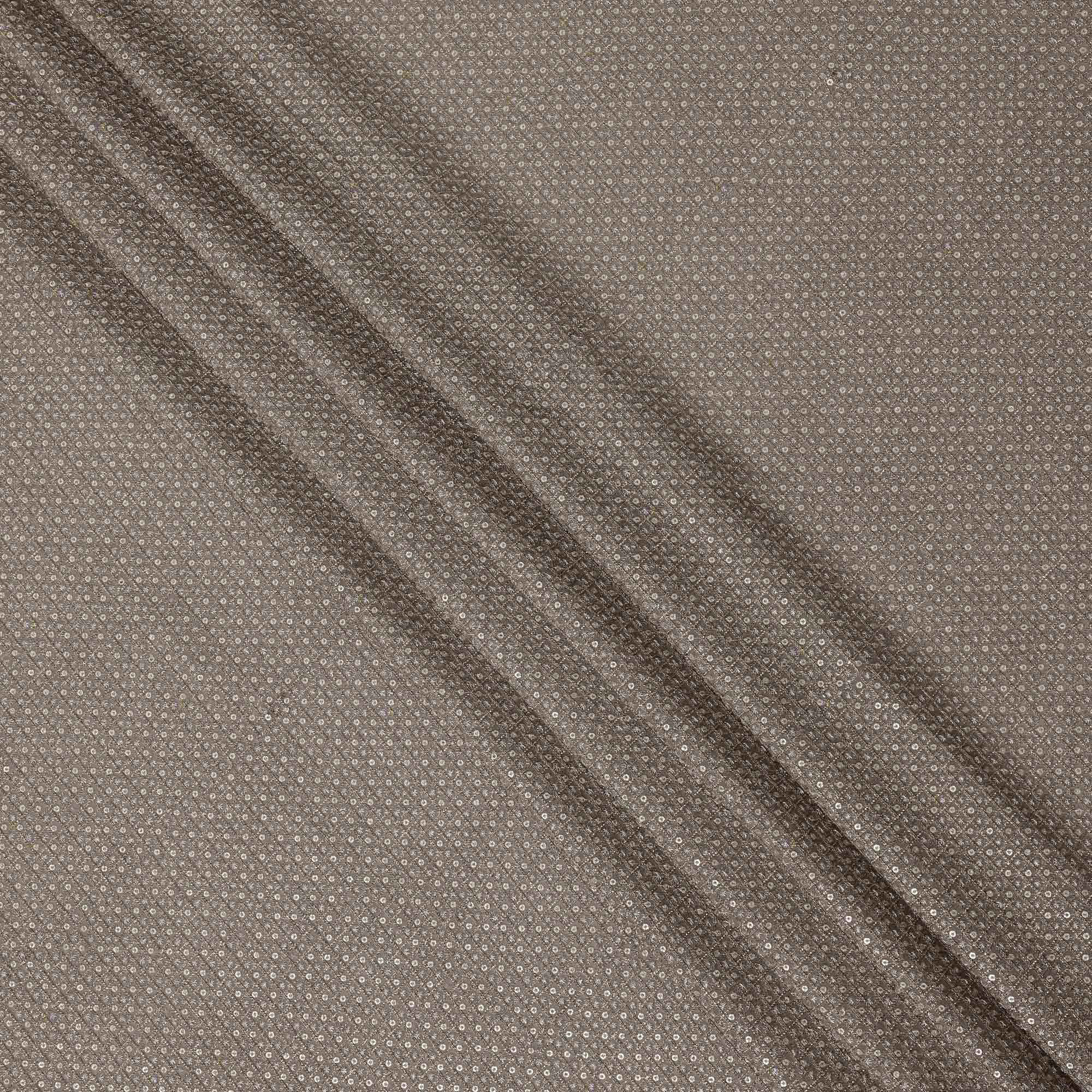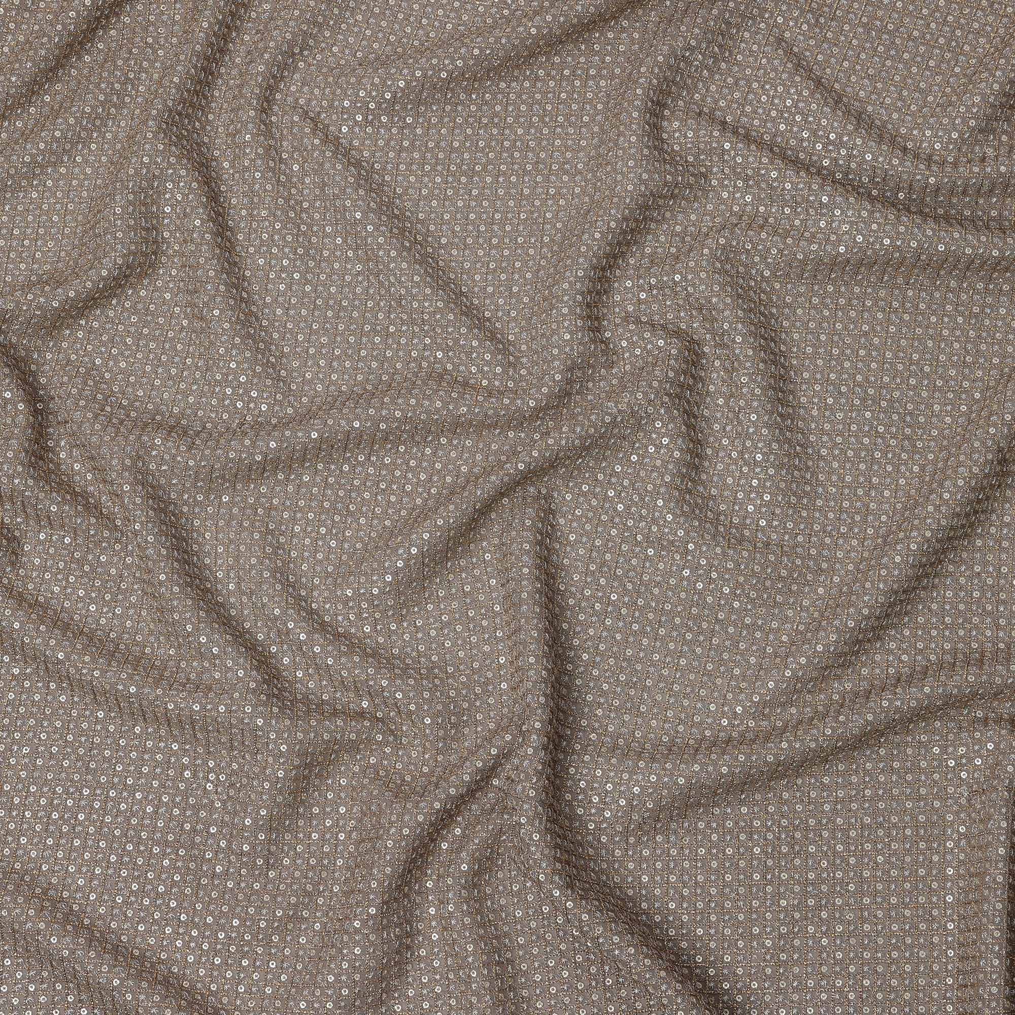This taupe brown synthetic blended viscose fabric is adorned with a meticulous square pattern filled with floral embroidery and delicate mirror embellishments, reflecting the essence of timeless ethnic style. The subtle brown hue is perfectly balanced with golden threadwork and silver mirrors, adding sophistication and soft shimmer. Crafted for both beauty and comfort, this fabric offers a breathable feel and graceful fall, making it ideal for sarees, anarkalis, or festive kurtas. Its 110 cms width allows for versatile applications. Made in India, this premium fabric is a must-have for anyone looking to shop online for elegant and festive ethnic fabrics.