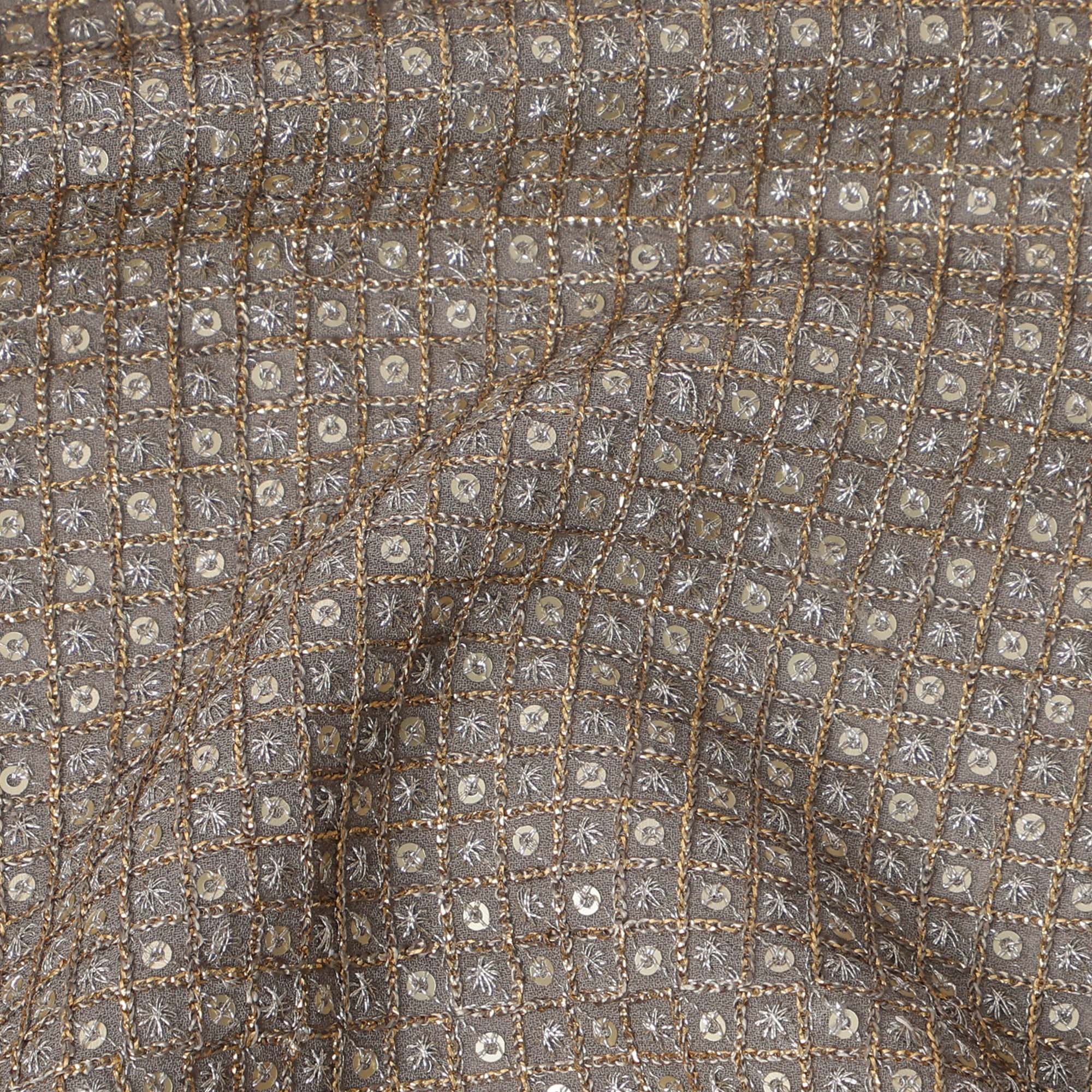This taupe brown synthetic blended viscose fabric is adorned with a meticulous square pattern filled with floral embroidery and delicate... Read more Read more