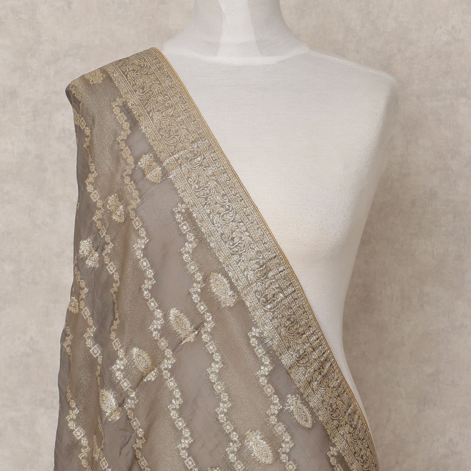 This Taupe Gold Tussar Silk Dupatta is a stunning fusion of understated elegance and traditional artistry, designed to add timeless grace to your ethnic collection. Handcrafted in India, it features intricate zari weave patterns in soft golden tones running diagonally across a refined taupe base, creating a sophisticated shimmer that catches the light beautifully. The dupatta is adorned with a delicately woven zari border, adding a regal touch to its luxurious texture. Crafted from premium Tussar silk, it offers a natural sheen and lightweight drape, making it perfect for both festive and formal occasions. Measuring 225x85 cms, it allows for versatile styling—whether draped over sarees, suits, or contemporary ensembles. The combination of rich silk texture, elegant metallic accents, and artisan weaving reflects the enduring charm of Indian craftsmanship. Ideal for those who appreciate subtle opulence, this dupatta effortlessly blends modern sophistication with traditional heritage.