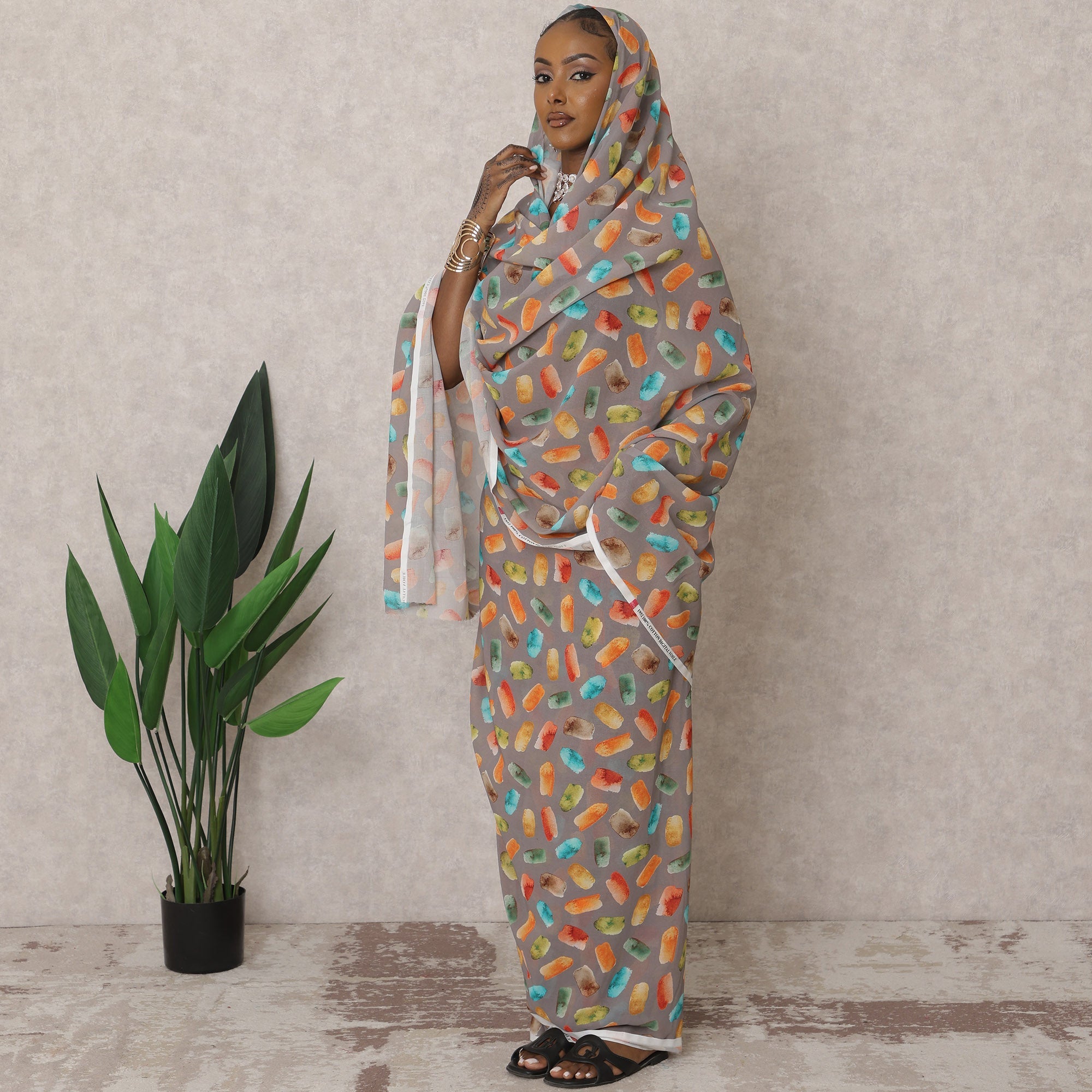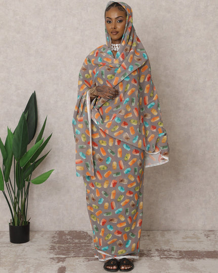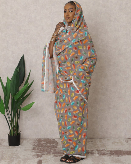 Step into elegance with this stunning taupe traditional Sudanese thobe, crafted from soft and breathable pure cotton voile fabric for ultimate comfort. The 4.5-meter-long fabric drapes beautifully, offering a sophisticated and modest silhouette ideal for cultural gatherings, festive occasions, and everyday wear. Designed with a vibrant abstract print in shades of orange, blue, and green, this thobe brings a unique blend of tradition and modern style. With a width of 110 cm, it ensures full coverage while maintaining a lightweight and airy feel. Expertly crafted in India, this high-quality thobe is easy to care for, retaining its vibrant colors and fabric softness even after multiple washes, making it a must-have addition to any wardrobe.