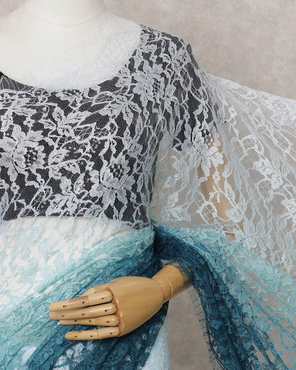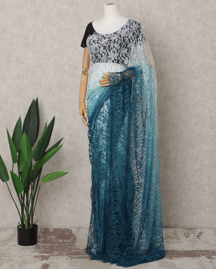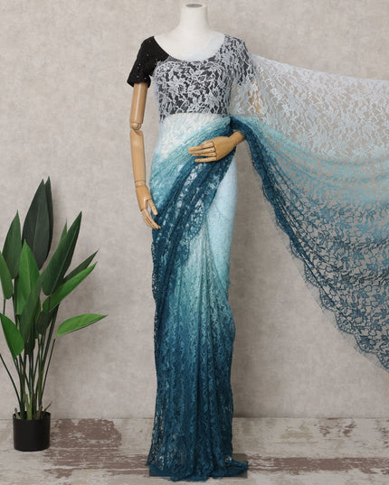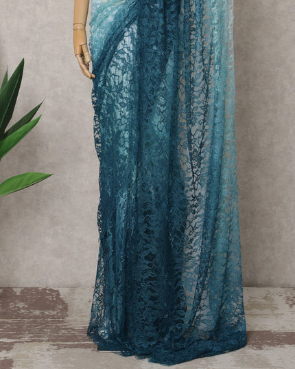 Teal Blue and Aqua Ombre French Chantilly Lace Saree, 5.5 Meters, 110 cm Wide-D21823