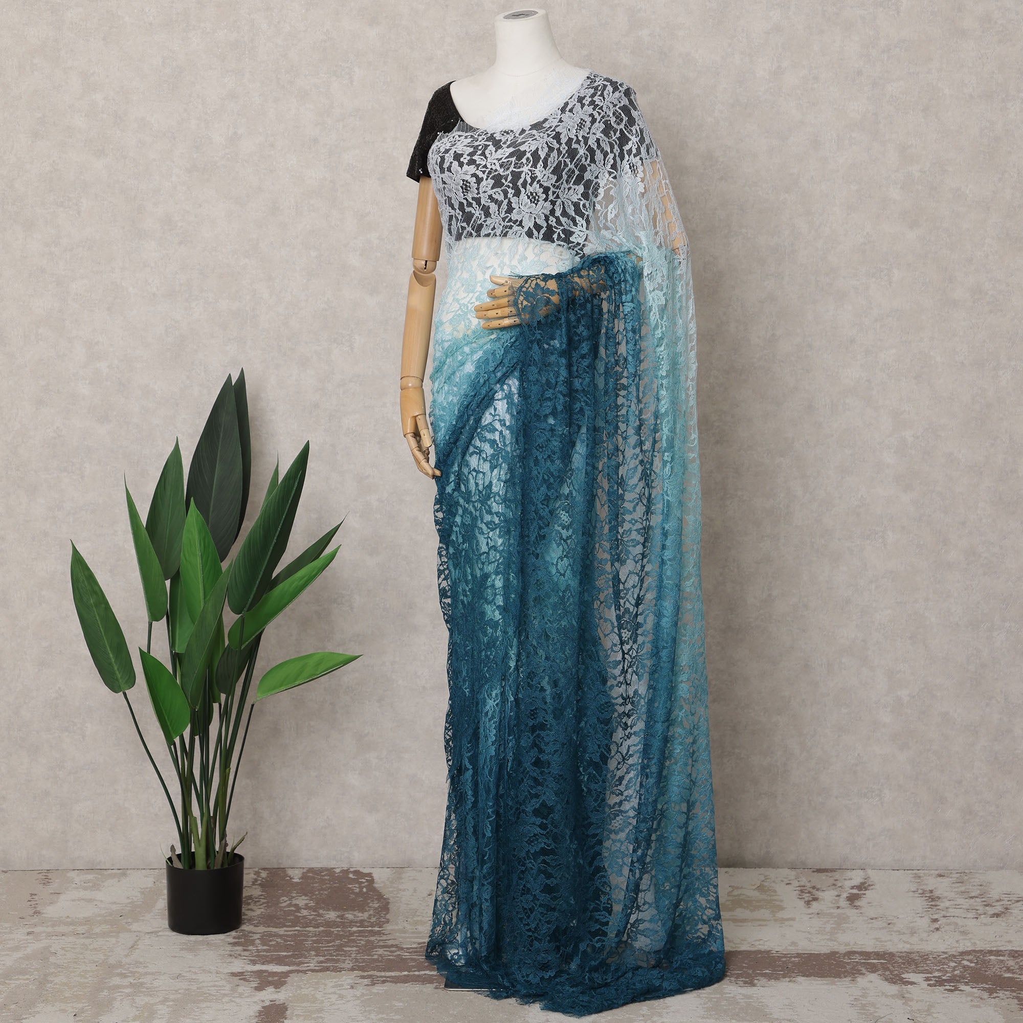 This stunning teal blue and aqua ombre French Chantilly lace fabric features a captivating gradient that transitions seamlessly from soft aqua to rich teal blue. Its intricate floral design and luxurious texture make it perfect for sarees, evening gowns, and premium designer wear. Crafted from high-quality Chantilly lace, this lightweight and durable fabric offers an elegant finish for any creation. Measuring 5.5 meters in length and 110 cm in width, it provides ample material for versatile designs. Please note, the blouse piece is not included in this listing.