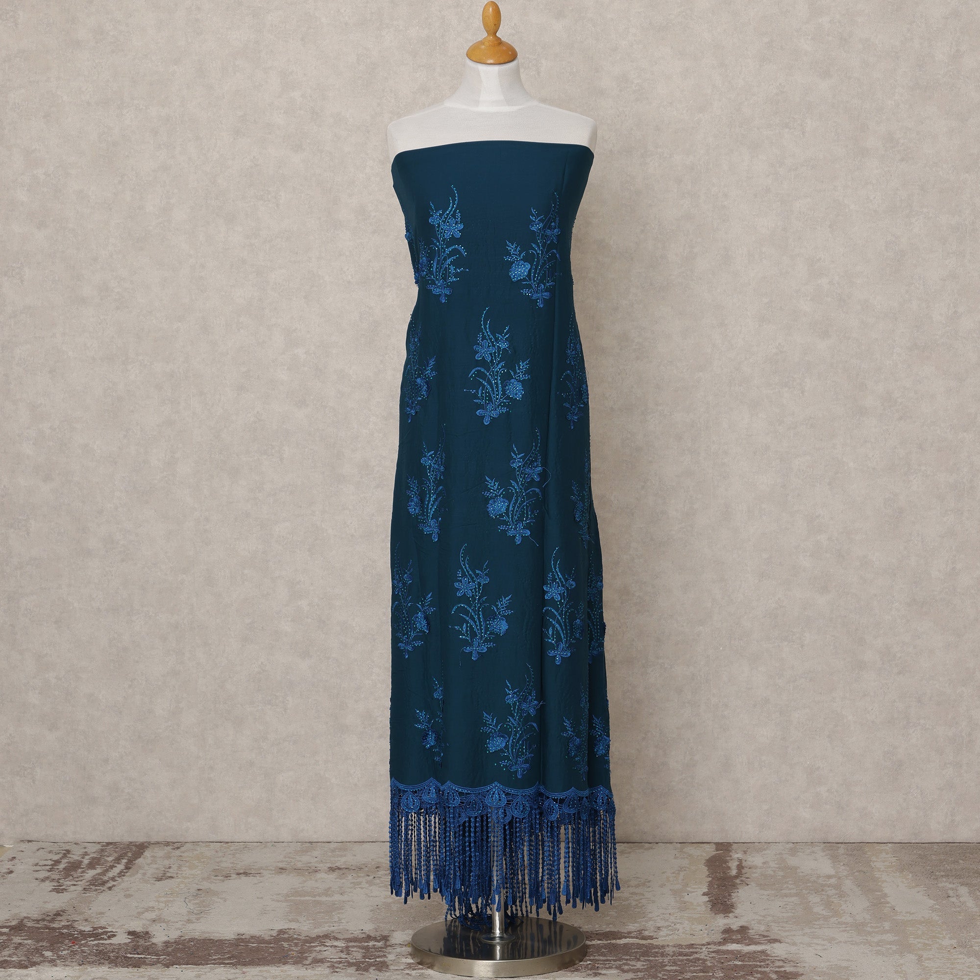 • Sale -75% Teal Blue Blended Cotton Fabric with Royal Blue Floral Thread Embroidery and Tassel Lace Border, 130 Cms Width, 3.0 Mtrs Length, Made in India-D24152