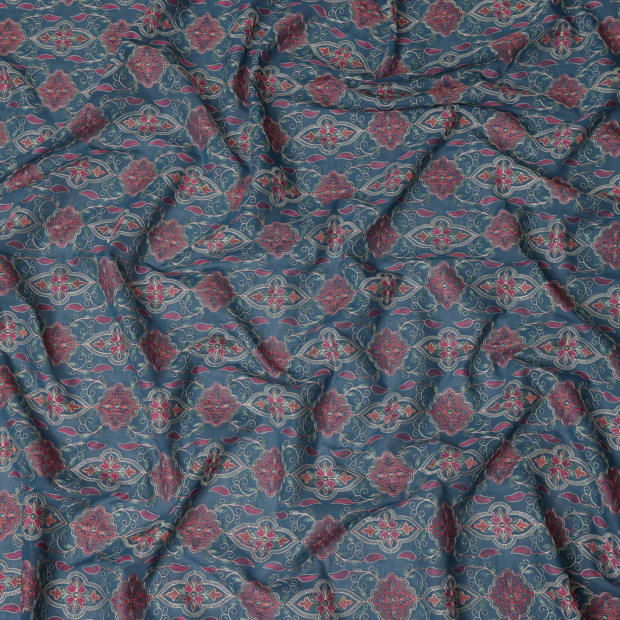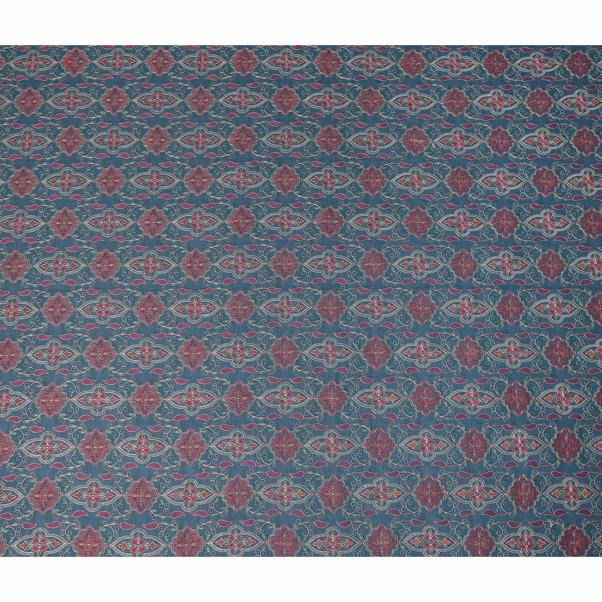 This teal blue geometric floral embroidered cotton voile fabric beautifully blends traditional ornamental design with lightweight breathable comfort, making it a distinctive choice for elegant garments and creative sewing projects. The rich teal blue base is adorned with repeating embroidered geometric floral motifs and decorative ornamental elements in shades of red, pink, and subtle beige, forming a visually balanced ethnic inspired pattern across the fabric. Crafted from soft cotton voile, the material offers a smooth hand feel, airy structure, and graceful drape that allows garments to flow naturally while remaining comfortable throughout the day. The fine embroidery adds decorative depth and texture without making the fabric heavy, preserving the light and breathable qualities of cotton voile. With a width of 110 cms, this versatile fabric is perfect for dresses, kurtas, tunics, blouses, skirts, scarves, and boutique fashion creations, offering designers and sewing enthusiasts a fabric that combines cultural elegance, comfort, and intricate embroidered artistry.
