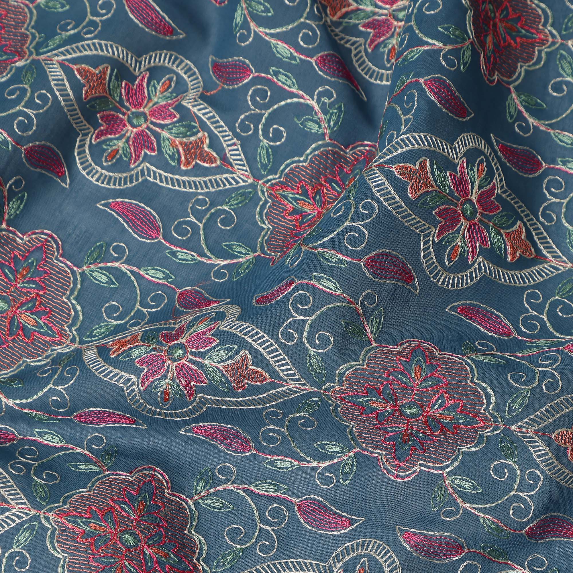 Teal Blue Geometric Floral Embroidered Cotton Voile Fabric Ethnic Ornamental Motif Embroidery Soft Lightweight Breathable Dressmaking Sewing Fabric 110 Cms Width Made In India-D28412