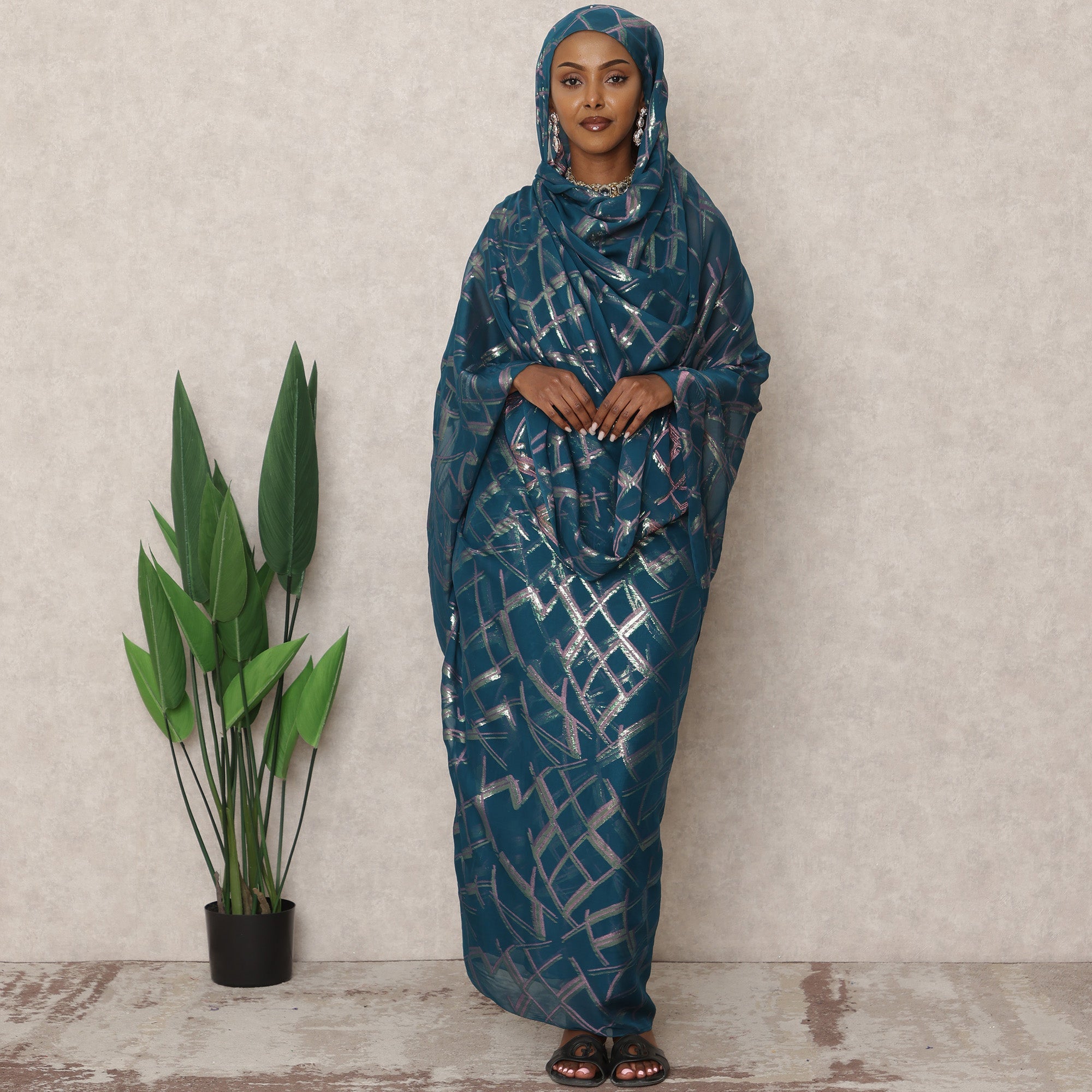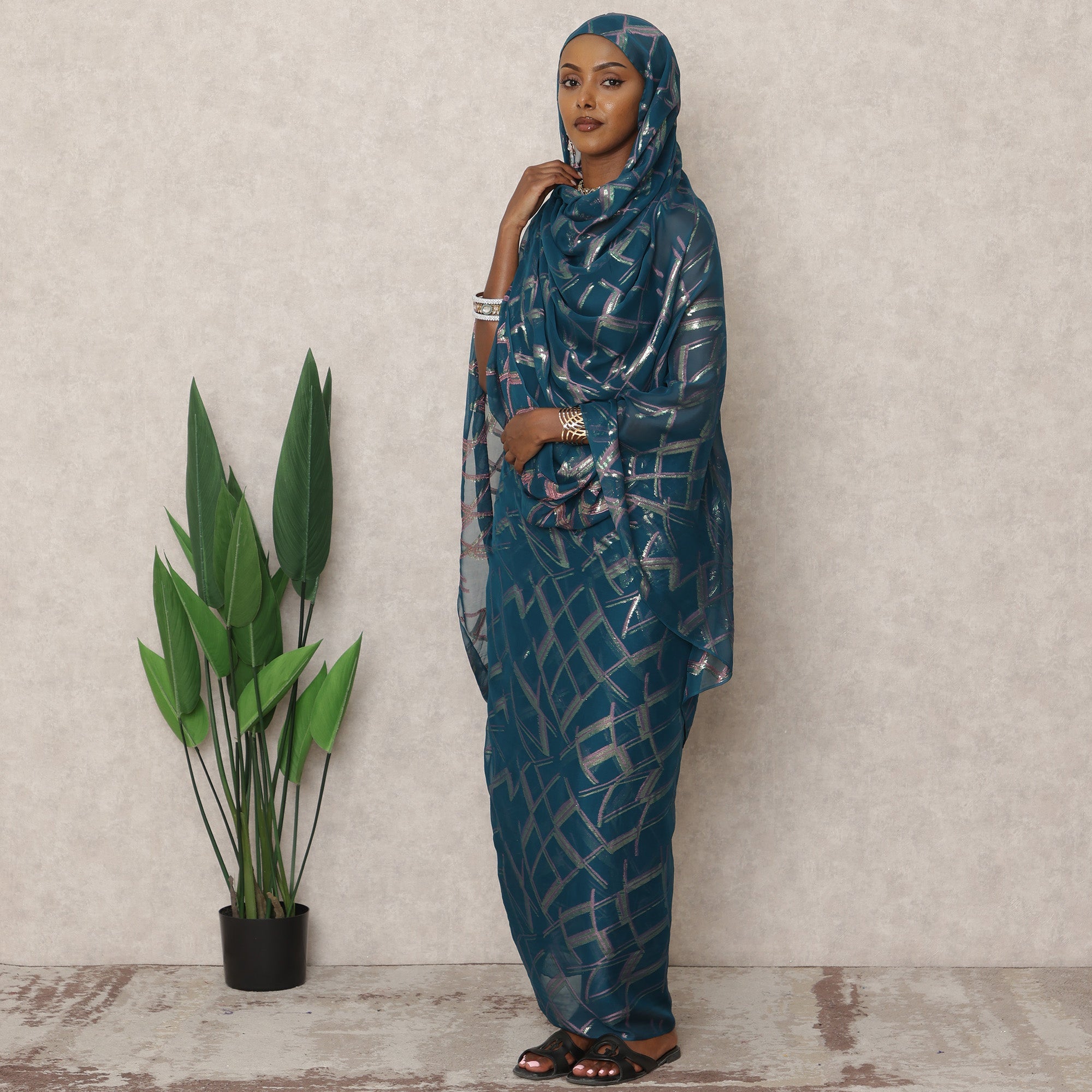Immerse yourself in luxury with this teal blue premium Sudanese thobe, crafted from pure Korean silk chiffon and artistically enriched with shimmering metallic lurex in abstract criss-cross patterns that reflect light elegantly. This 4.5-meter masterpiece offers an ethereal drape and fluidity, ideal for graceful movement and all-day comfort, while the cool blue tone adds sophistication and versatility for both day and evening wear. Meticulously designed in South Korea, this ensemble captures the perfect balance of traditional elegance and modern design for those who seek to shop online for refined cultural attire.