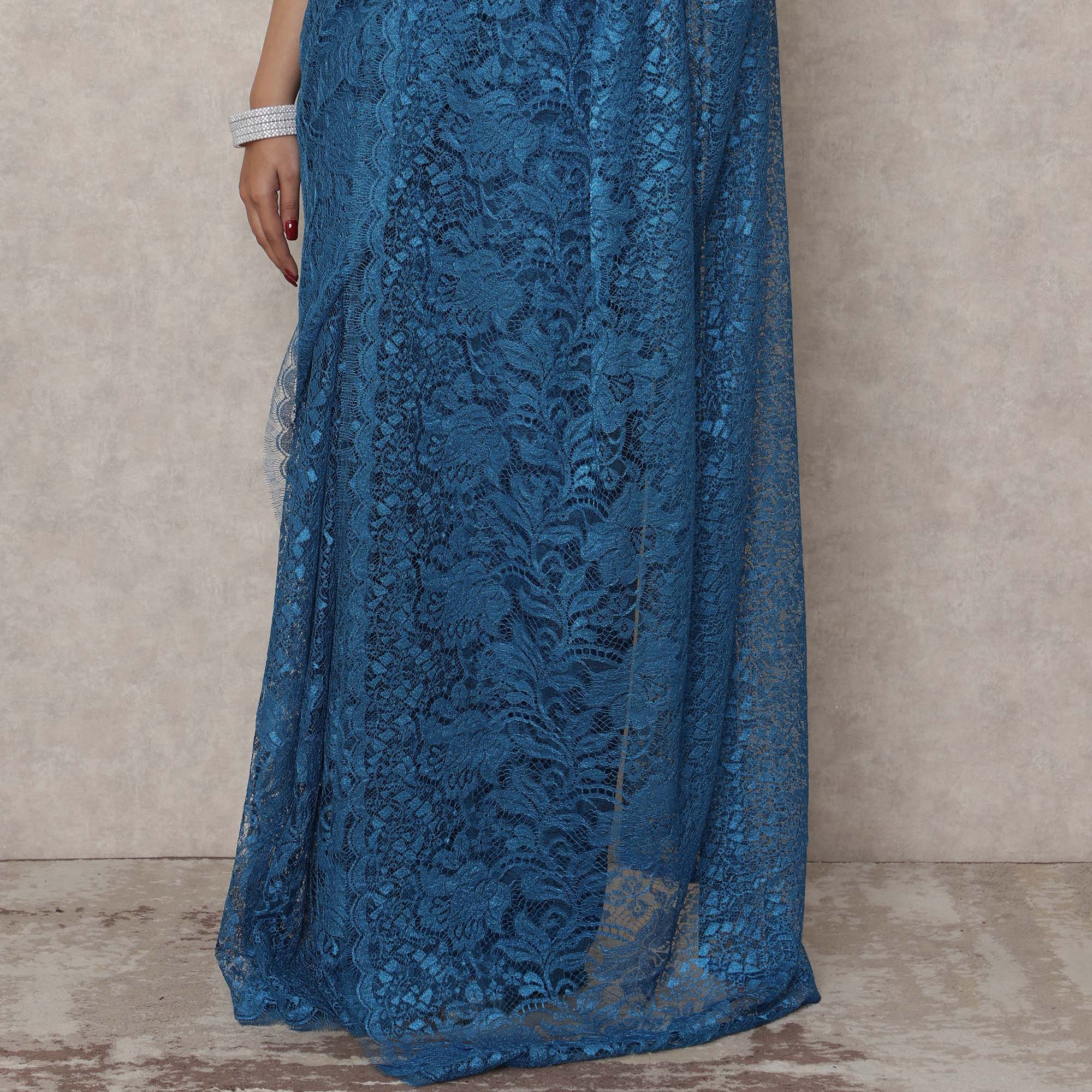 Elevate your ethnic wardrobe with the mesmerizing elegance of this Teal Blue Premium French Metallic Chantilly saree lace, crafted in France and spanning an opulent 5.5 meters in length with a width of 110 cms. The rich teal blue hue, paired with intricate floral Chantilly lacework and subtle metallic sheen, offers a stunning balance of grace and grandeur. Ideal for festive occasions, cocktail evenings, and weddings, this saree drapes beautifully while reflecting premium craftsmanship and timeless design. The lightweight lace ensures a breathable, fluid silhouette, perfect for all-day celebrations. With its exquisite texture and refined shimmer, this saree is a standout addition to your ethnic wear collection. Blouse not included. Shop online now and embrace French couture finesse in every drape.