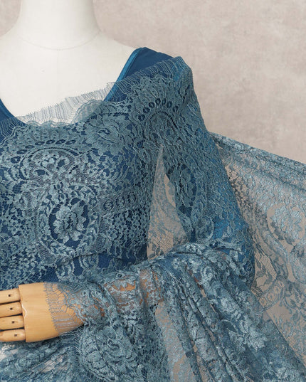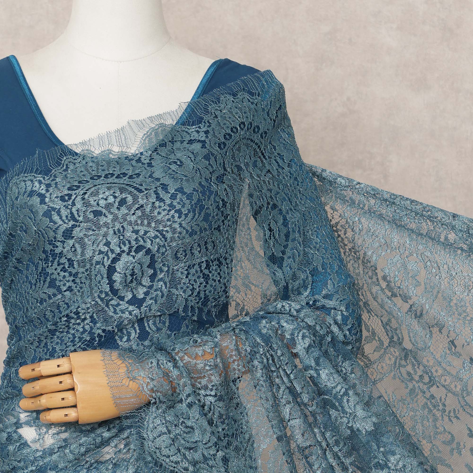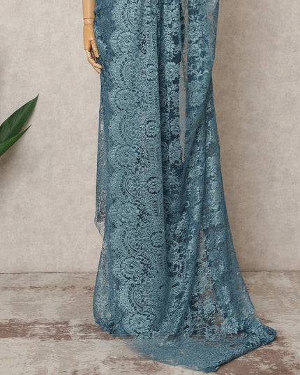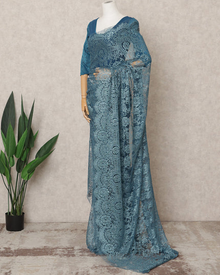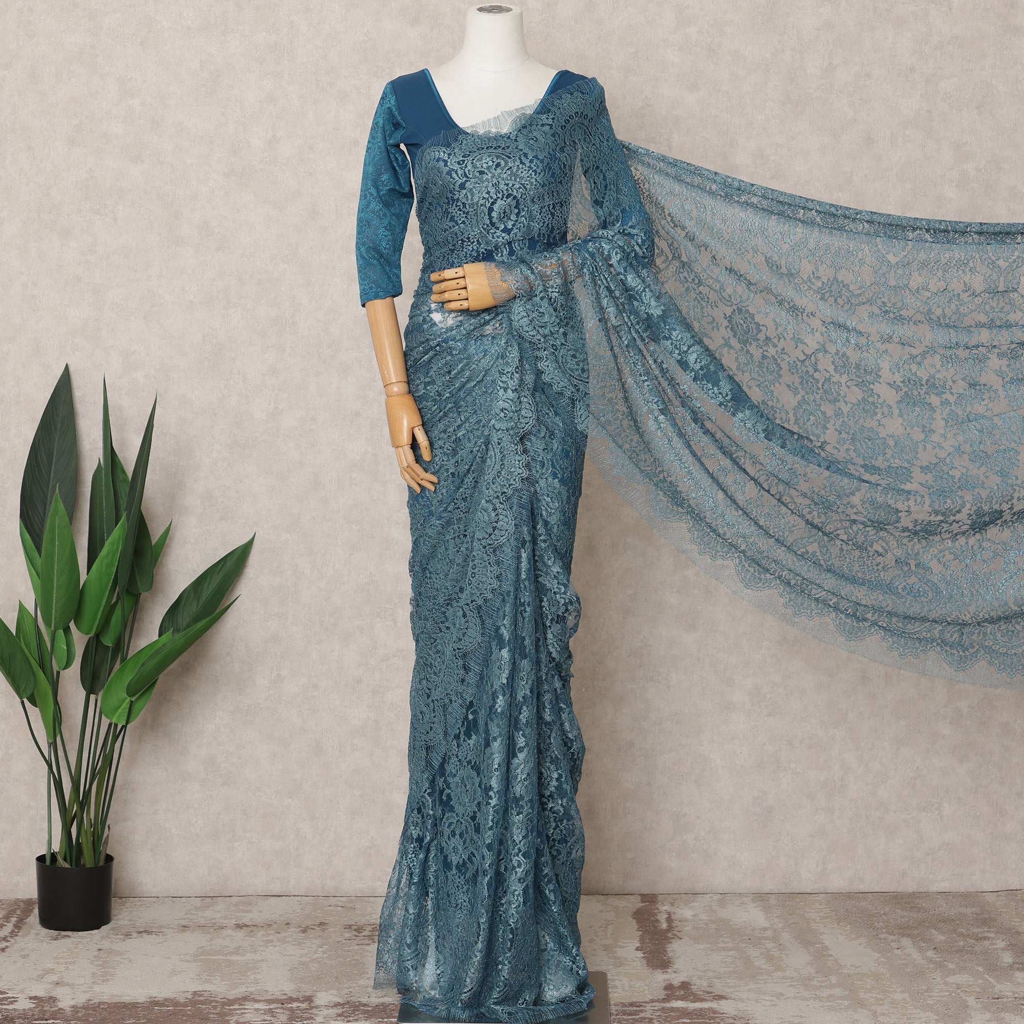 Teal Blue Premium Metallic Chantilly Lace Saree Fabric, 5.5 Meters Length, 110 Cms Width, Made in France-D23893