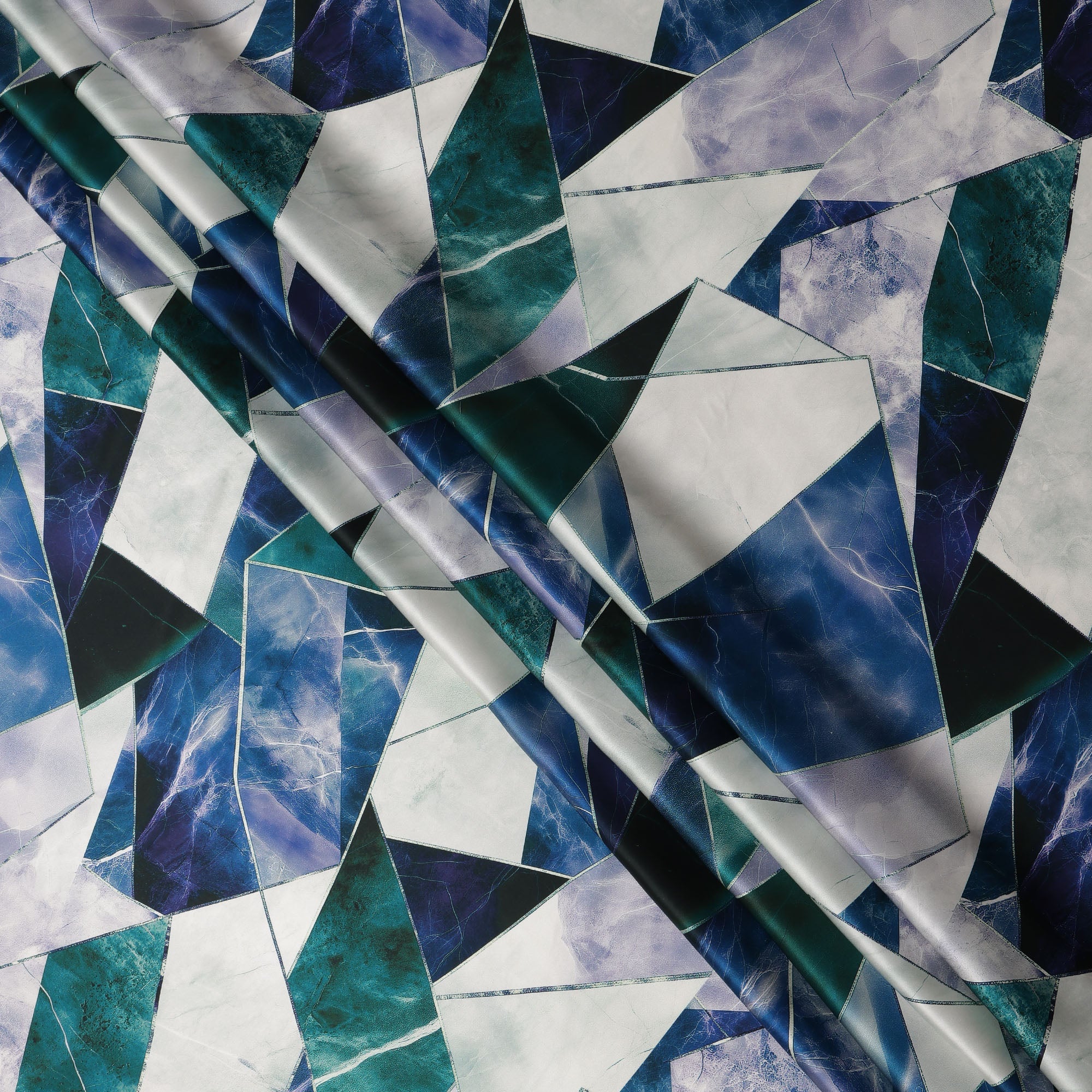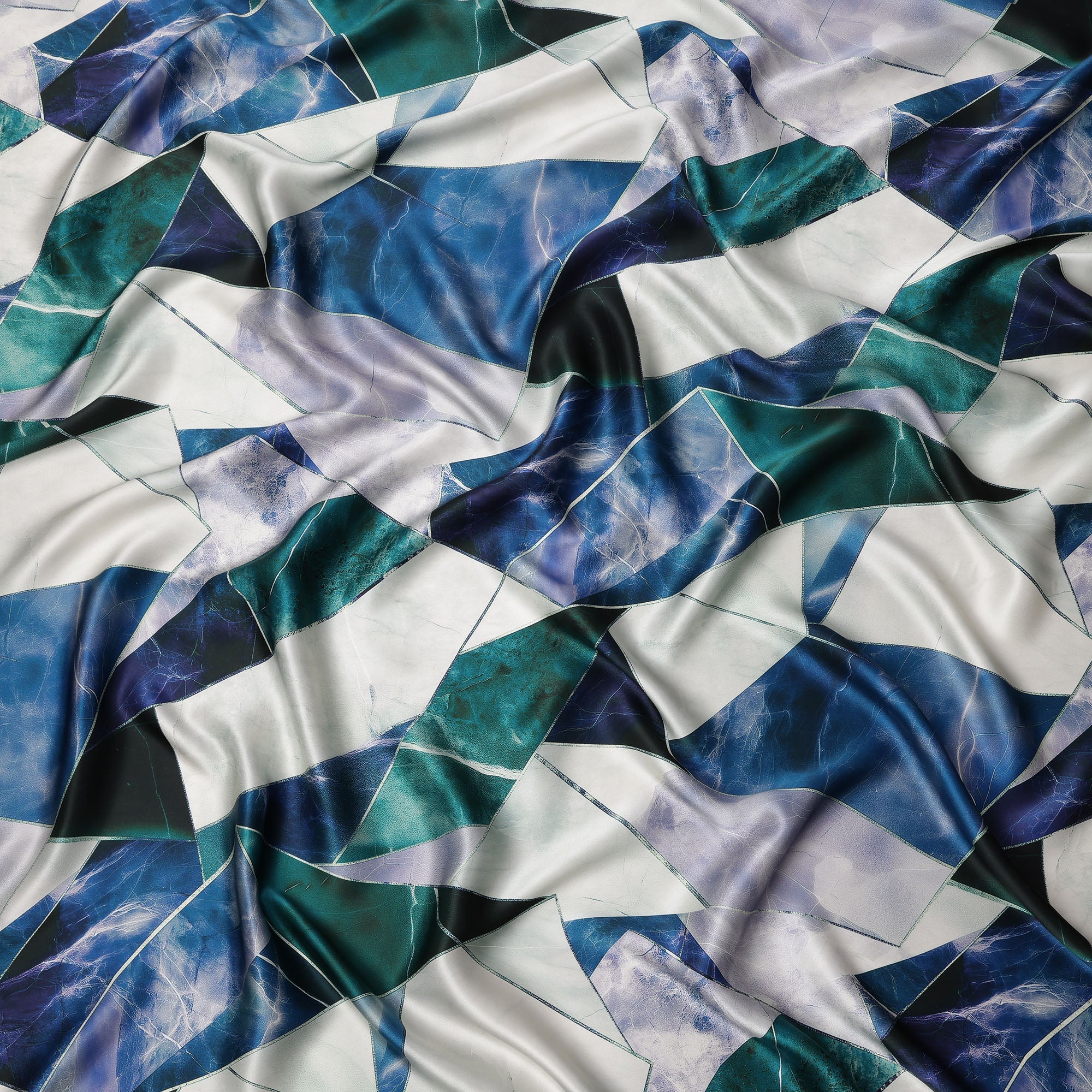 Teal Blue White Abstract Geometric Printed Premium Pure Silk Satin Fabric Smooth Lustrous Designer Finish 140 Cms Width, 3.5 Mtrs Piece and Made in Italy-D27196