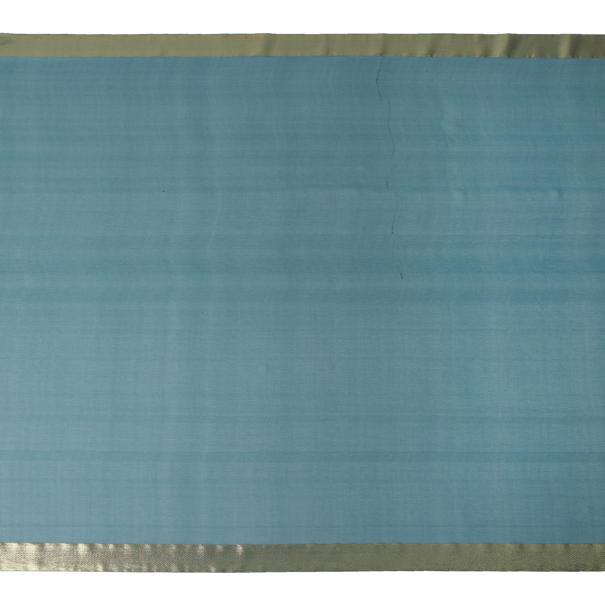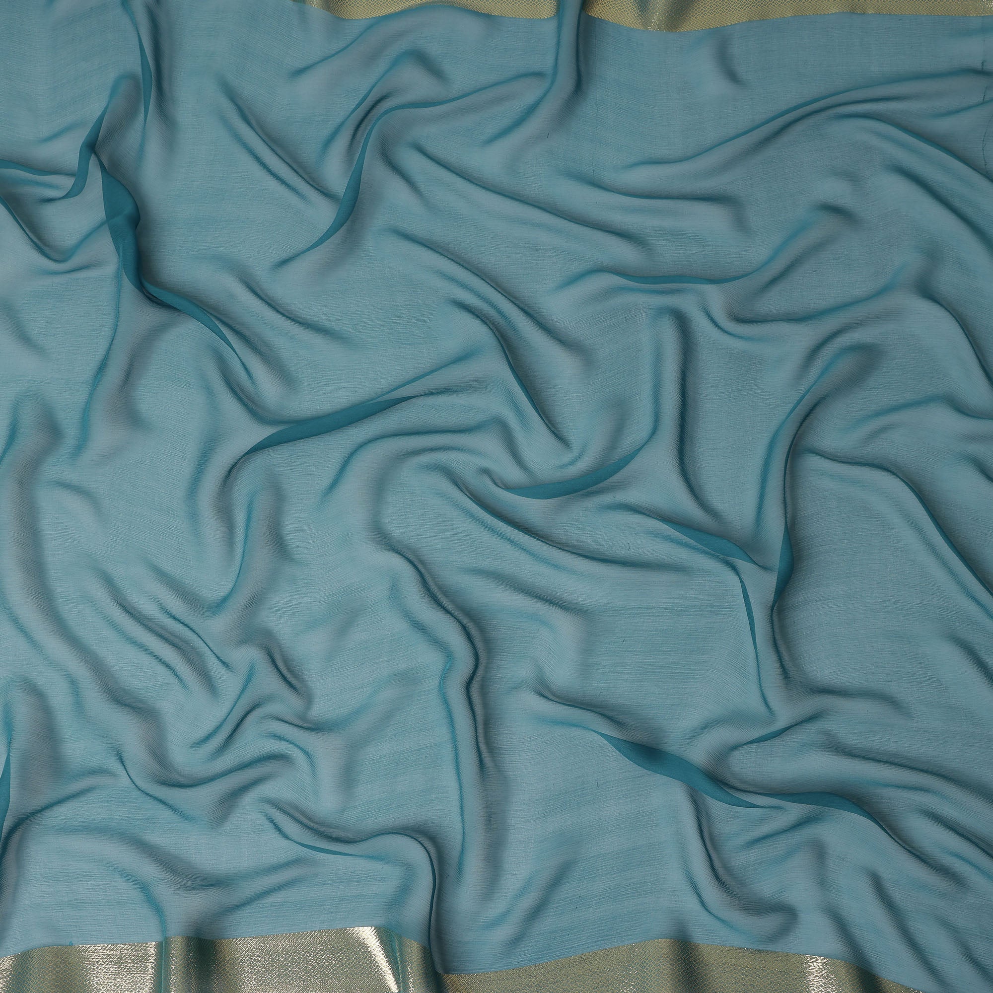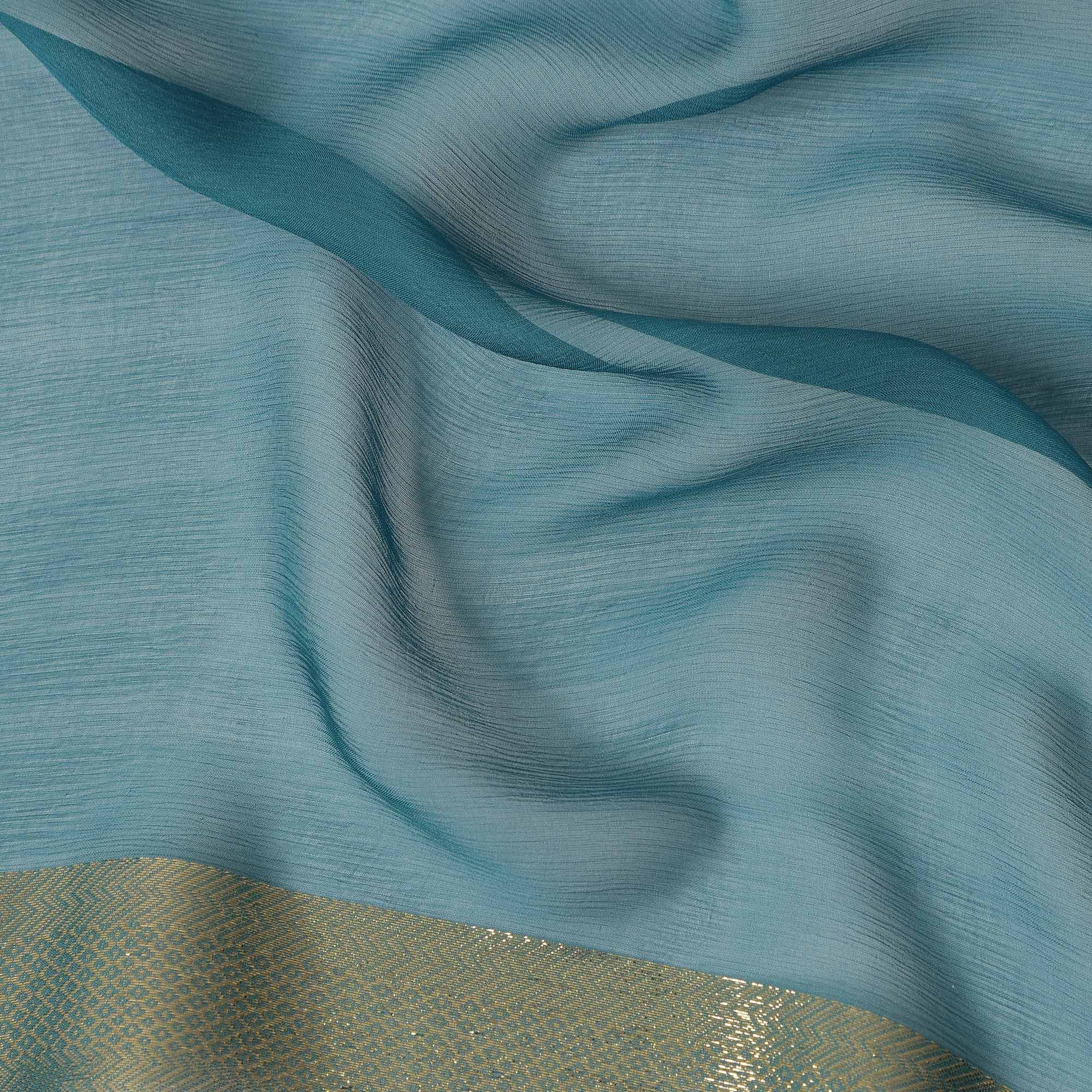 Teal Blue Wrinkle Silk Chiffon Fabric with Golden Border Stripe Lightweight Sheer Textured Fabric for Sarees Dresses Dupattas and Crafts 110 Cms Wide South Korea Origin-D27663