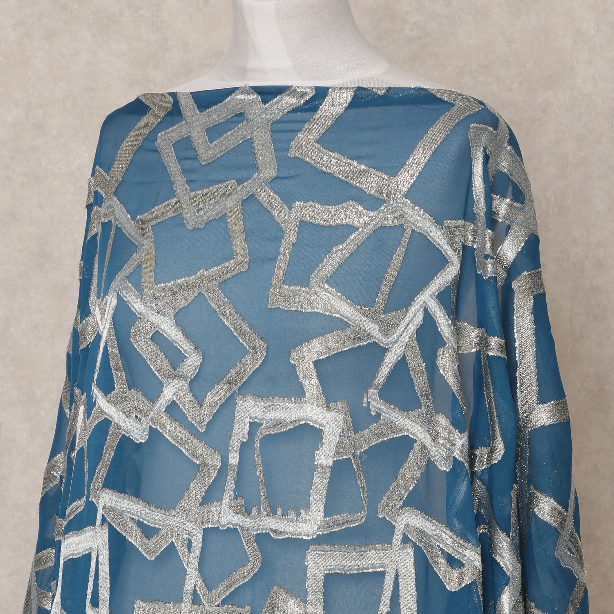 This teal Somali silk chiffon dirac fabric showcases a bold geometric metallic lurex pattern that adds a striking modern edge... Read more Read more