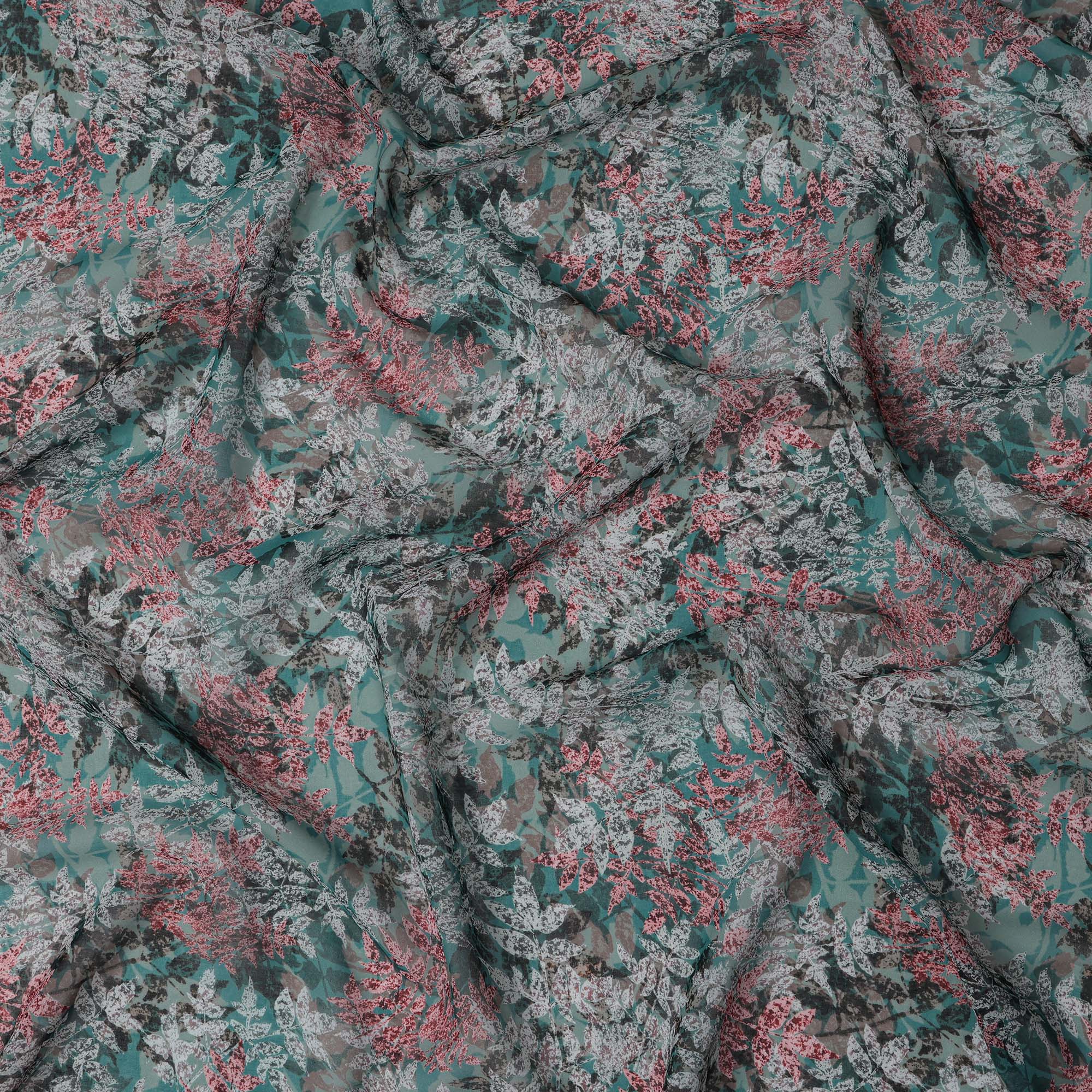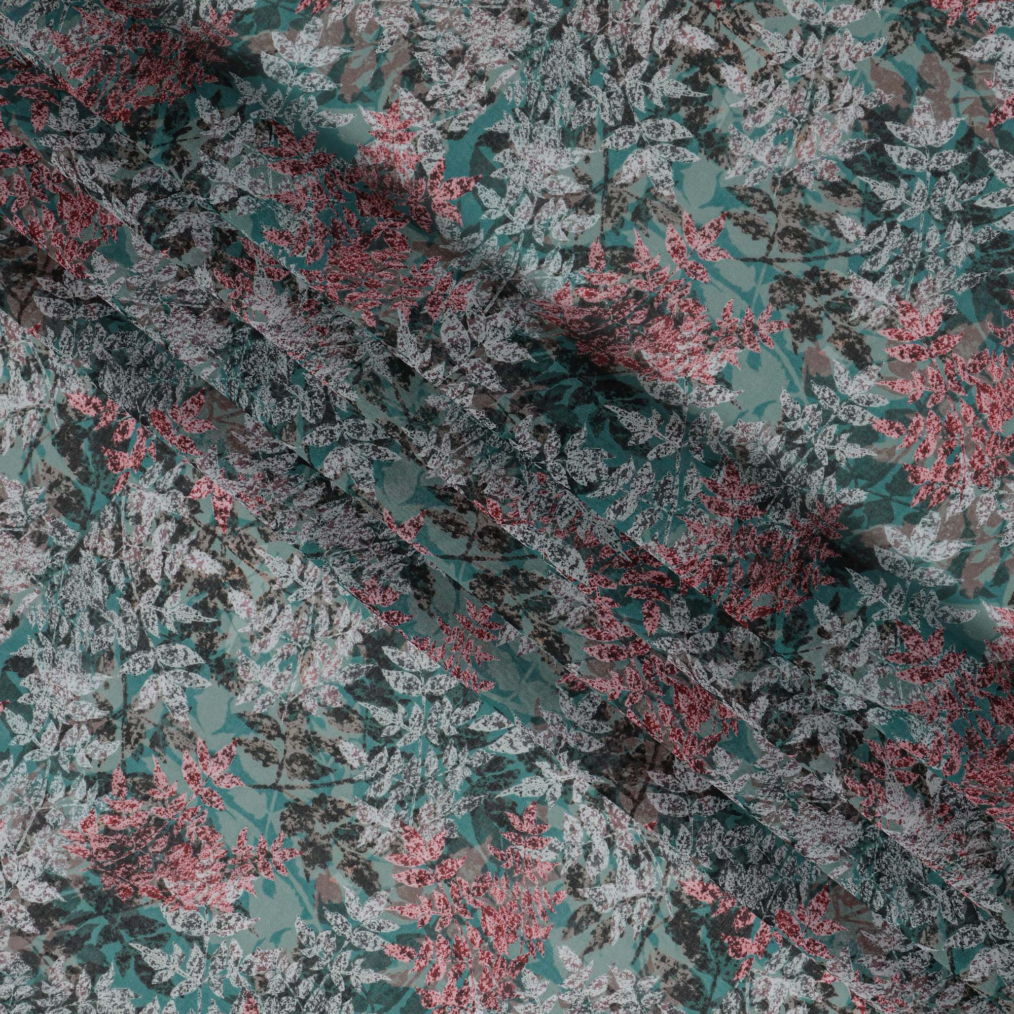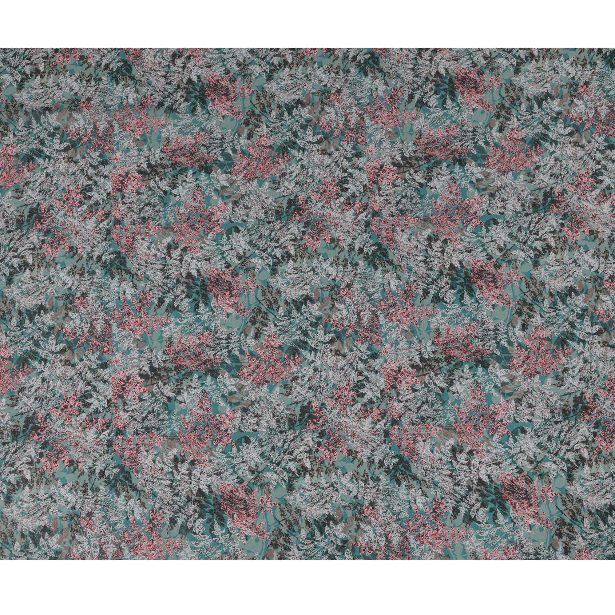 Teal green base with detailed coral, grey, and ivory leaf patterns.