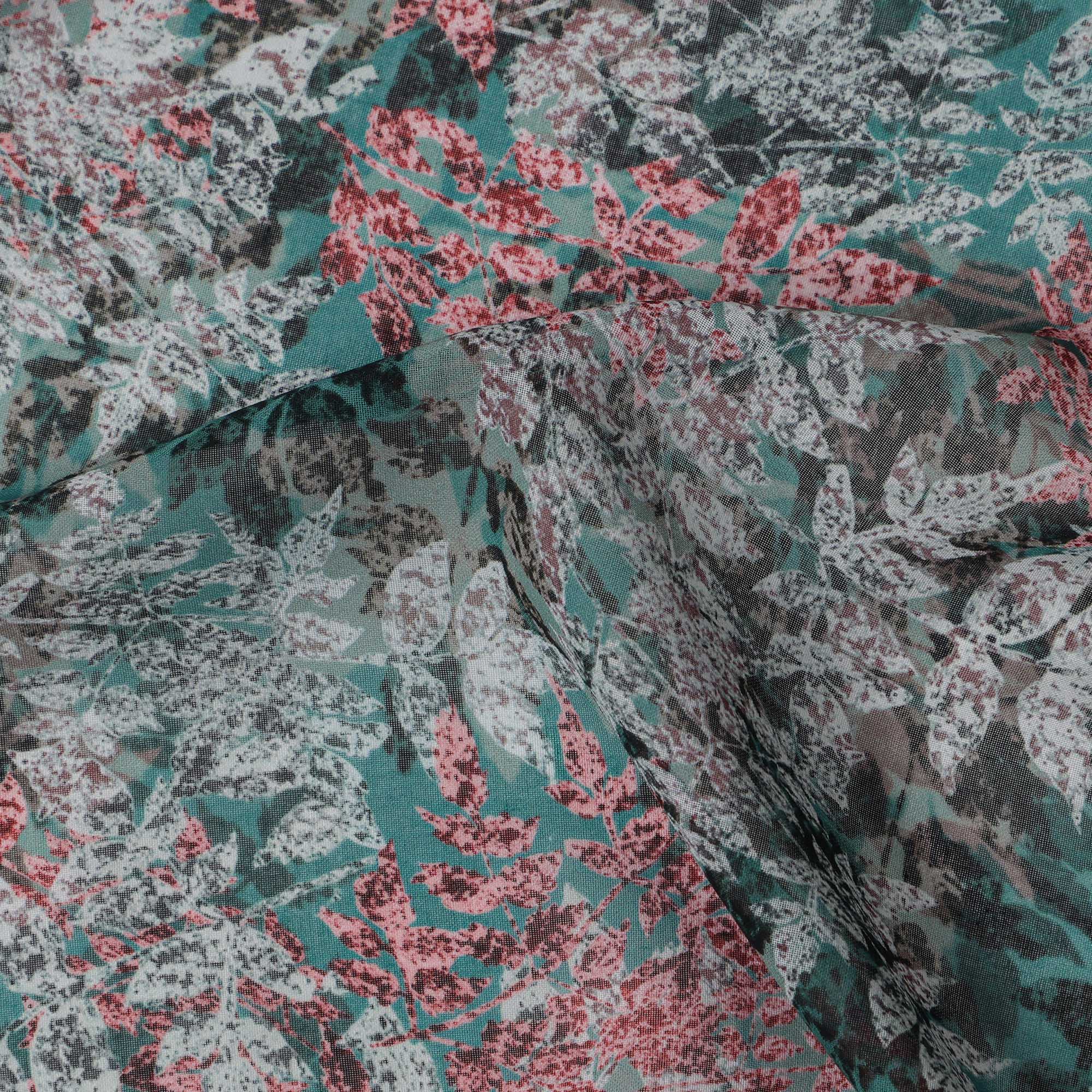 Teal Green and Coral Leaf Print Traditional Sudanese Thobe in Pure Cotton Voile Fabric, 4.5 Meters Length, Width 140 cm – Made in India-D23132