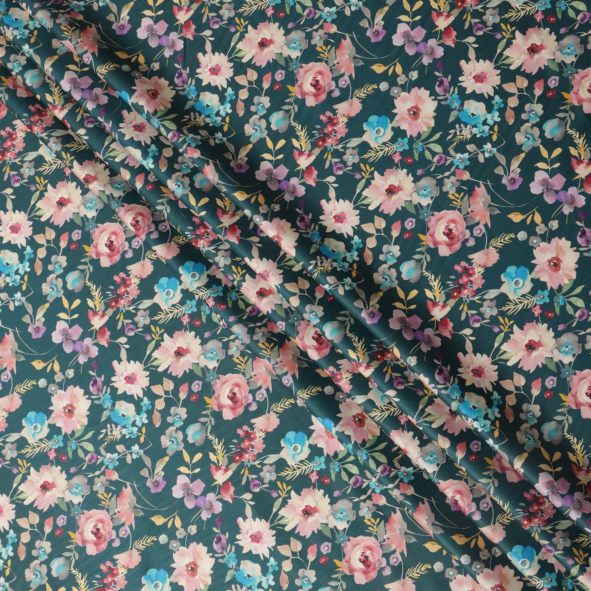 Premium Teal Green Multicolor Floral Print Pure Cotton Satin Fabric with glossy finish