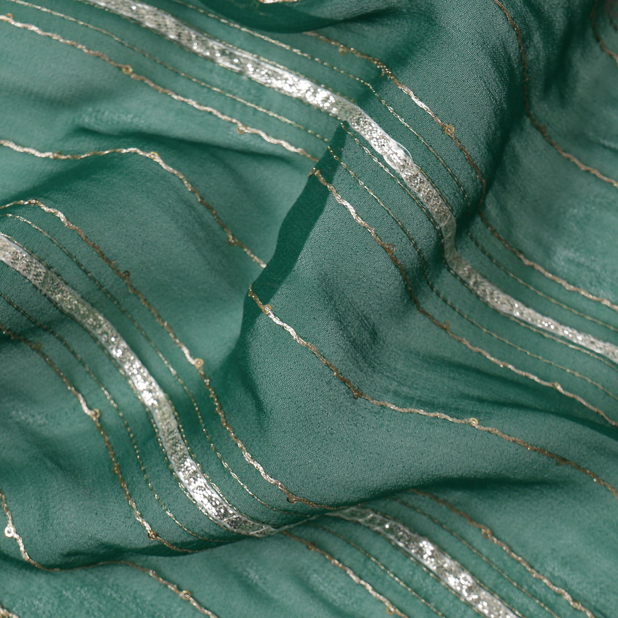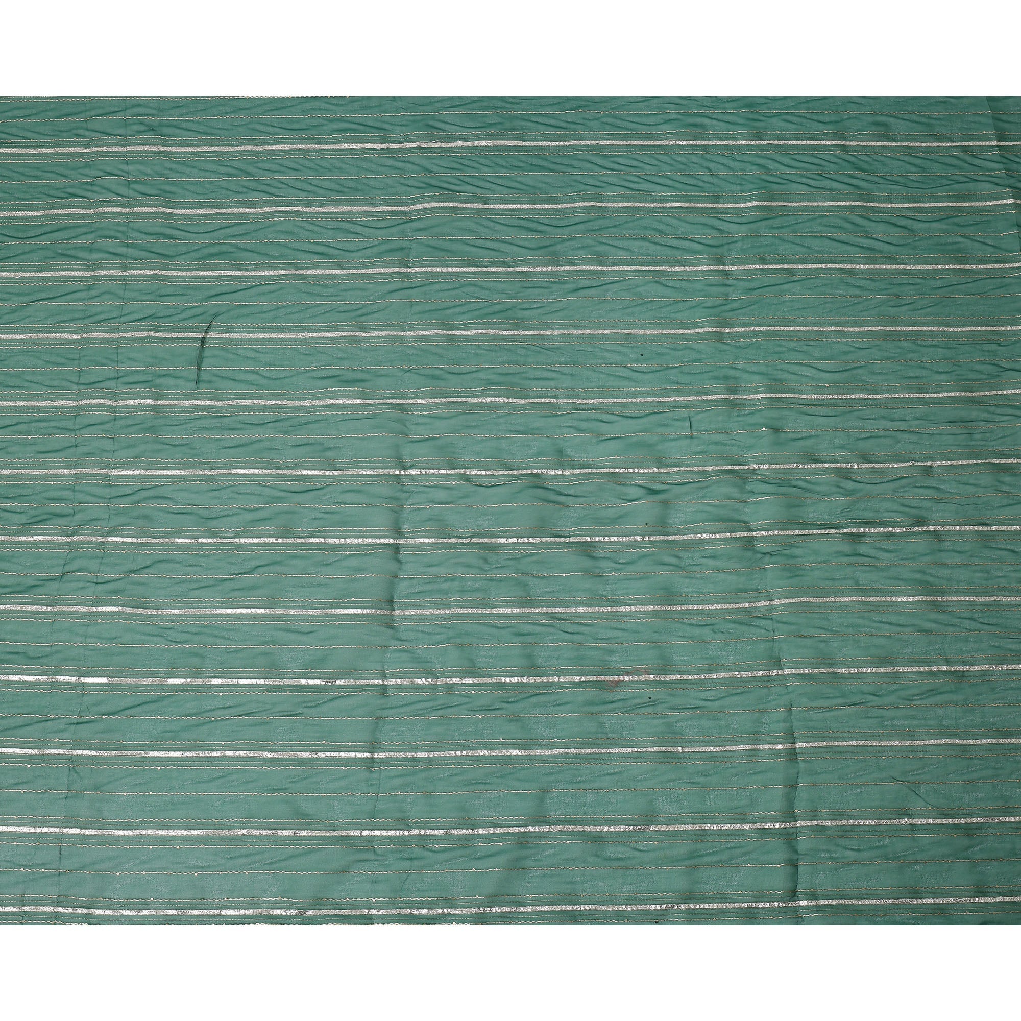 Teal Green Silver Zari Striped Synthetic Georgette Chiffon Fabric, 110 Cms Width, Made in India-D26198