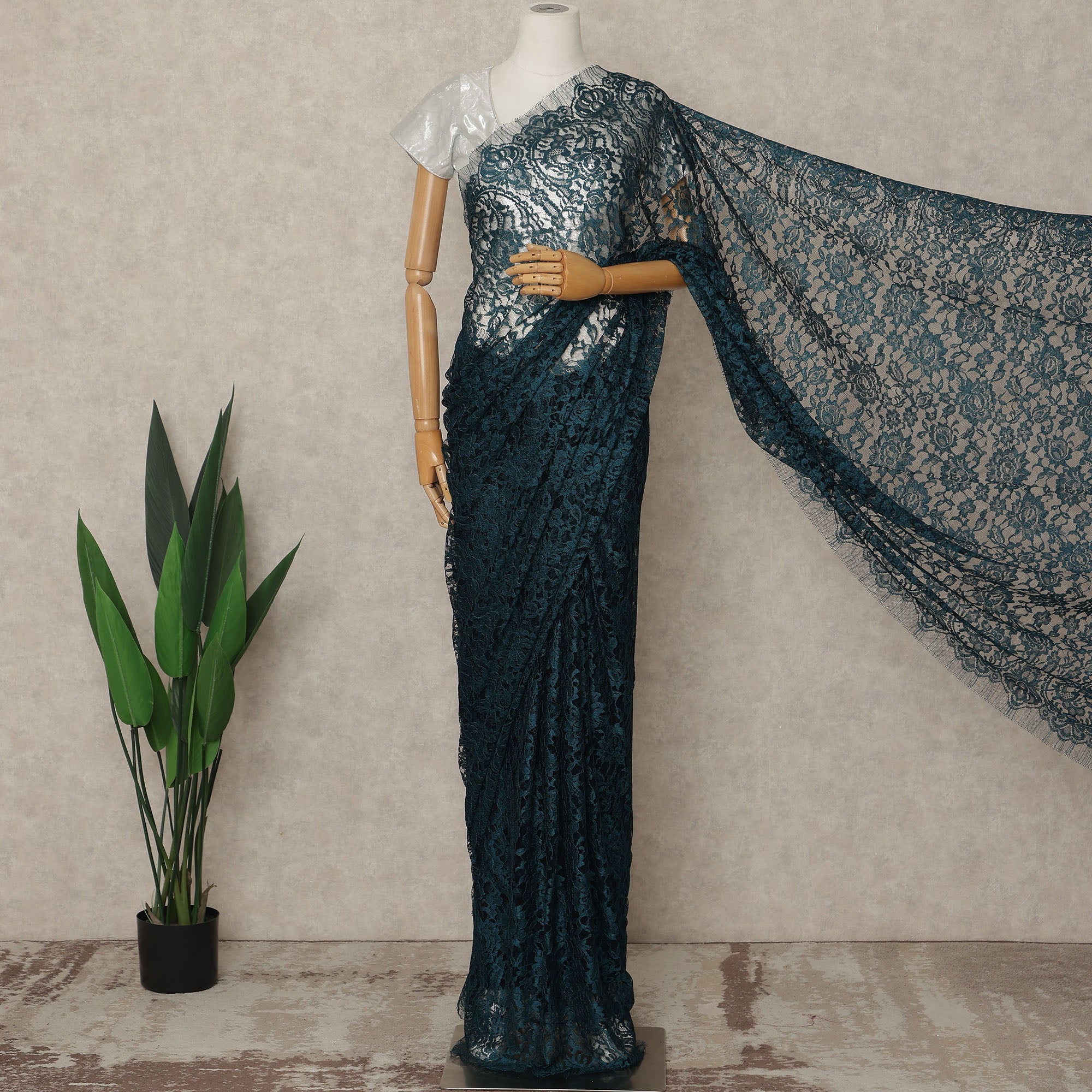 This Teal Premium French Chantilly Saree Lace showcases a rich, deep teal shade that beautifully complements the delicate floral lace patterns, creating a luxurious and ethereal drape ideal for weddings, receptions, festive celebrations, and high-fashion styling; crafted in France with authentic Chantilly weaving techniques, this approximately 5.5-meter saree offers a graceful fall and a lightweight, breathable texture that enhances comfort while maintaining an elegant silhouette, and its 110-cm width ensures versatile draping styles that elevate any ensemble; the intricate lace motifs, refined transparency, and luminous finish add a couture touch, making it a perfect choice for those looking to shop online for premium designer lace fabrics—blouse not included.
