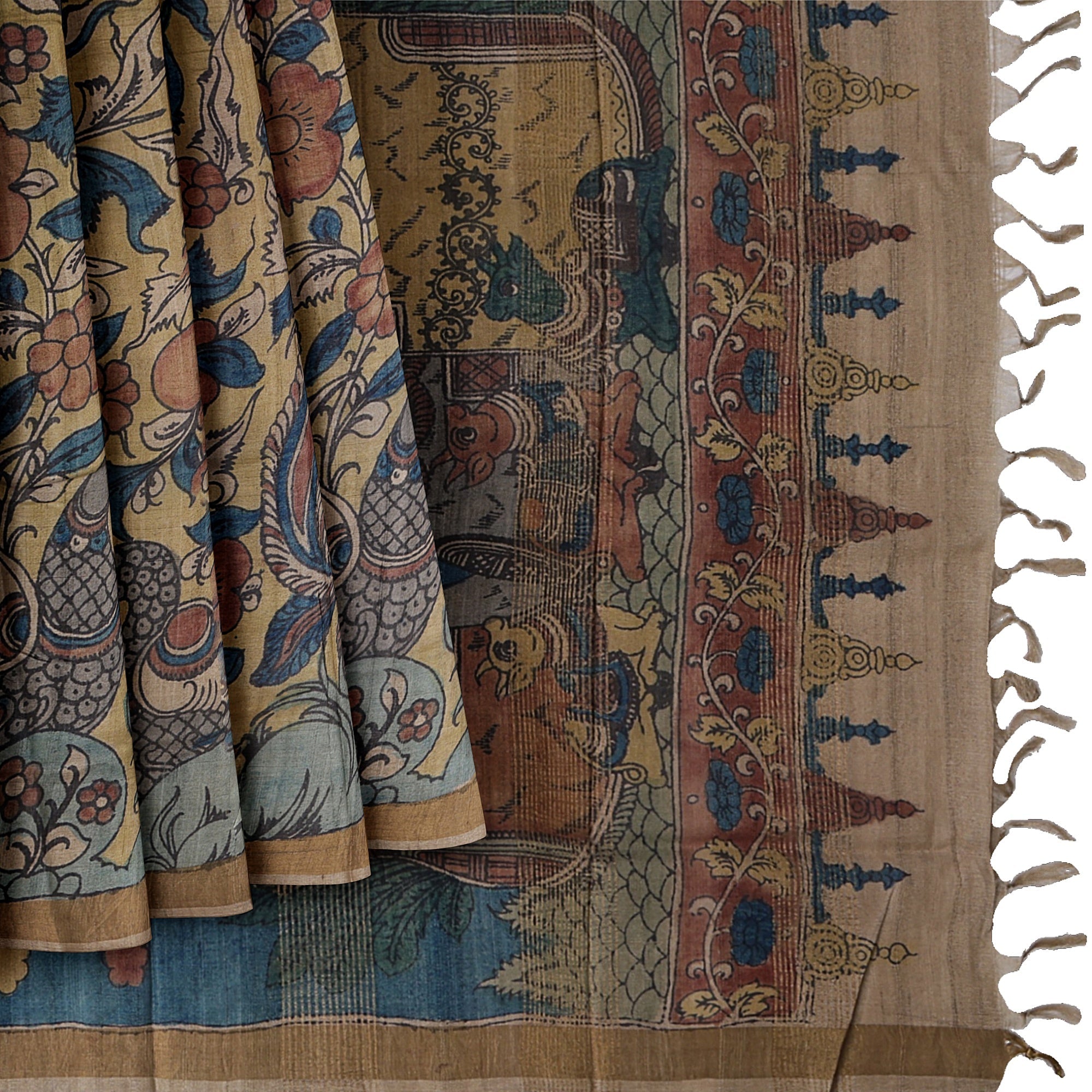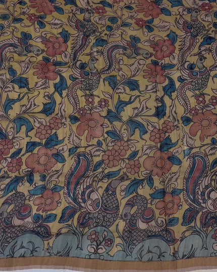 Terracotta Tussar Silk Pen Kalamkari Saree with Handpainted Mythological Art, Width 110 Cms, Origin: Sri Kalahasthi, India, 5.5 Mtrs with Blouse Piece-D22858