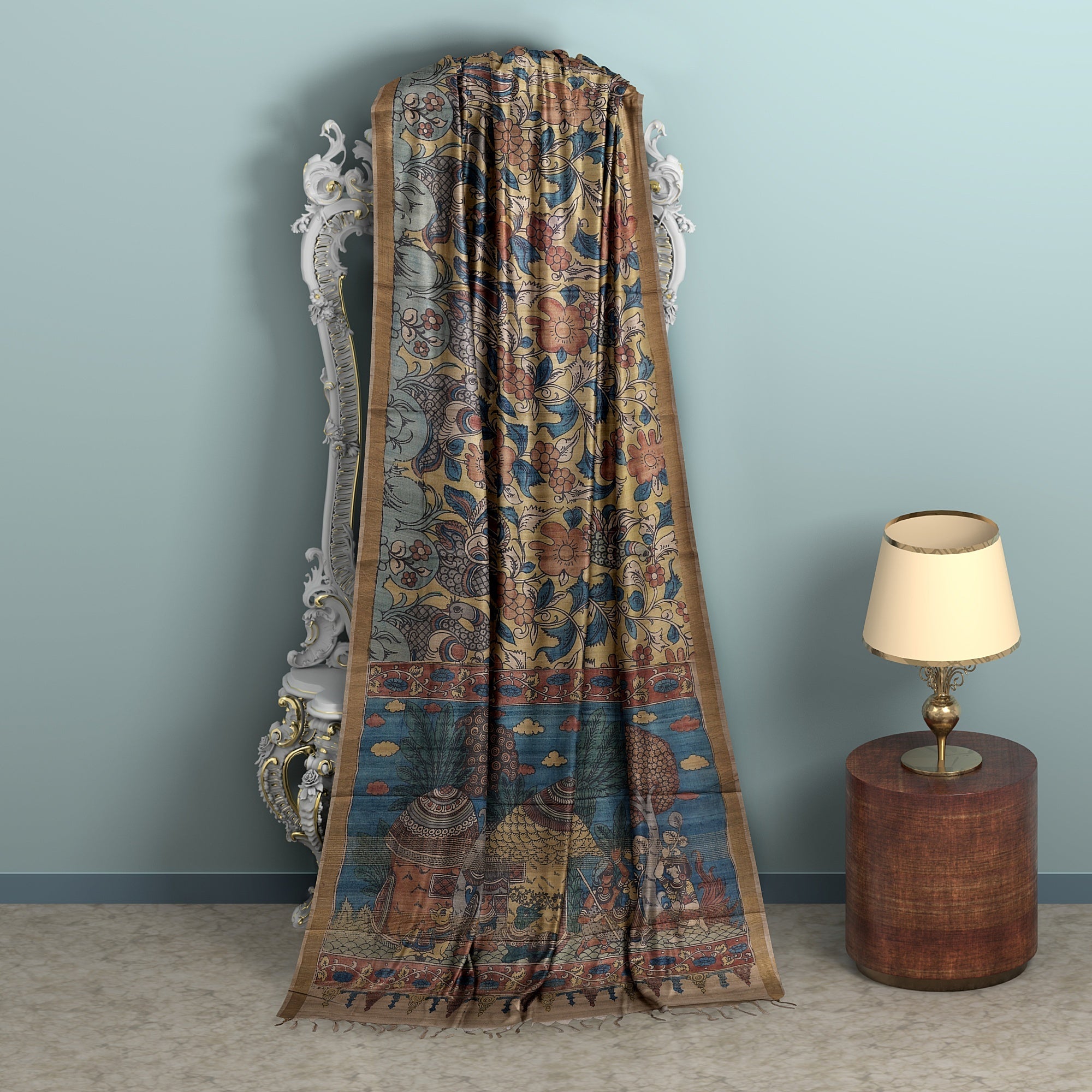 Features Pen Kalamkari handpainted artwork inspired by Indian mythology