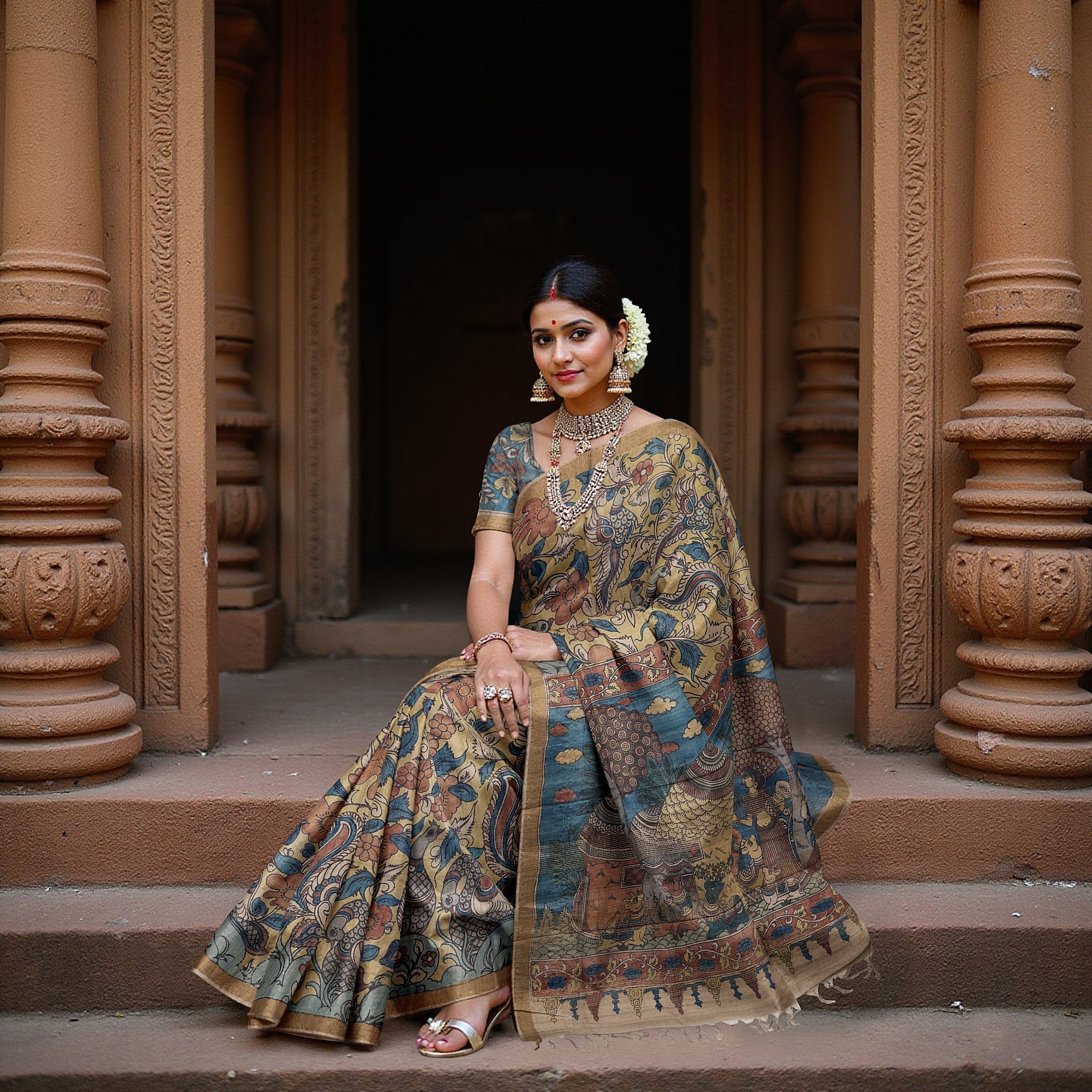 Woven on a warm terracotta Tussar silk base, this Pen Kalamkari saree is a tribute to India's mythological grandeur, hand-rendered by skilled artisans from Sri Kalahasthi. Each saree tells sacred stories through handpainted motifs—divine figures, cosmic elements, and intricate floral borders—crafted with bamboo pens and natural dyes. It takes 48 hours of patient, meticulous work to complete a single saree, making it an heirloom of heritage and devotion. The rustic terracotta hue offers a rich background for contrasting tones like indigo, charcoal, and mustard to come alive. With a 5.5-meter length and matching blouse piece, this drape is ideal for festive occasions and traditional gatherings. Shop online to wear a timeless piece of spiritual art.