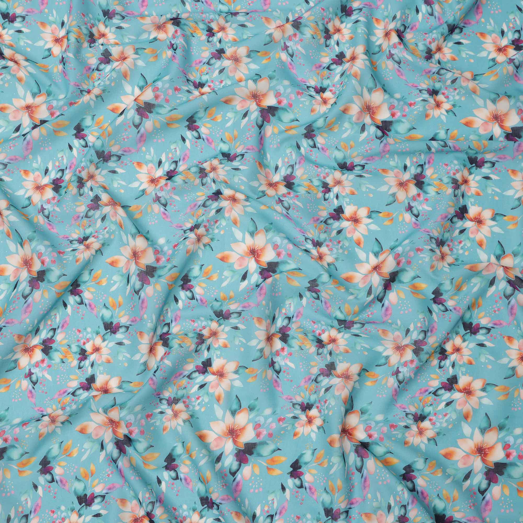 Turquoise Blue Base Peach Floral Digital Printed Cotton Lawn Fabric, 110 Cms Width, Made in India-D23637
