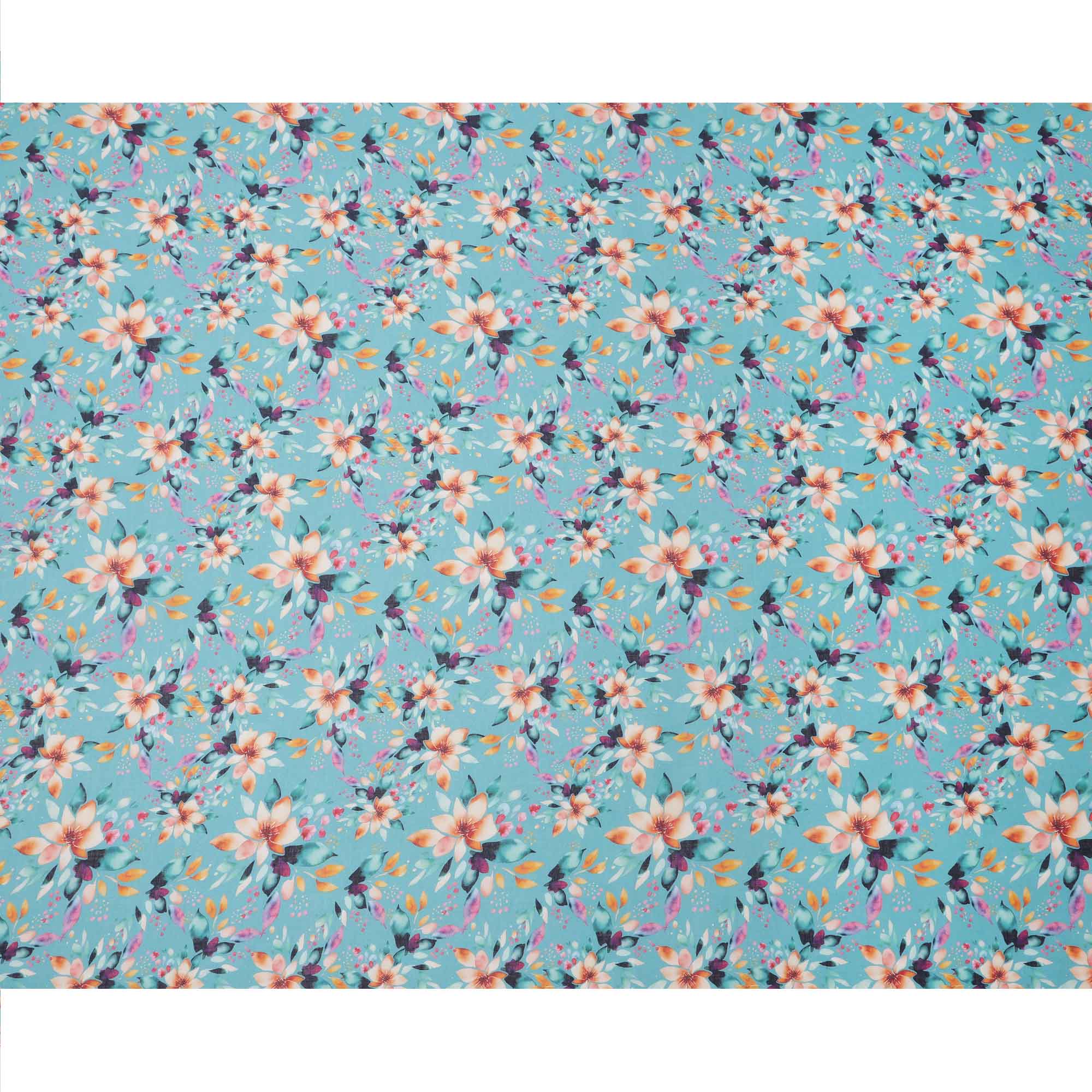 Turquoise blue base with digitally printed peach and cream floral motifs
