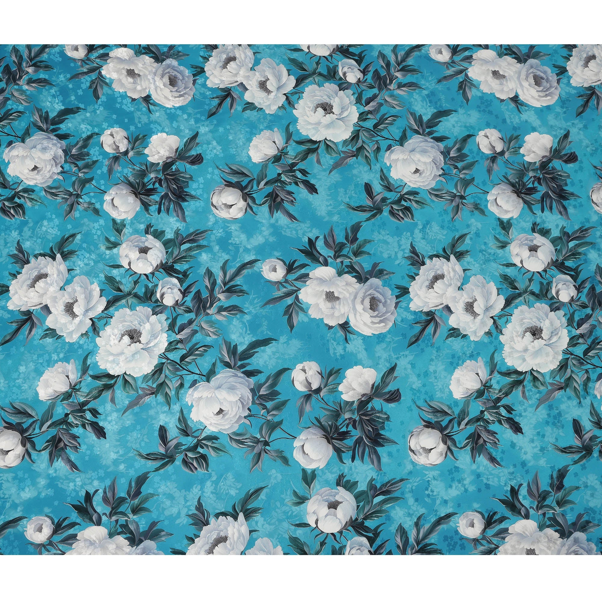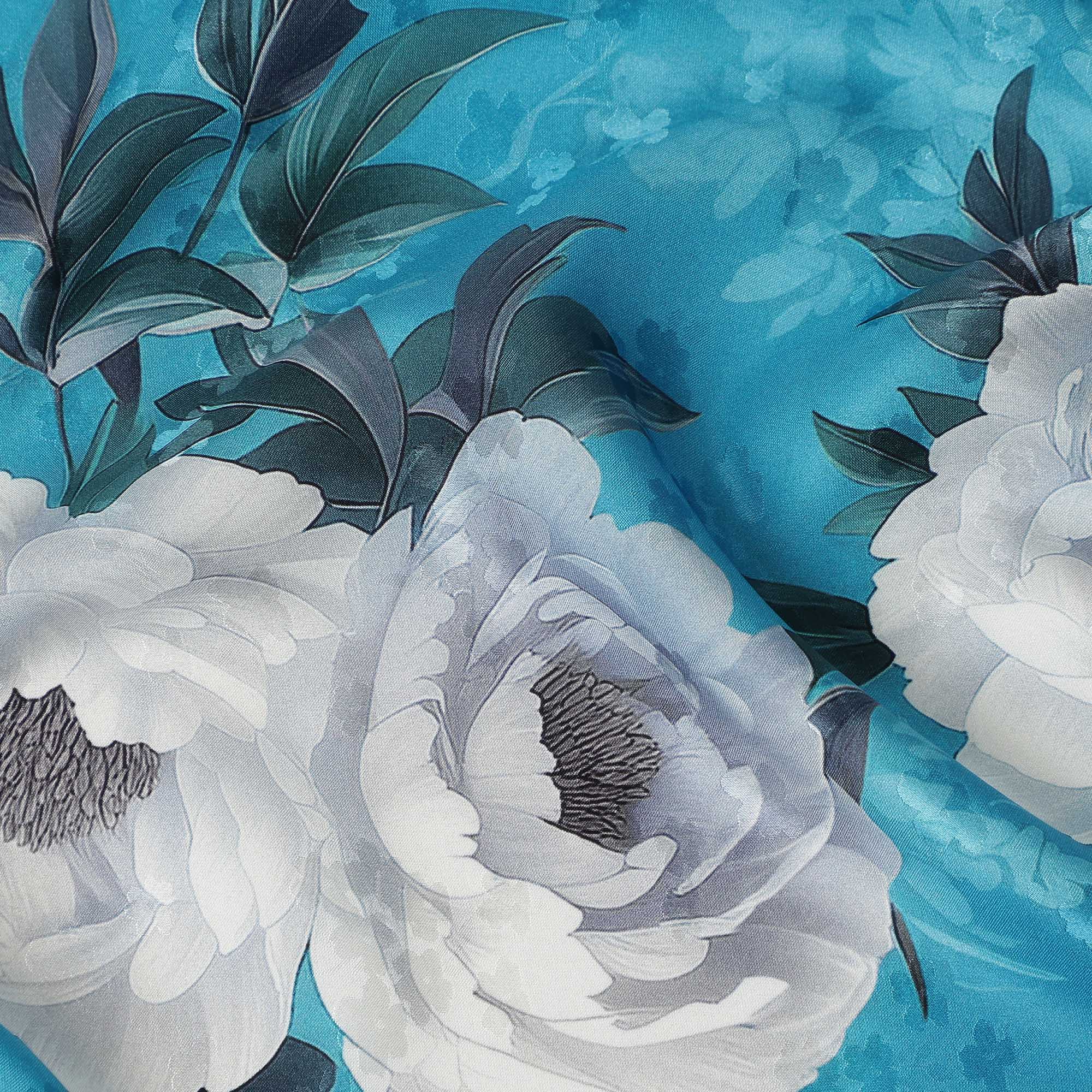 Turquoise Blue Floral Printed Premium Pure Silk Satin Fabric Soft Smooth Lustrous Designer Finish 140 Cms Width, 3.5 Mtrs Piece and Made in Italy-D27199