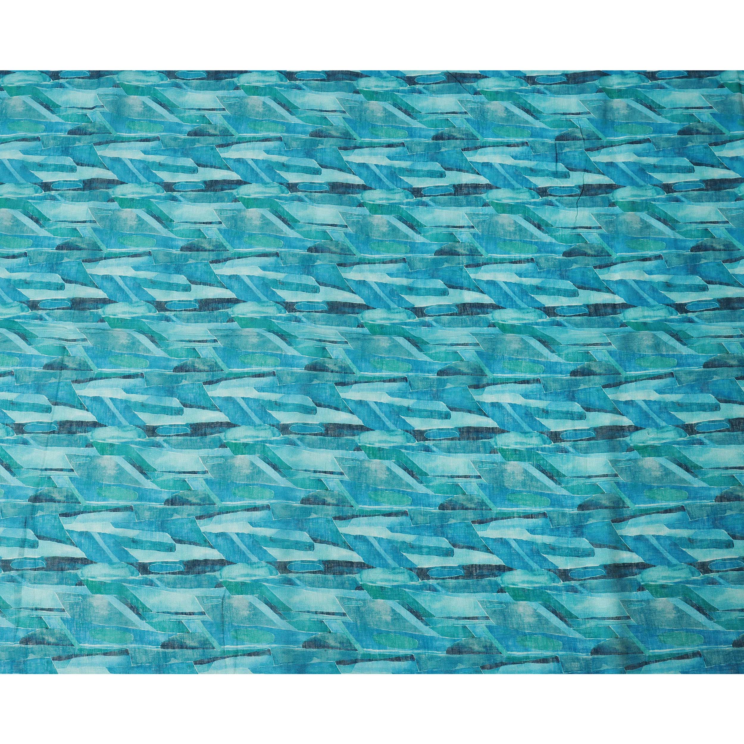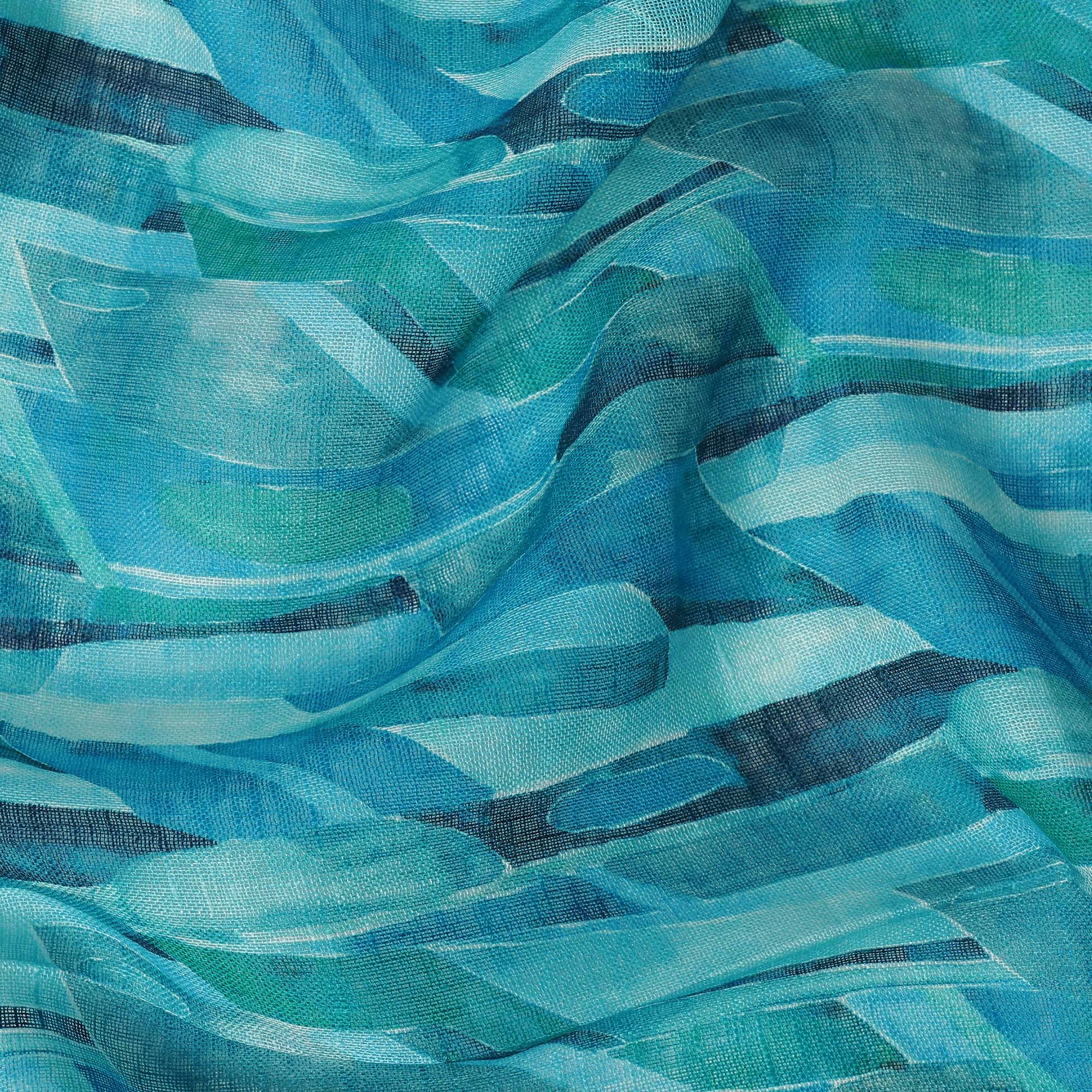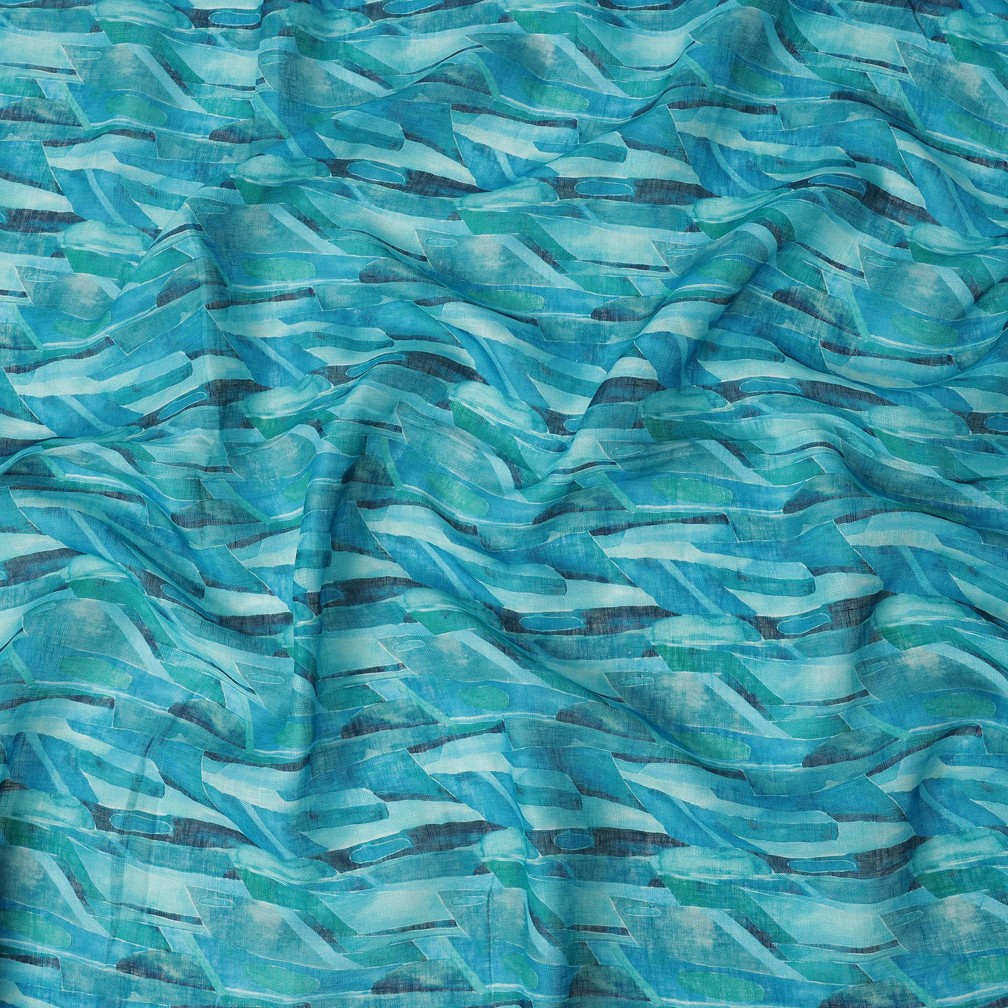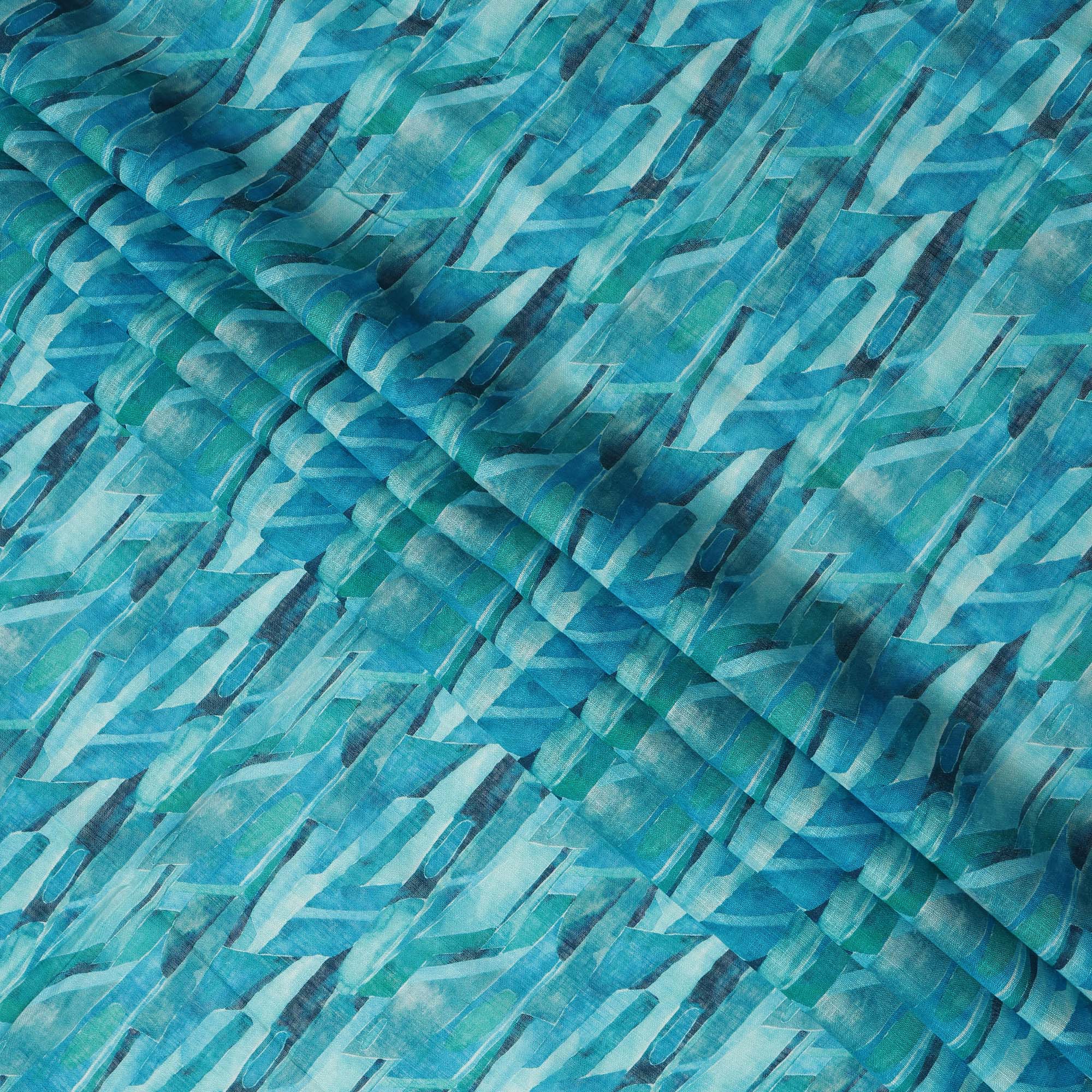 Turquoise Blue Green Abstract Brushstroke Print Blended Linen Fabric, 110 Cms Width, Made in India-D26188