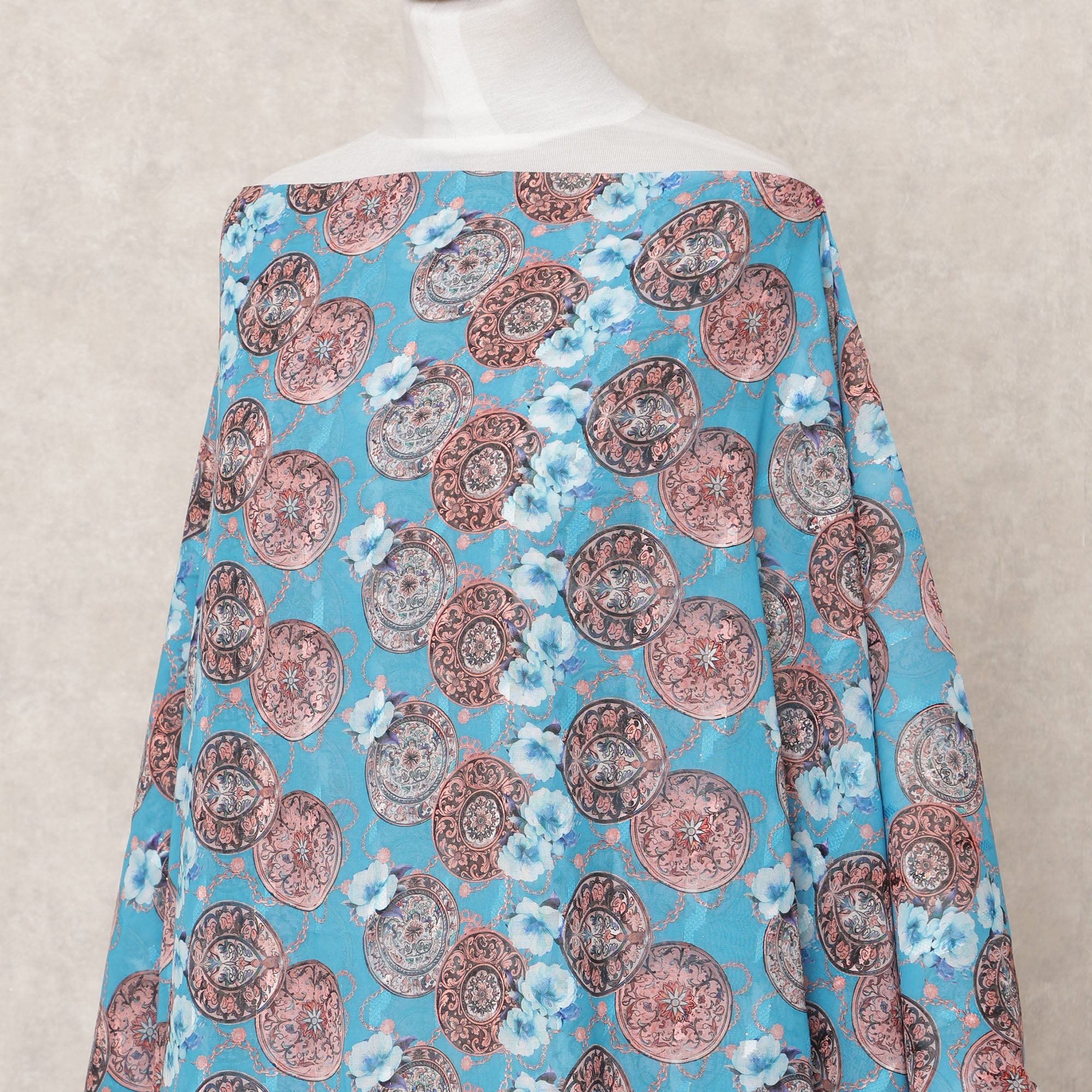 Brighten your ethnic collection with this vibrant turquoise blue Somali cotton voile fabric, featuring intricate round motifs in soft grey, terracotta red, and deep maroon that reflect traditional artistry with a modern twist. Crafted in India, this 3.5-meter piece of premium cotton voile is prized for its lightweight texture, breathable comfort, and elegant semi-sheer finish, making it perfect for warm-weather wear or layered modest ensembles. The symmetrical print offers visual balance and a refined appeal, ideal for creating abayas, hijabs, kaftans, or tunics that blend functionality with fashion. With a generous width of 140 cm, this fabric allows for creative and flowing silhouettes, giving you the flexibility to design freely. Whether you are sewing for daily wear or festive occasions, this fabric delivers long-lasting color vibrancy and softness. Buy online now to bring home the perfect fusion of traditional charm and Indian craftsmanship. Shop online for stylish, statement-worthy Somali cotton voile.
