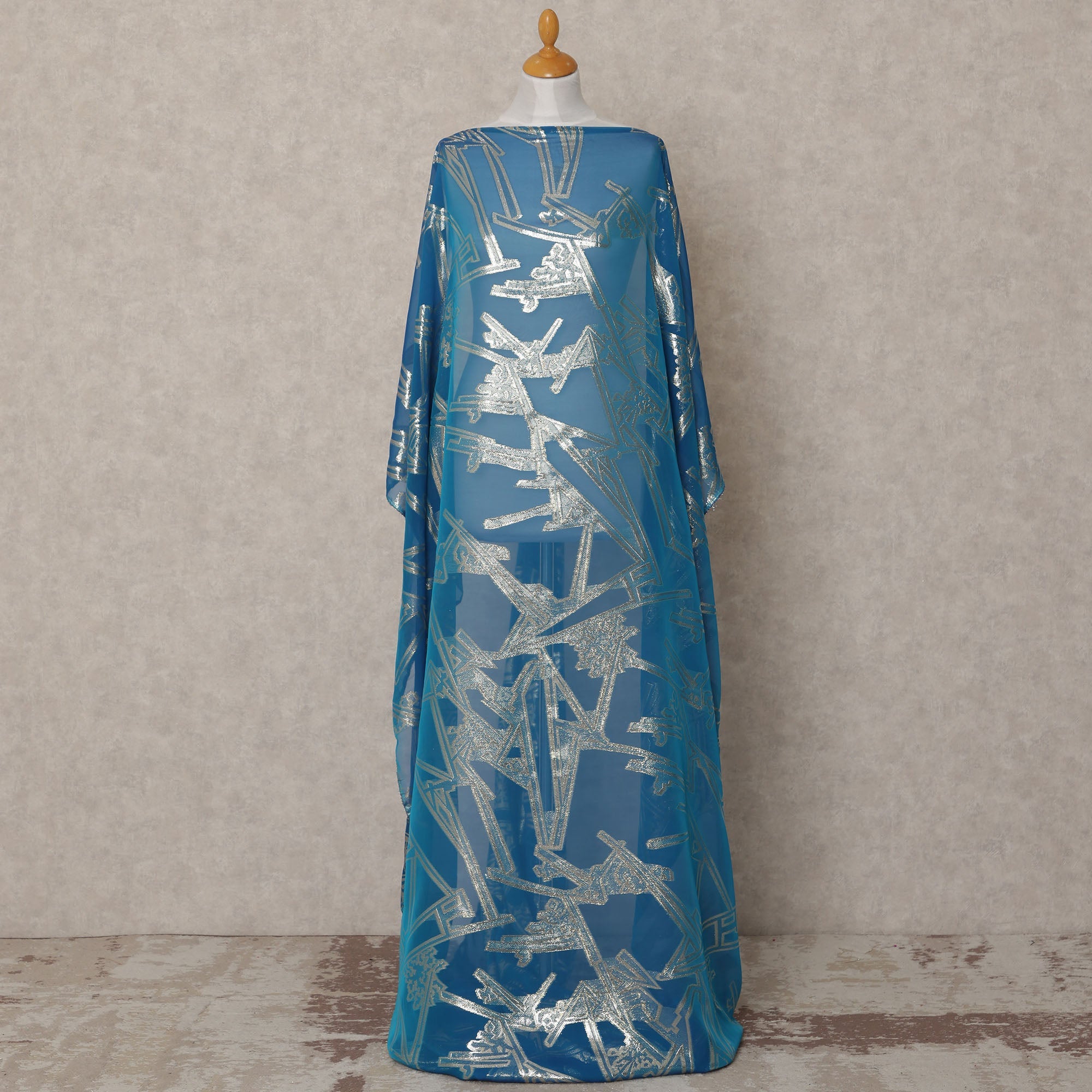 Turquoise Blue Somali Chiffon Dirac with Silver Geometric Lurex Work, 3.5 Mtrs, Width 140 Cms, Made in South Korea-D24050