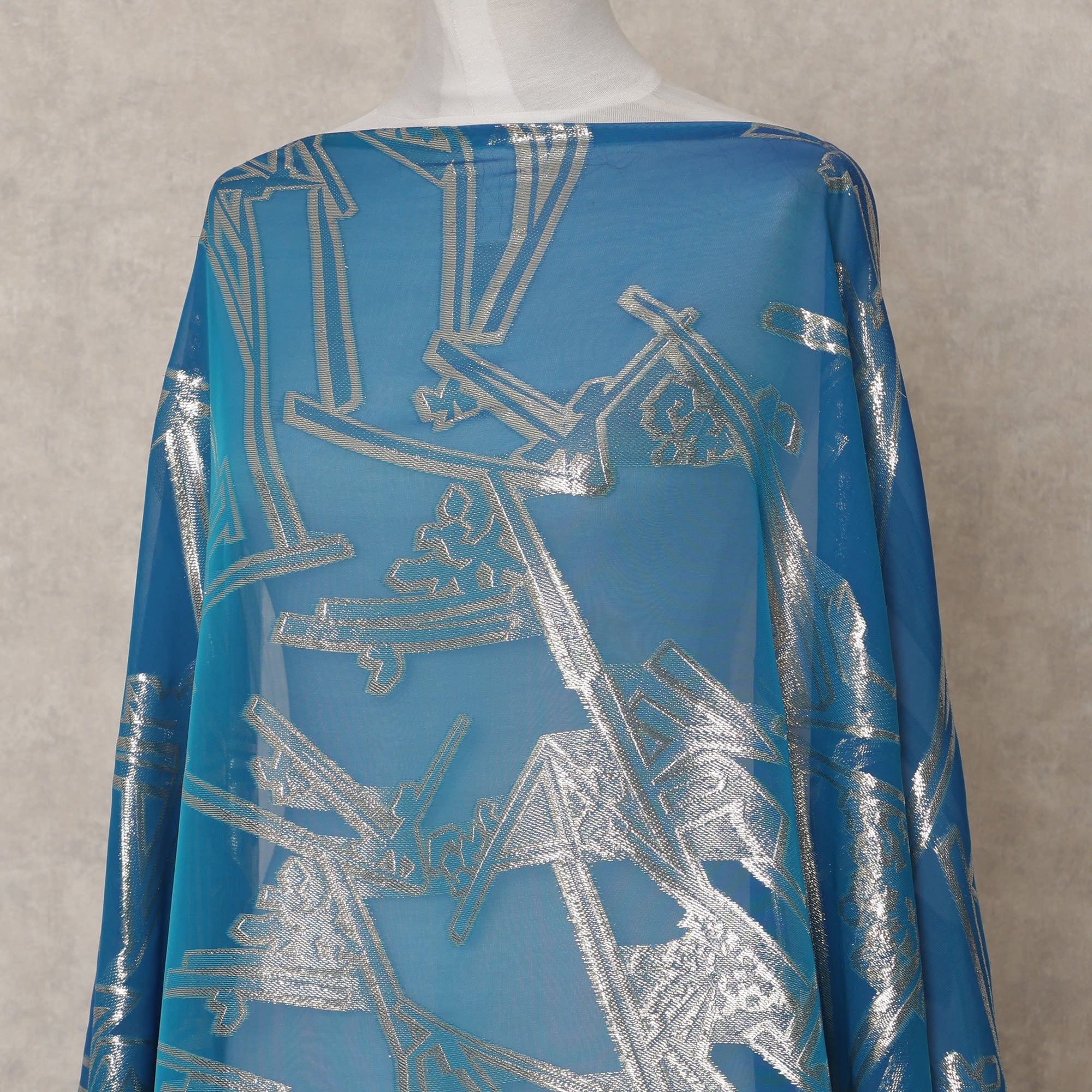 Striking turquoise blue chiffon base with bold silver geometric lurex accents
