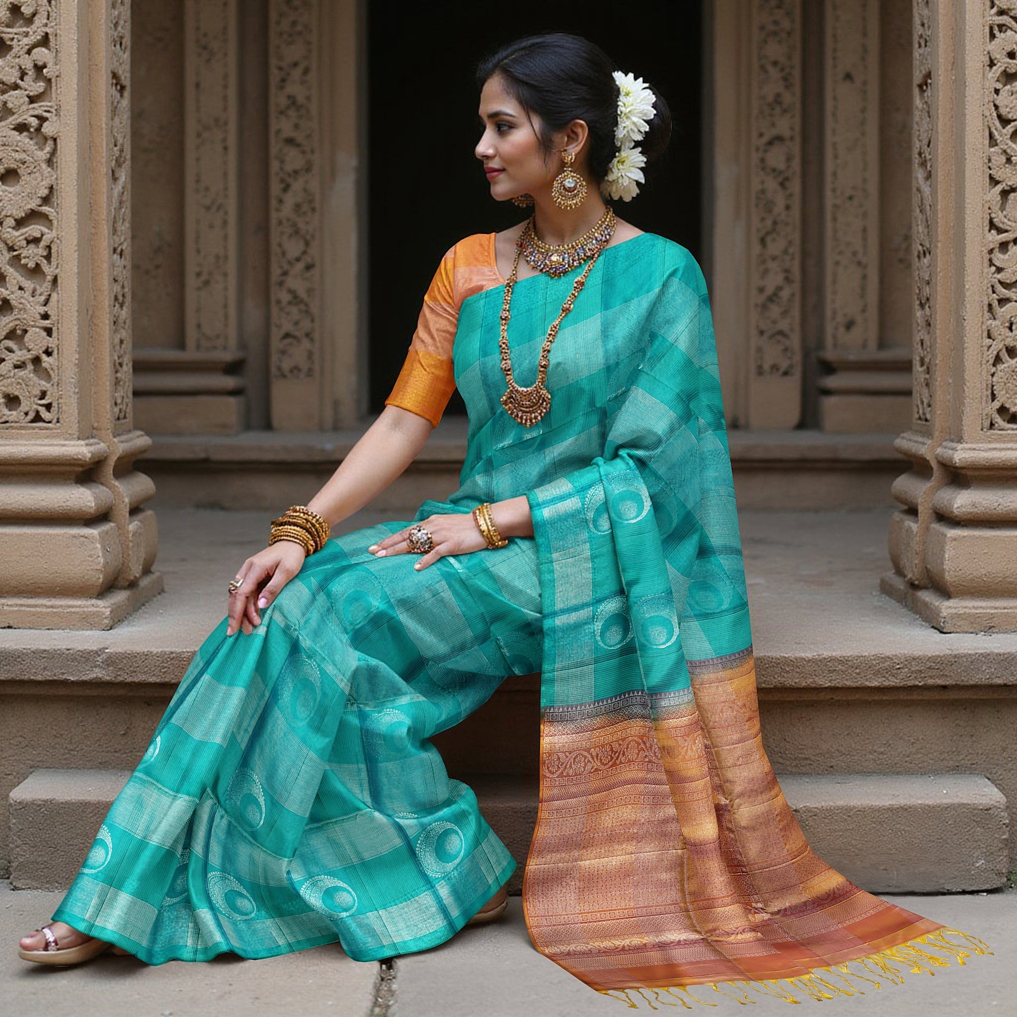 The turquoise green body of this Pure Soft Silk Saree whispers elegance, its checked base adorned with intricate butta motifs that resemble drops of moonlight. Every inch of this saree tells a tale — of hands that spent 36 hours weaving magic with silk threads, of a loom that echoes tradition, and of artisans who breathe life into fabric. The rich copper-hued border woven with delicate zari work contrasts beautifully, adding warmth to the vibrant coolness of the green. Handwoven in South India, this saree blends timeless craftsmanship with a contemporary hue, perfect for festive gatherings or elegant evenings. Paired with a matching blouse piece, this ensemble is a tribute to India’s silk heritage.