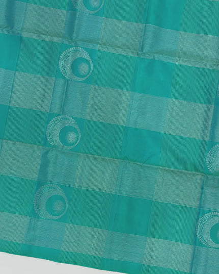 Turquoise Green Checked Butta Pattern Pure Soft Silk Saree with Contrast Copper Zari Border, 5.5 Meters with Blouse, Handwoven Origin India-D22749