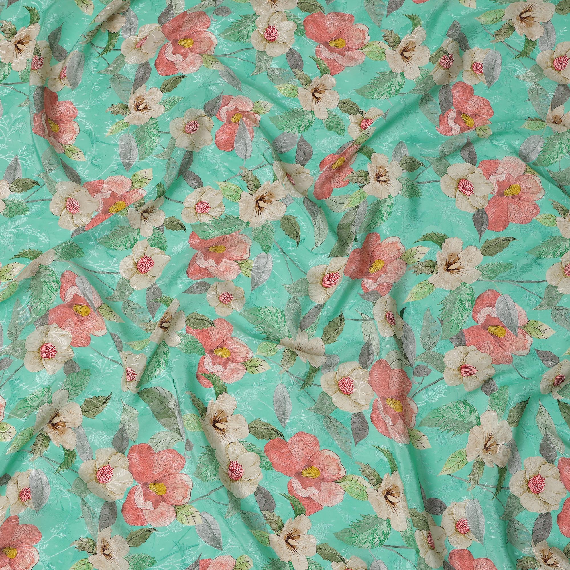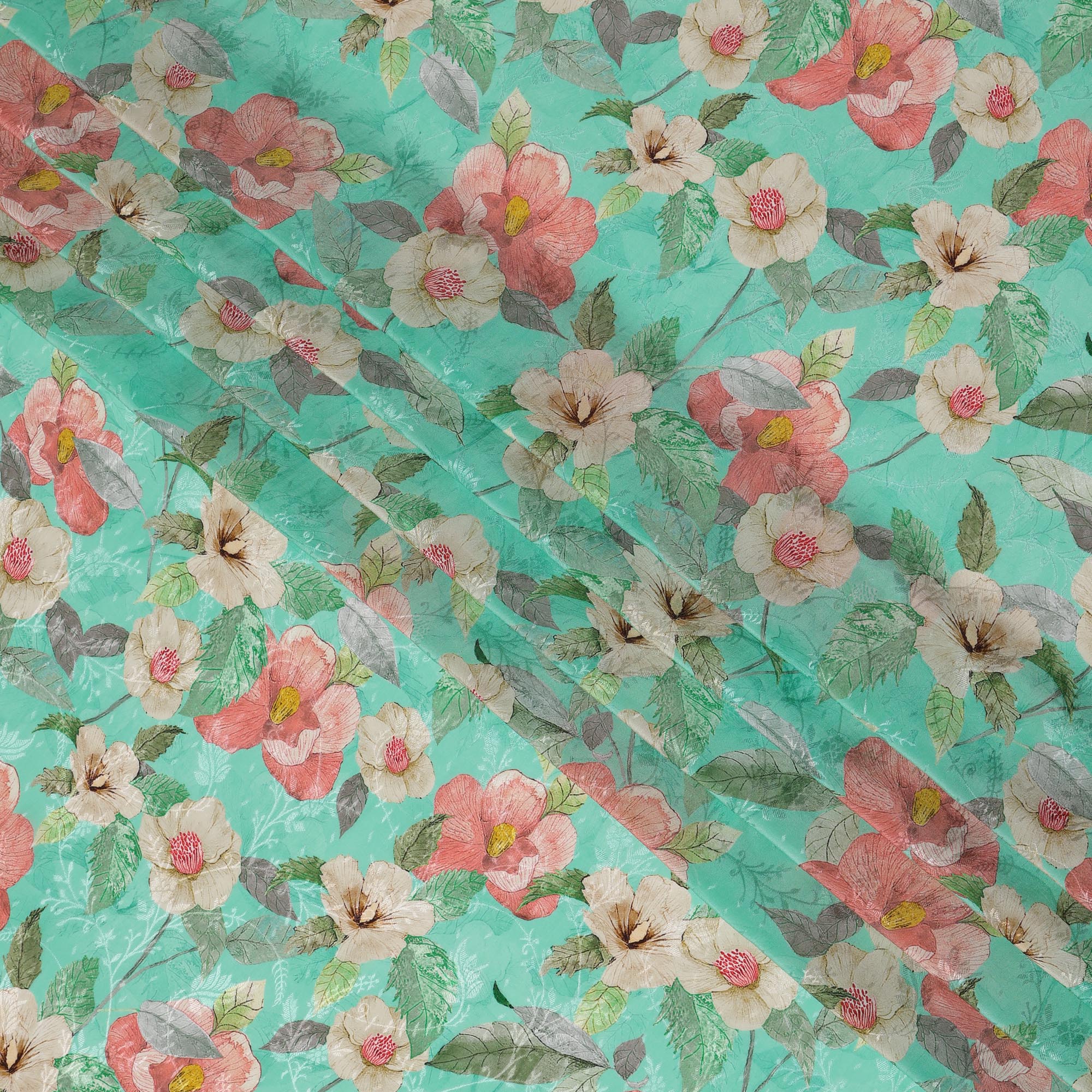 Turquoise Green Floral Digital Print Viscose Fabric, 110 cm Width, Made in India-D22920