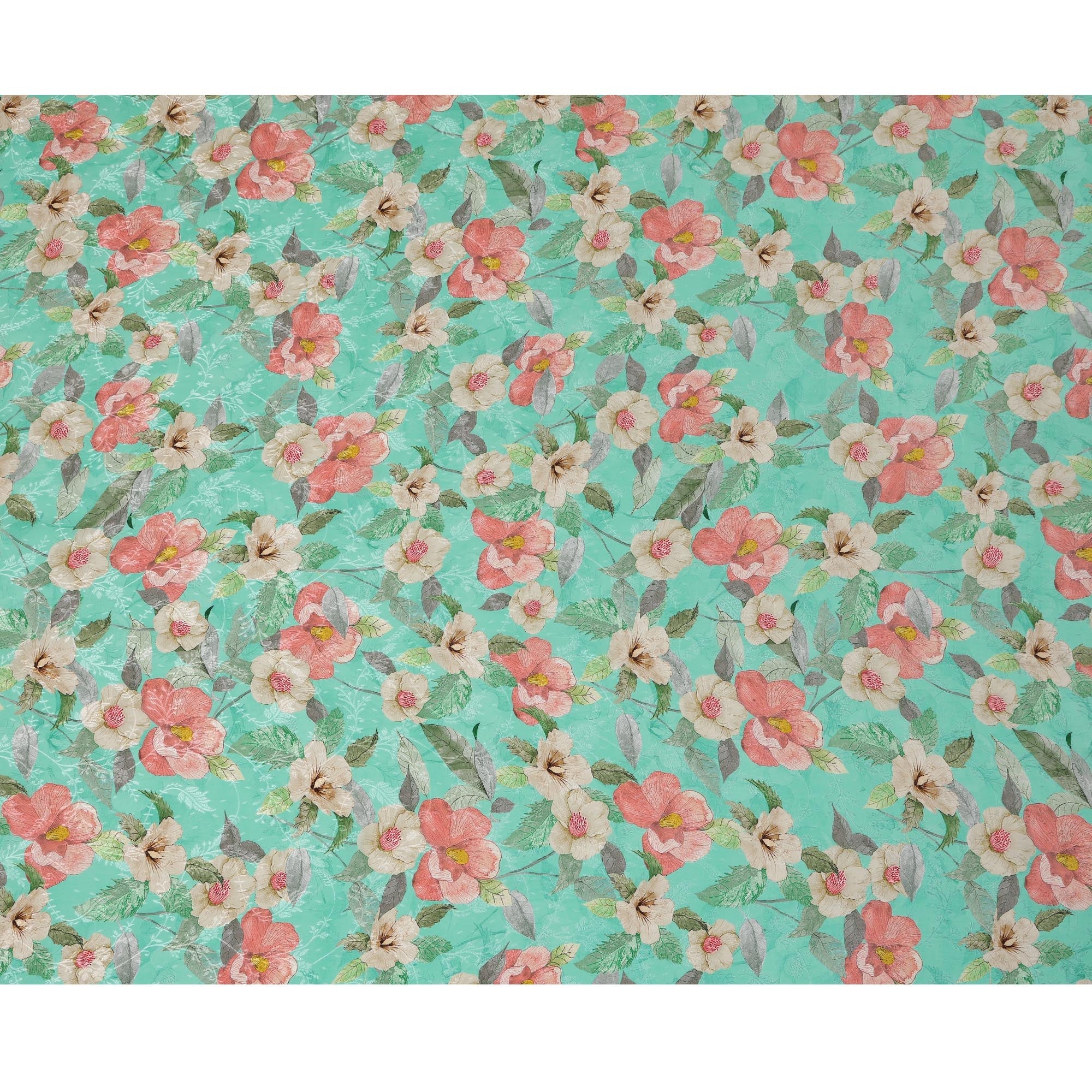 Turquoise green base enhanced with digital floral prints in pink and ivory hues