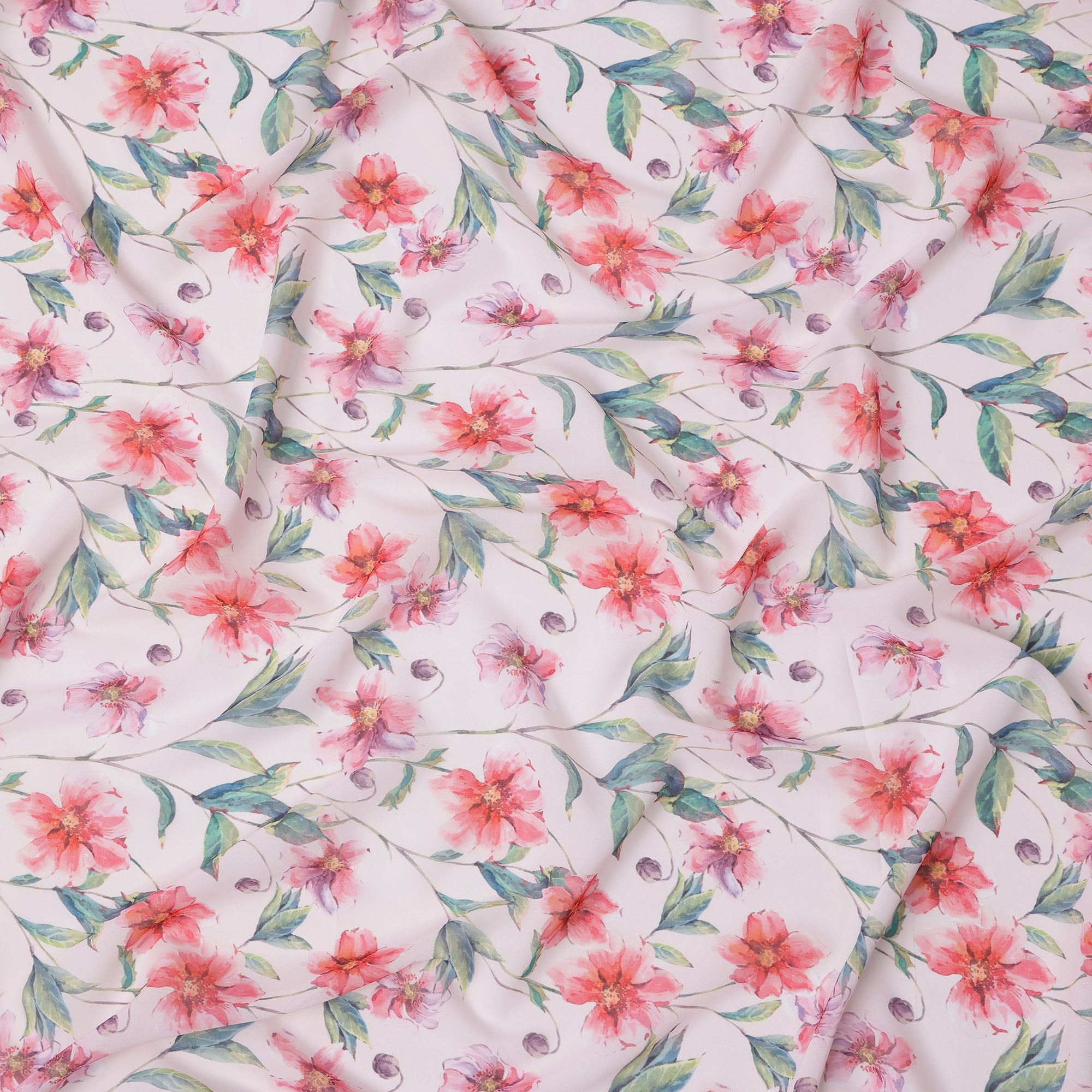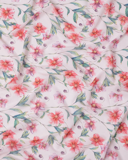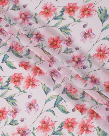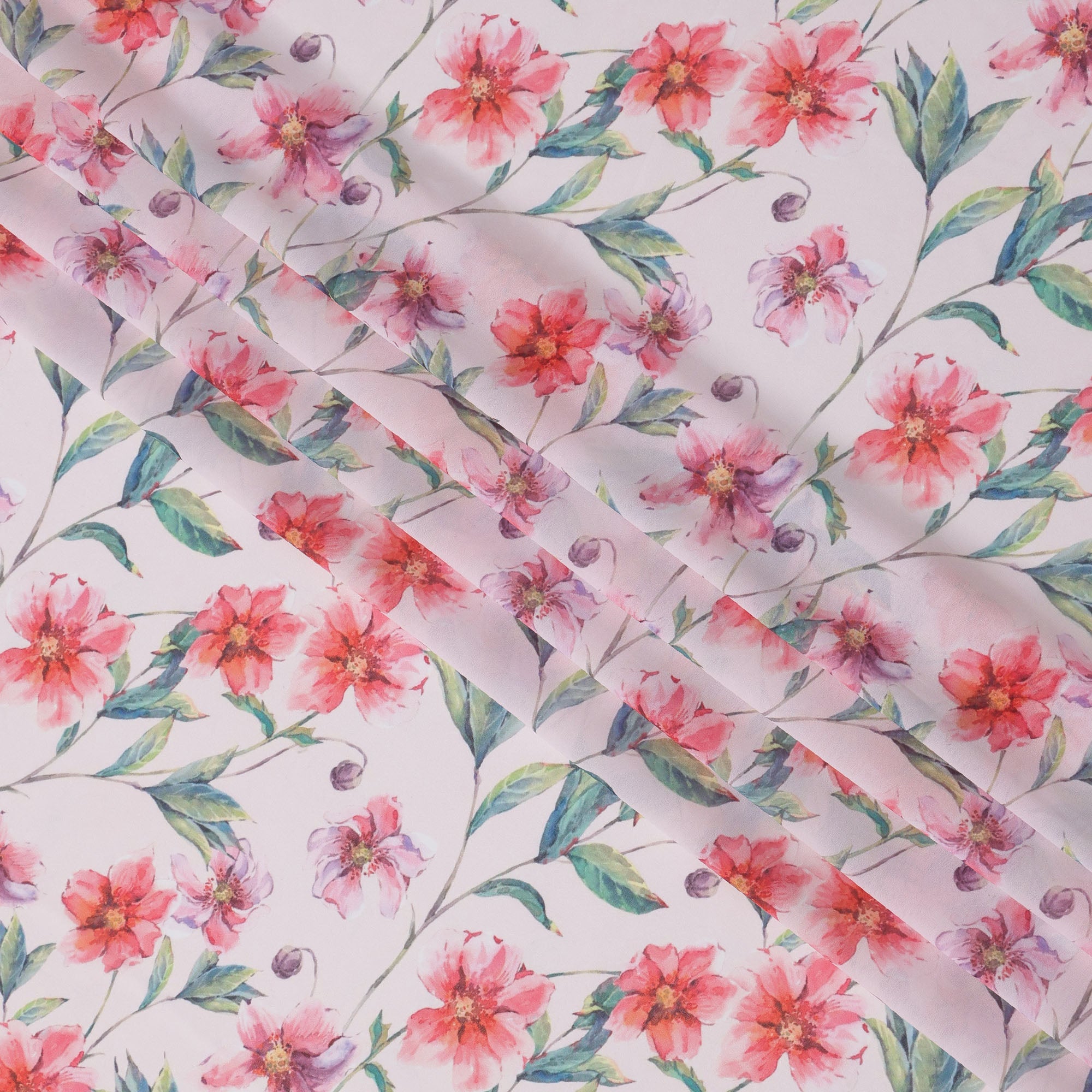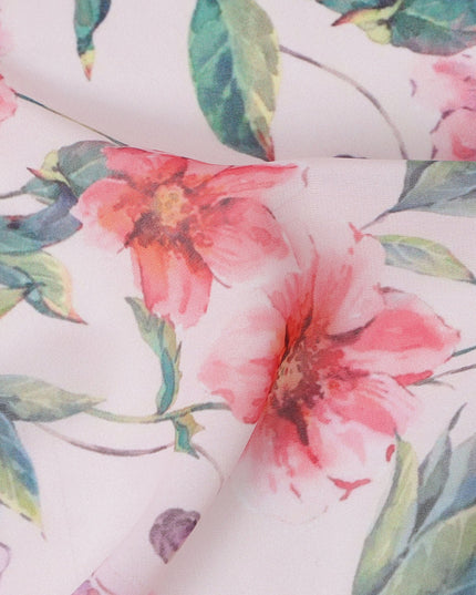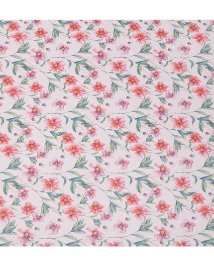 White and Coral Floral Synthetic Georgette Fabric – 110 cm Width, Soft & Lightweight-D21892