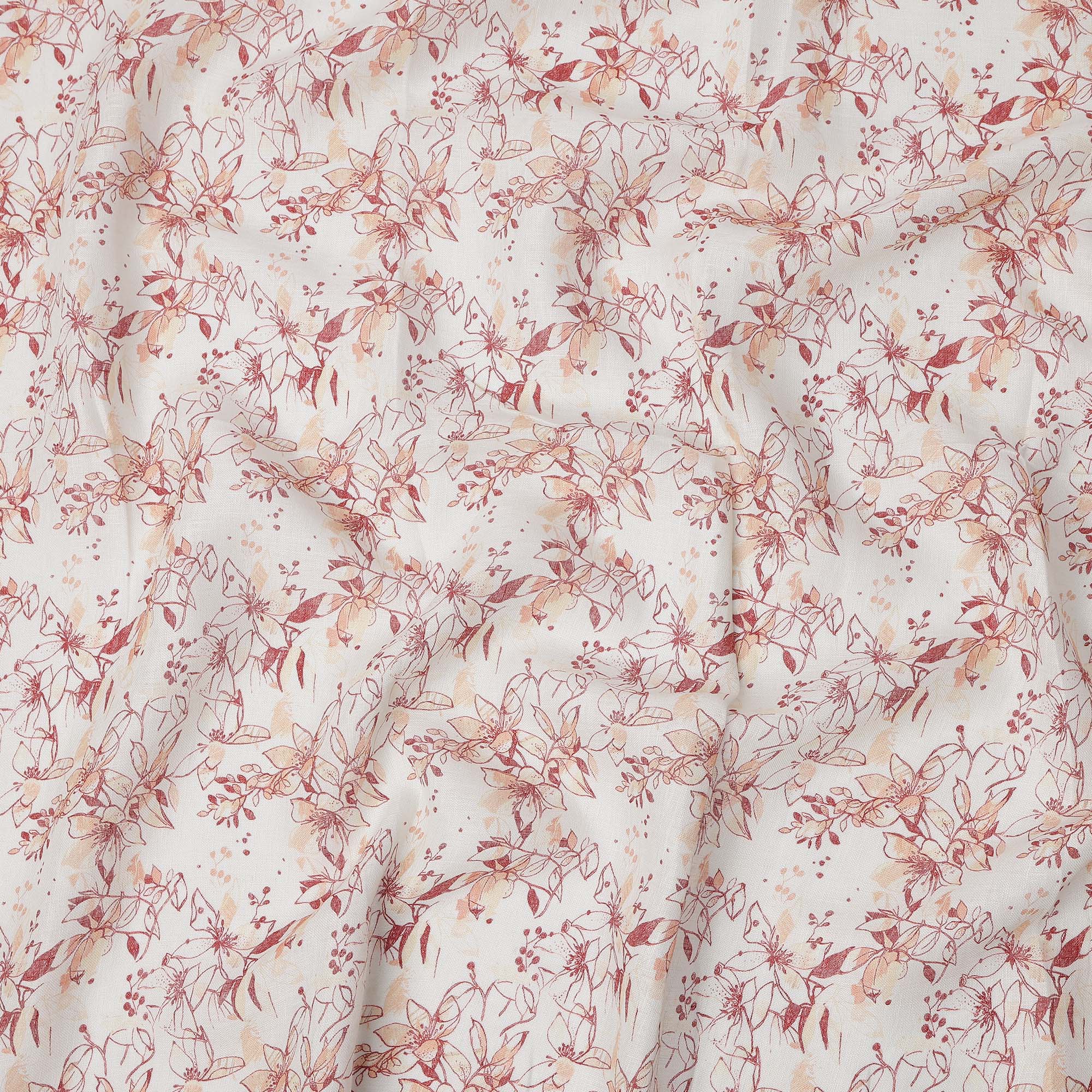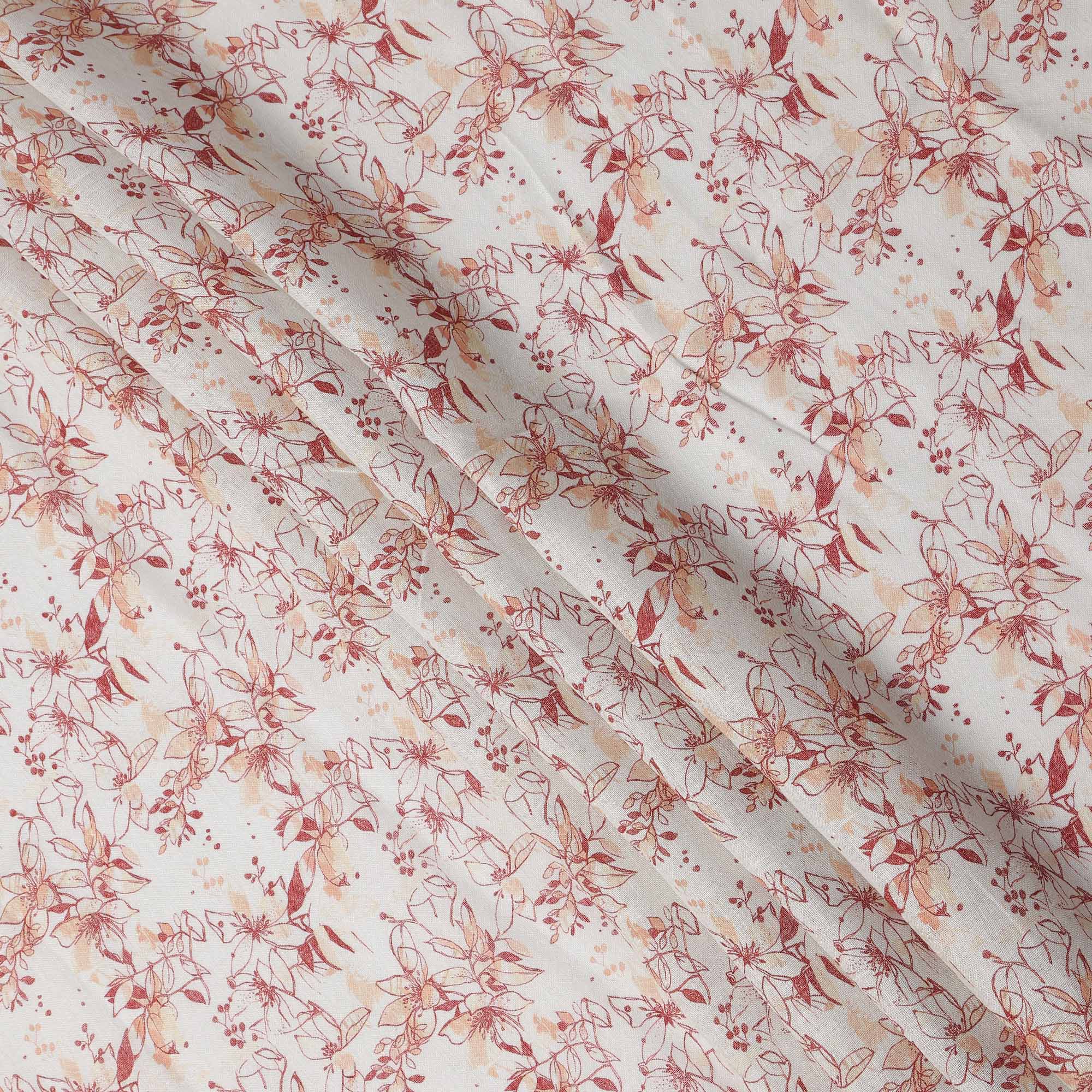White and Red Leaf Printed Blended Cotton Linen Fabric, 110 Cms Width, India-D25167