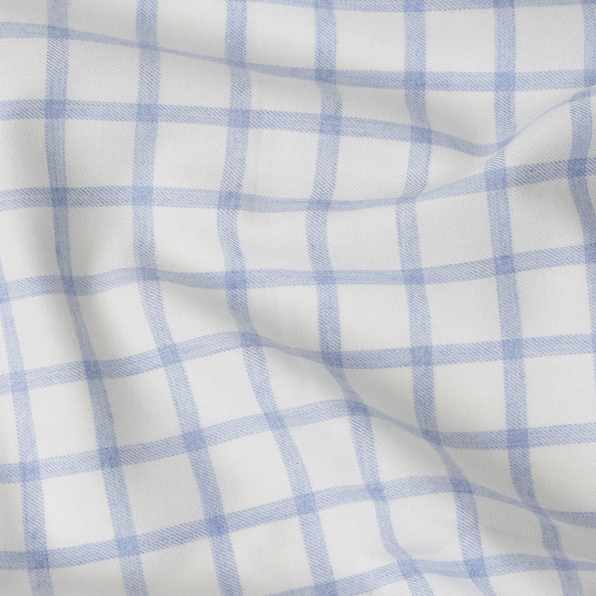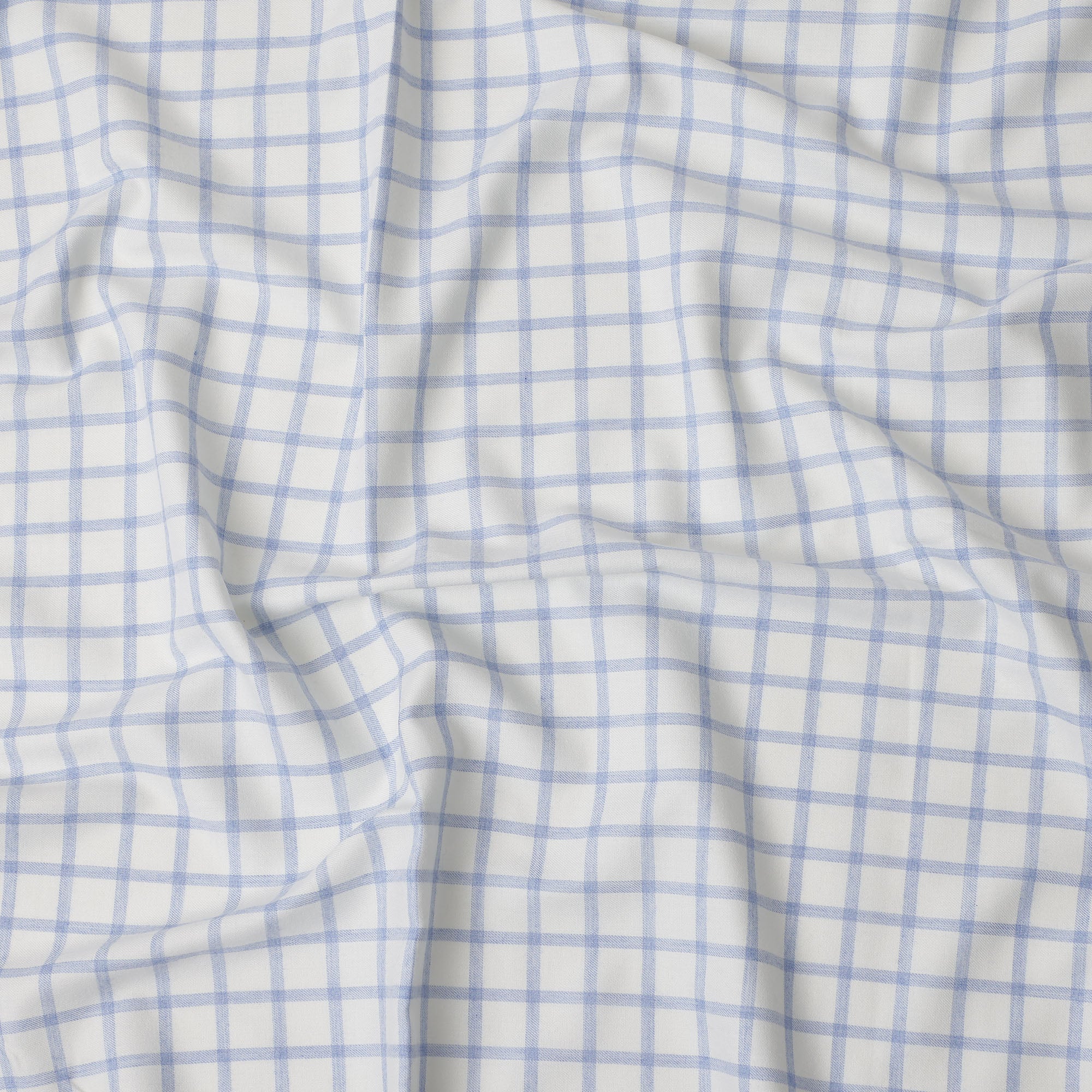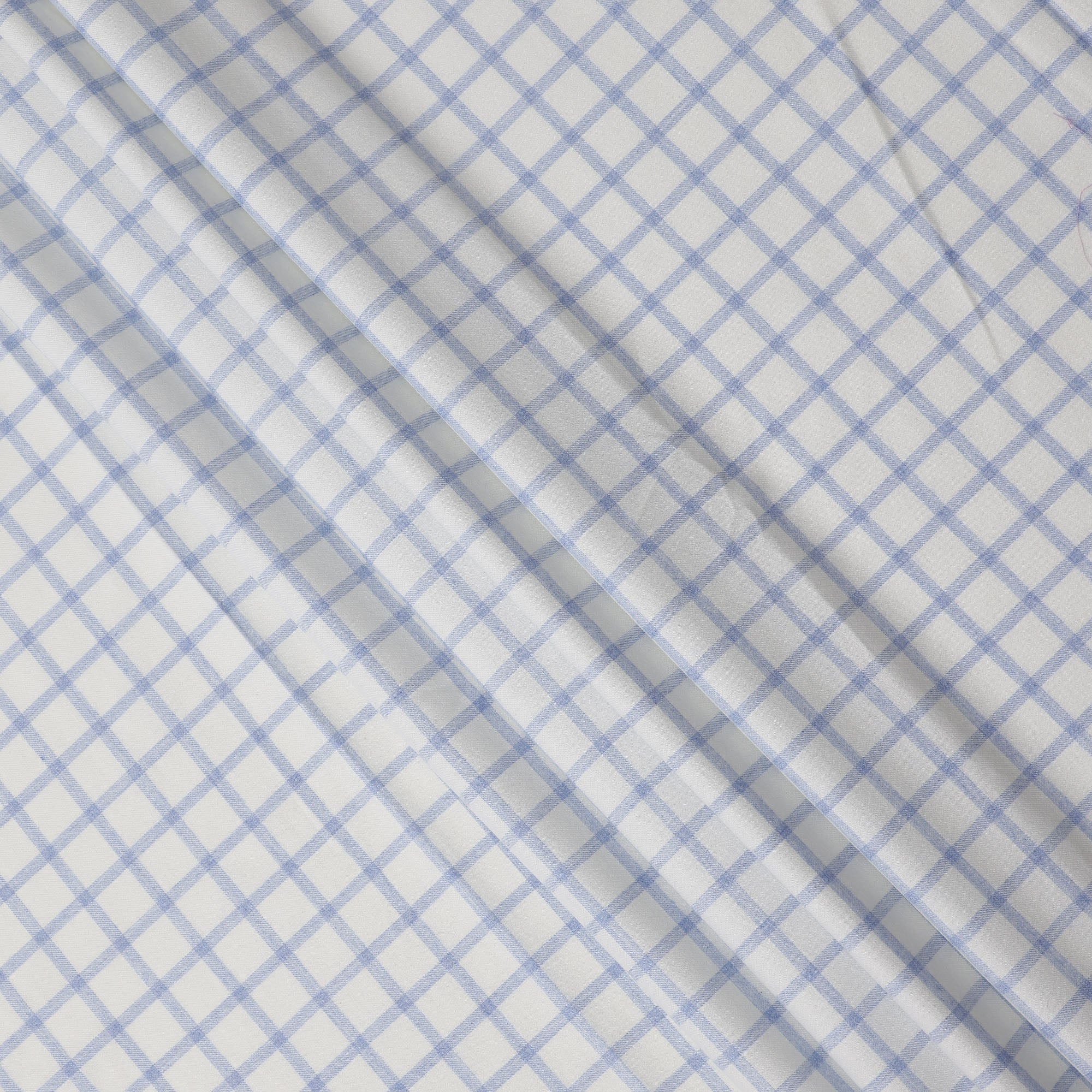 Premium cotton shirting fabric with elegant white and sky blue checks.