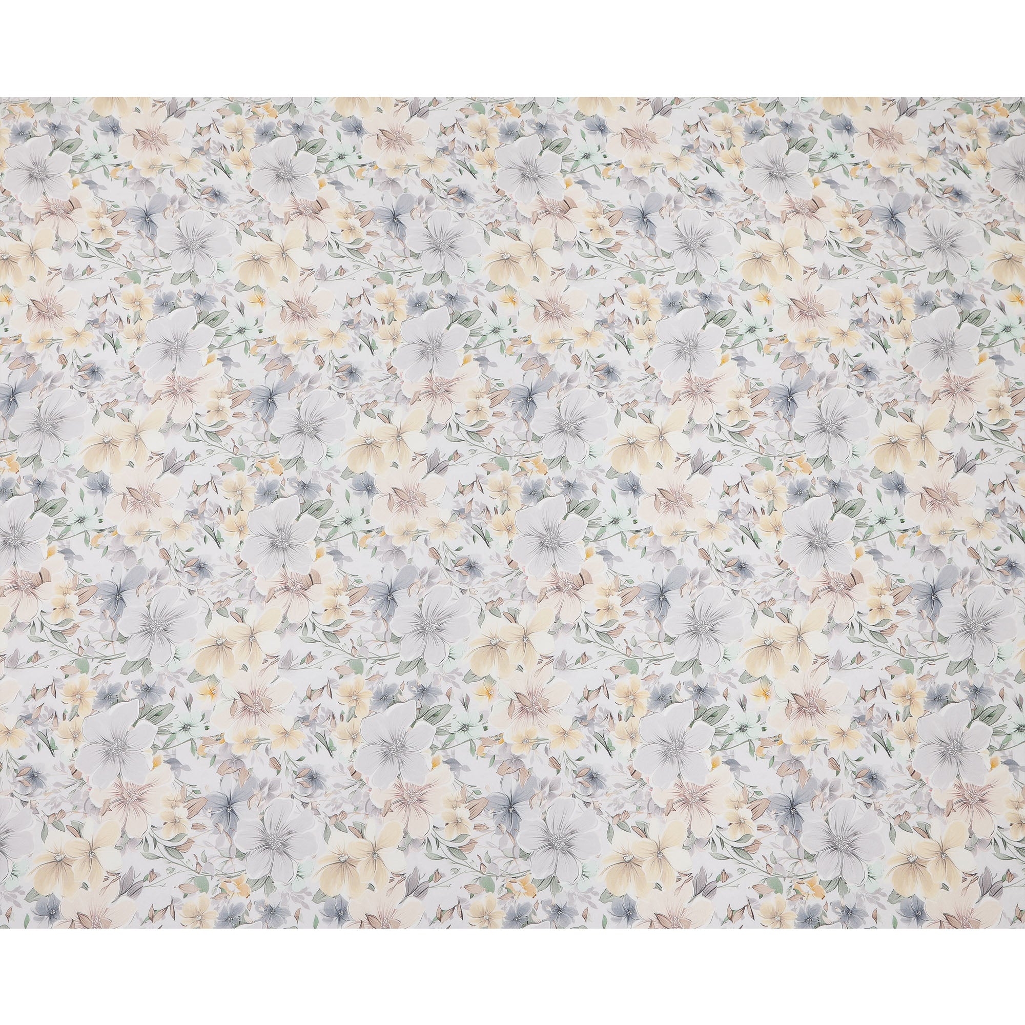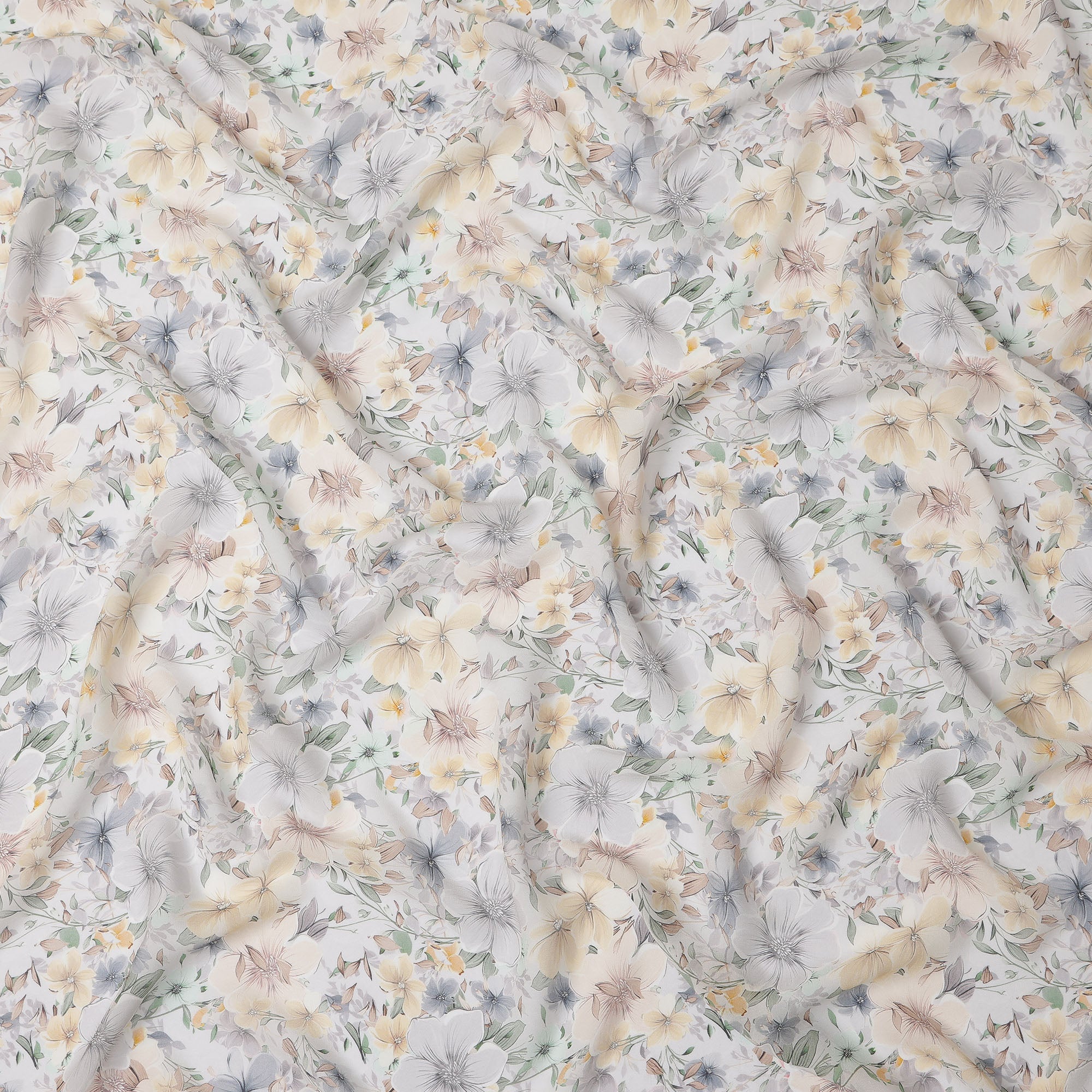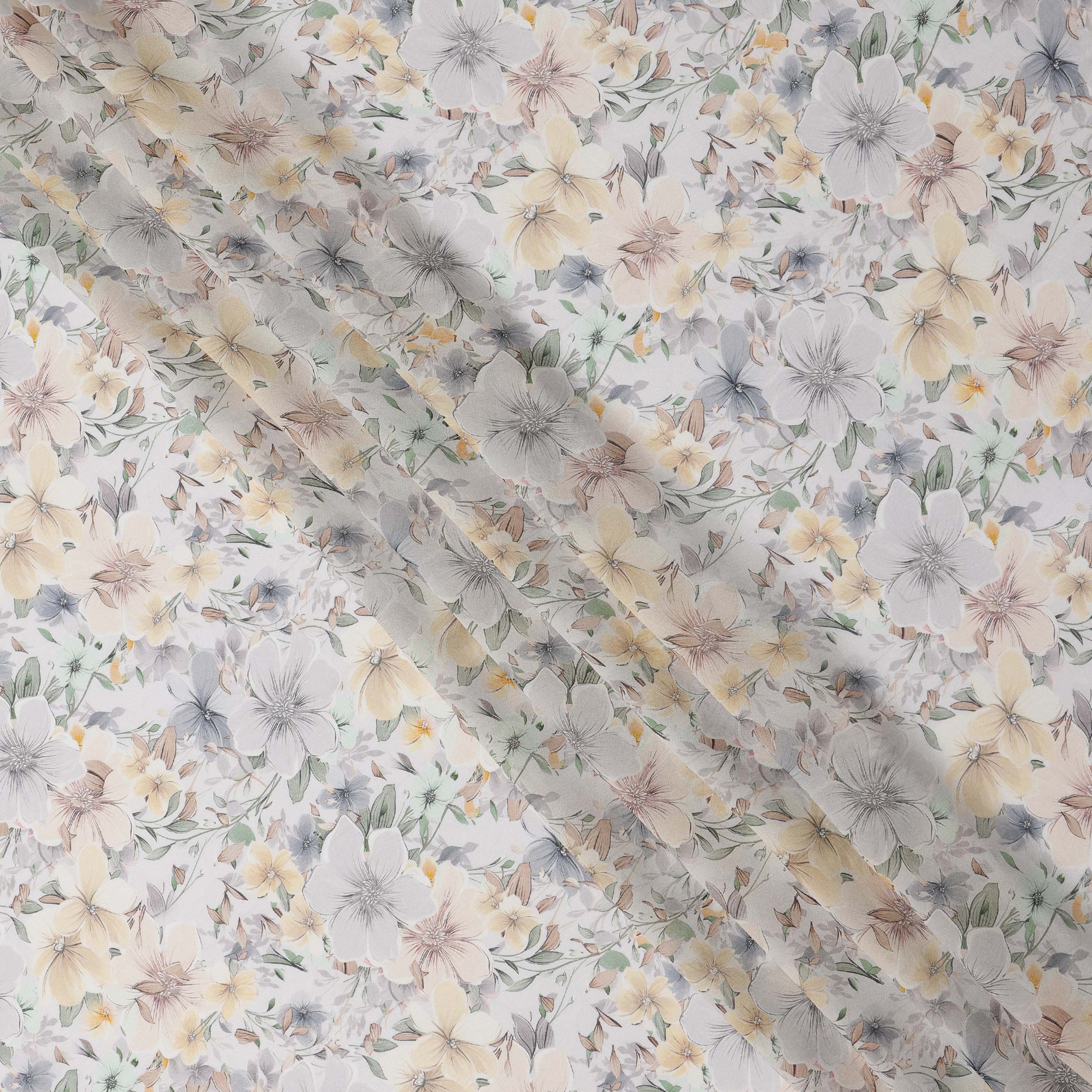 White and Yellow Floral Printed Viscose Georgette Fabric with Soft Grey Blossoms and Pastel Leaf Accents, 110 Cms Width, Made in India-D25878