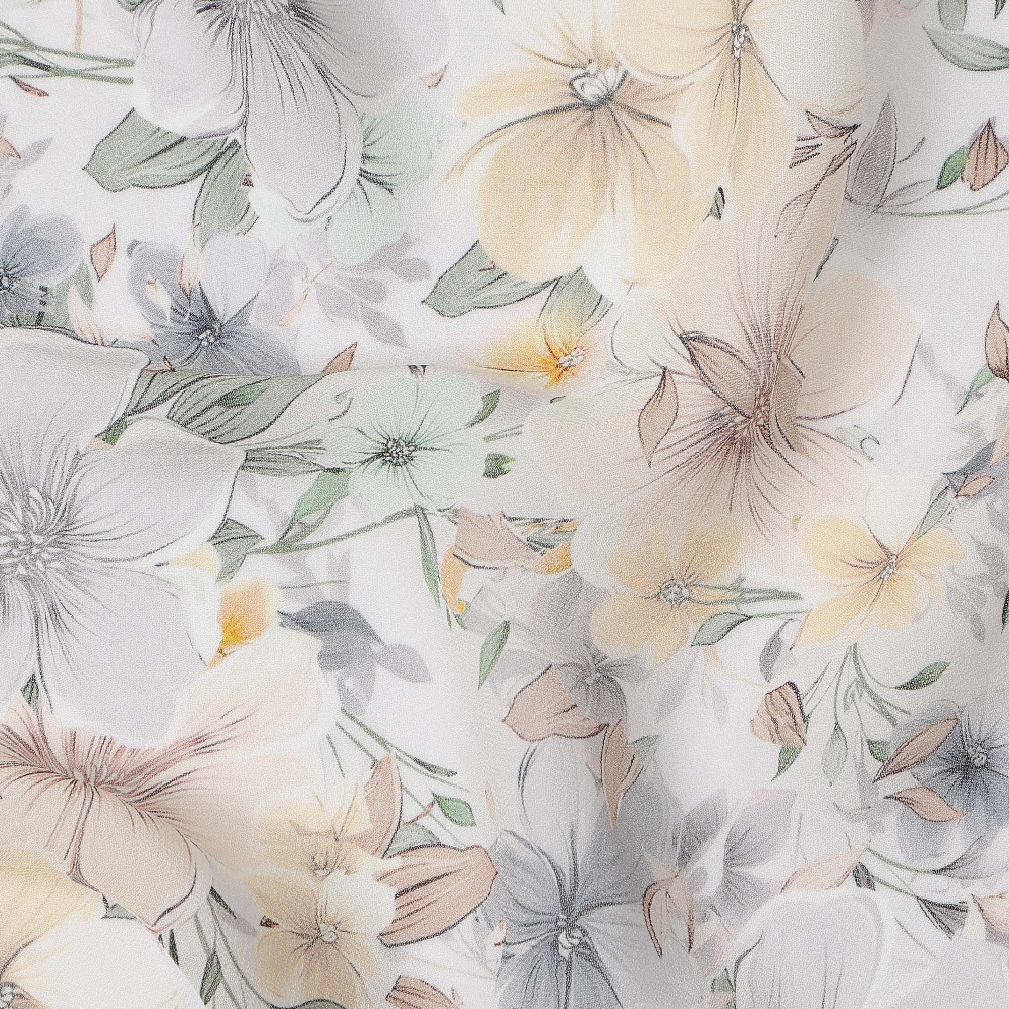 White viscose georgette fabric featuring yellow and grey floral digital prints