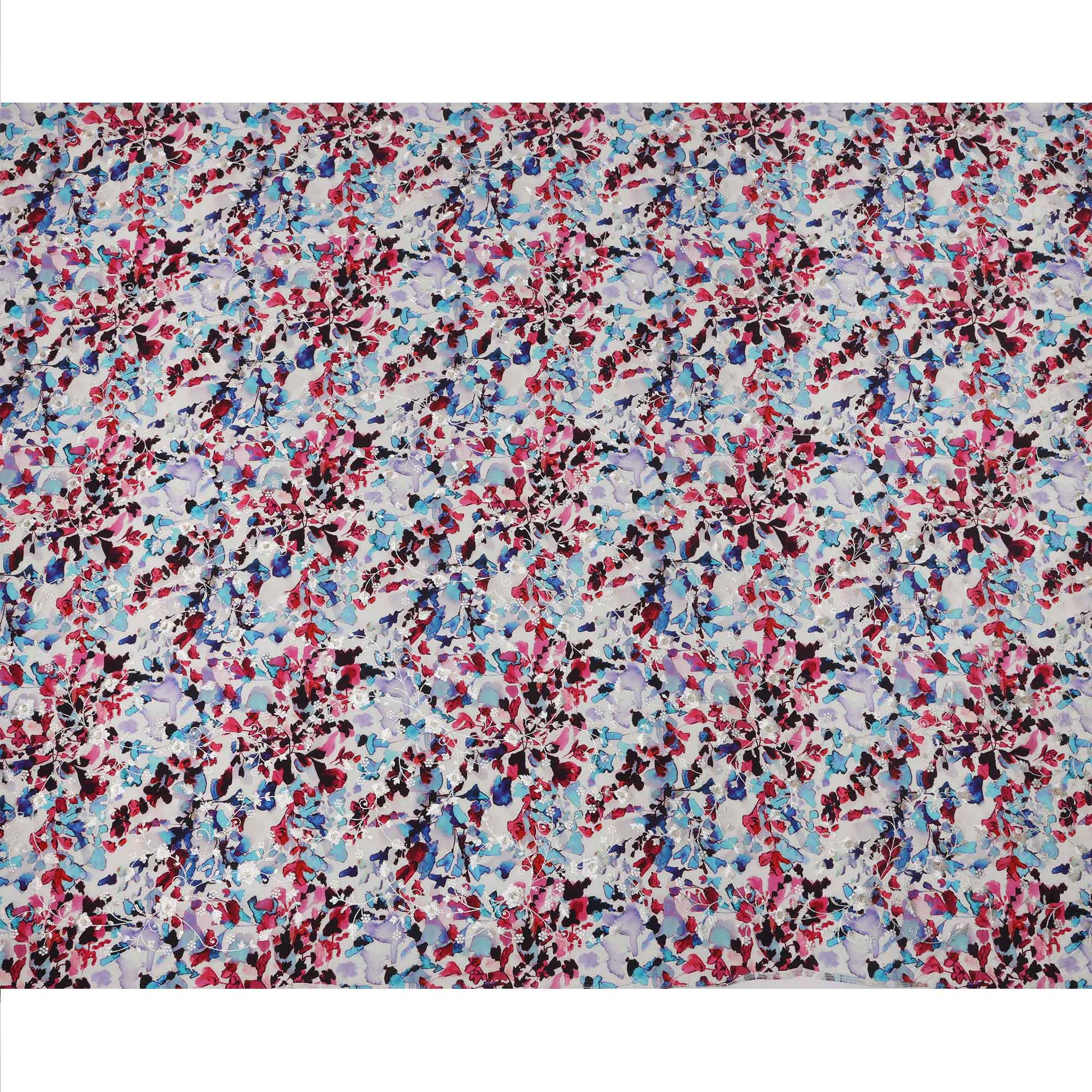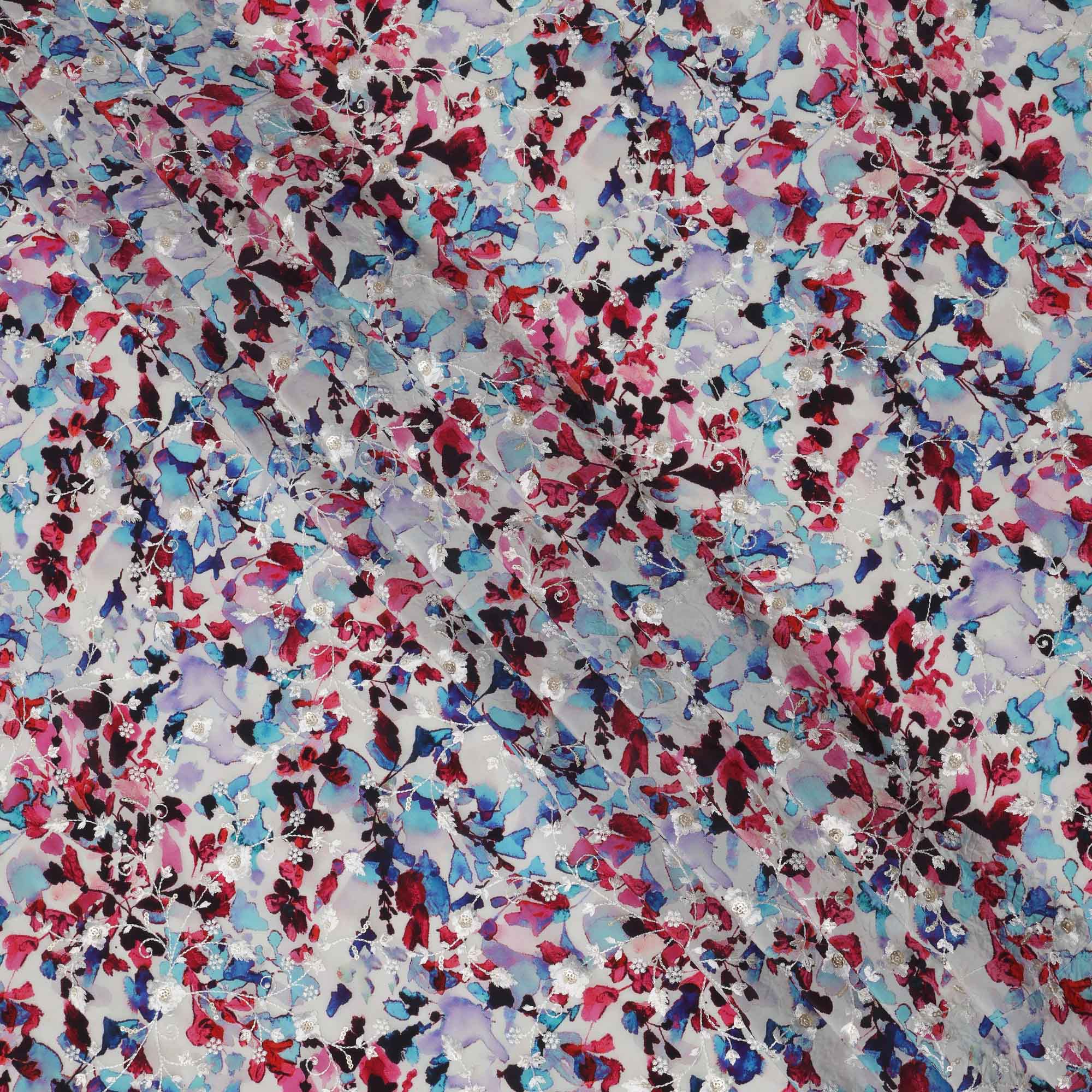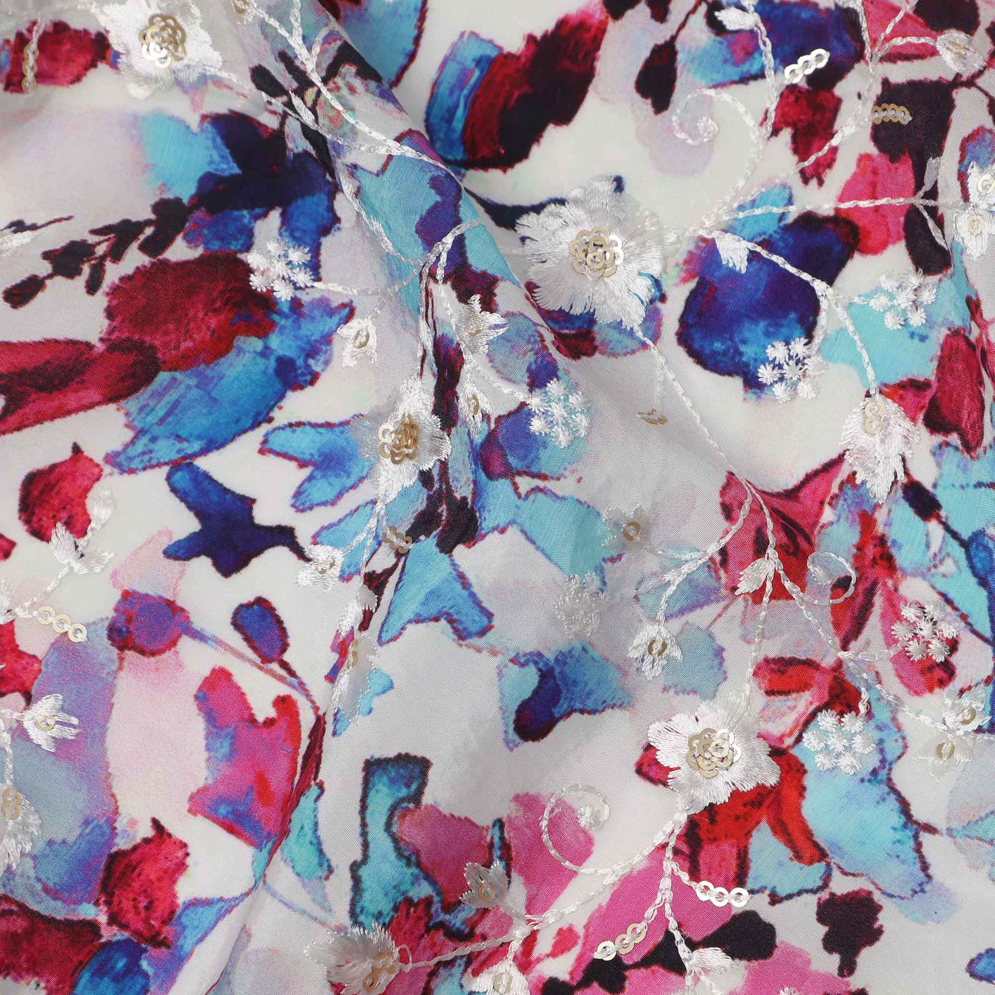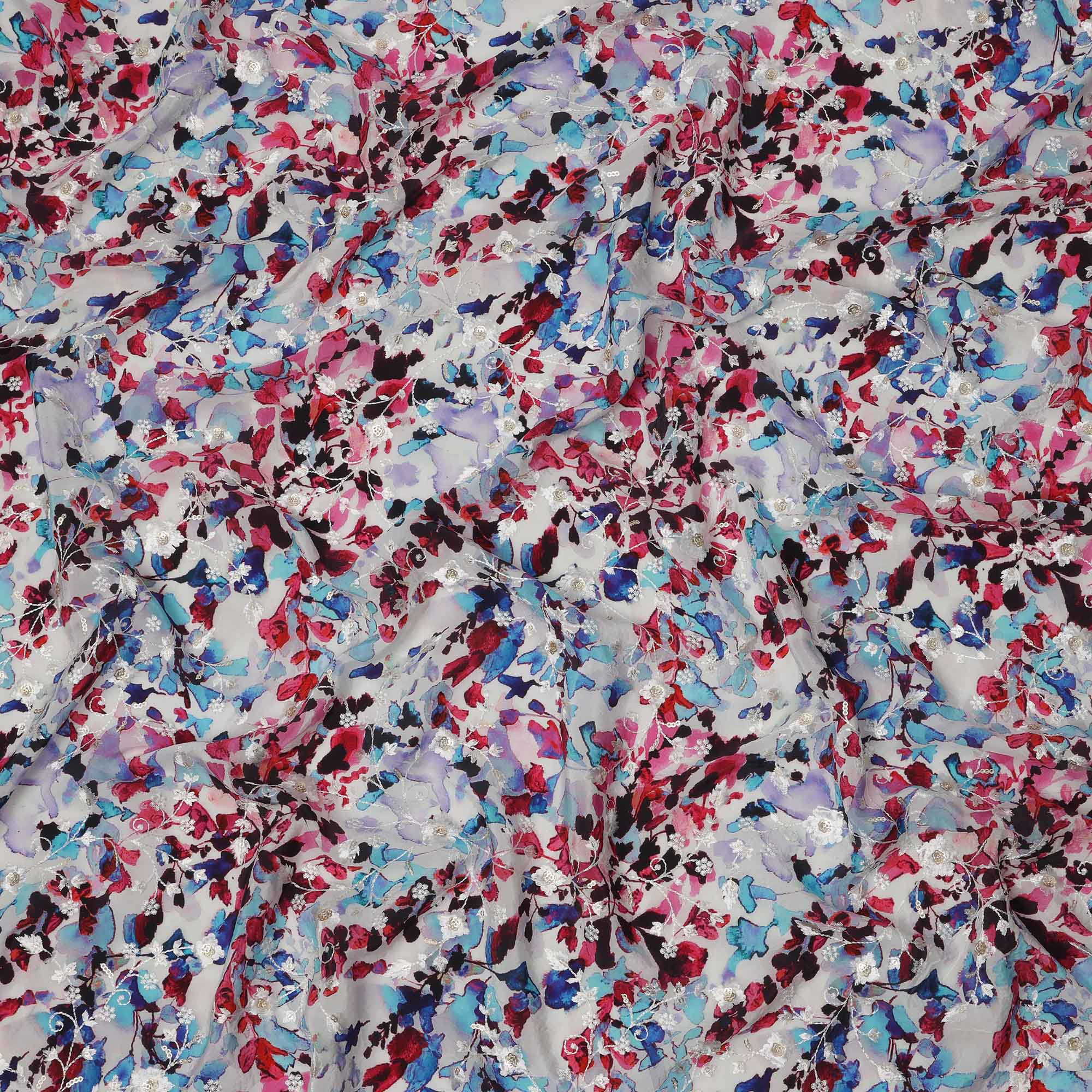 This white base viscose crepe fabric showcases an exquisite digital print featuring an intricate fusion of multicolor florals and delicate... Read more Read more