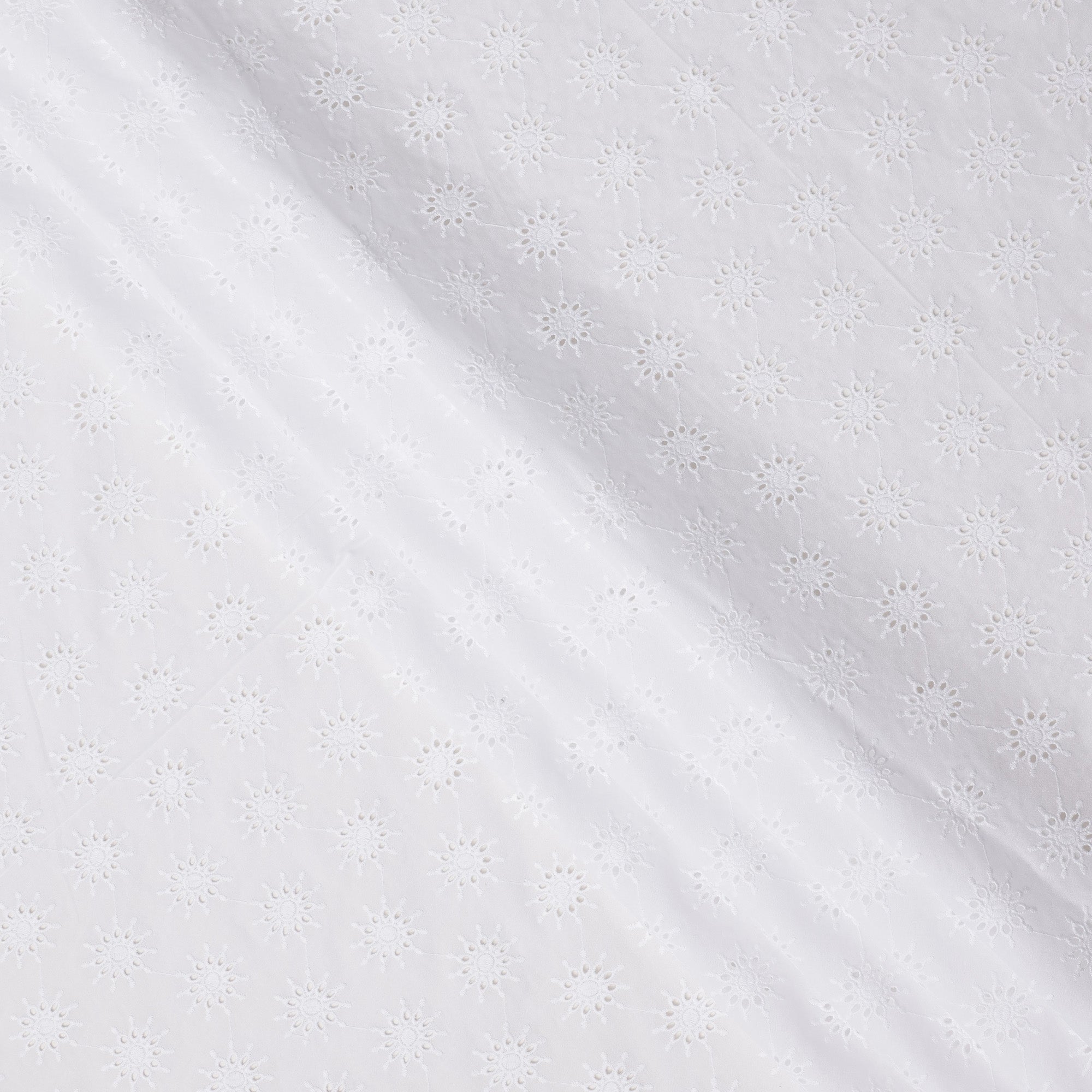 White cotton voile fabric with floral starburst embroidery and eyelet cutwork