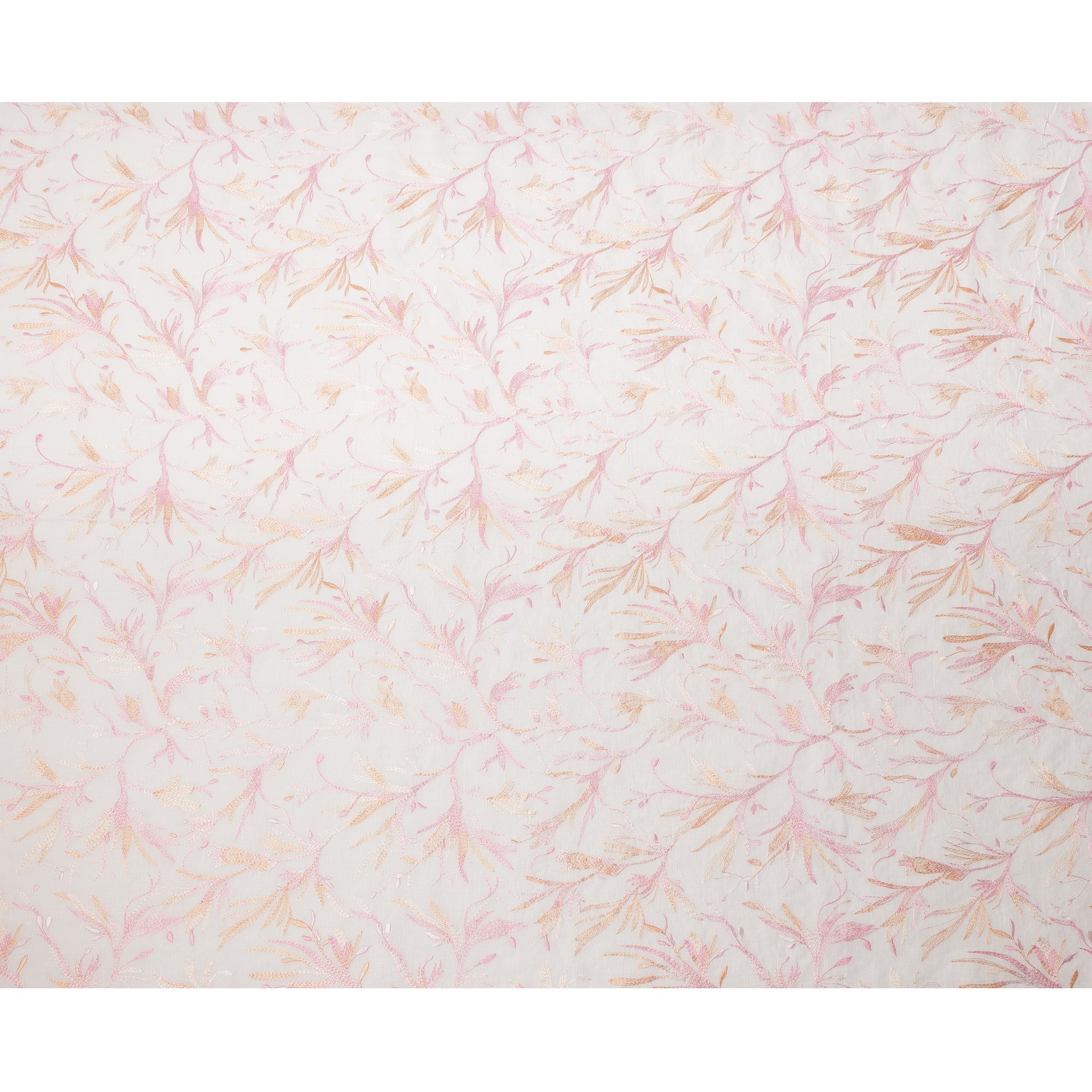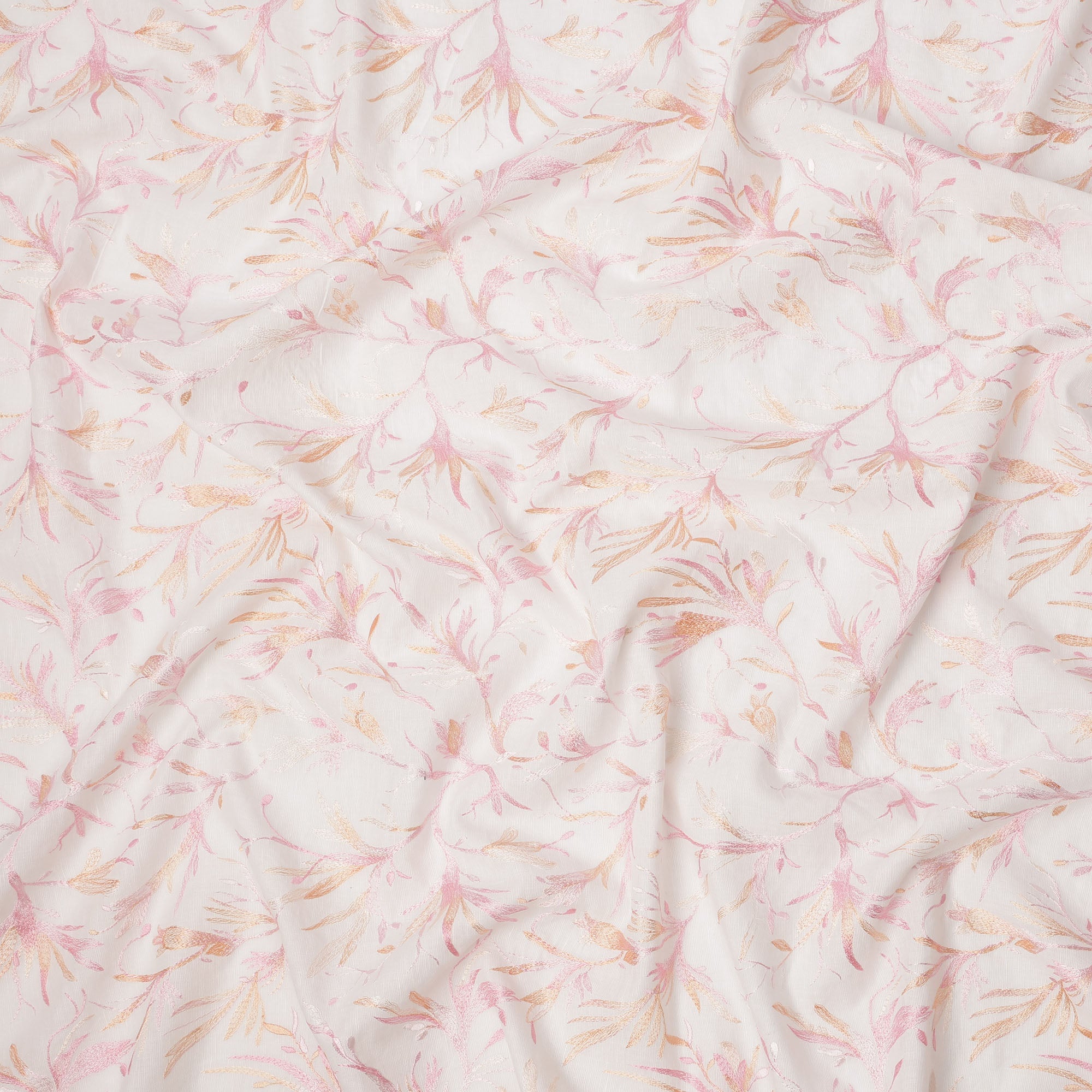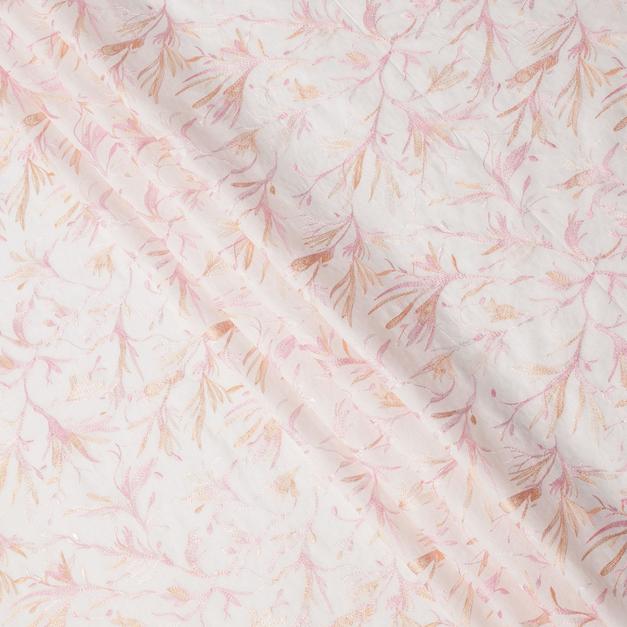 White Base with Pink and Peach Floral Leaf Embroidery Cotton Voile Fabric, 110 Cms Width, India-D24672