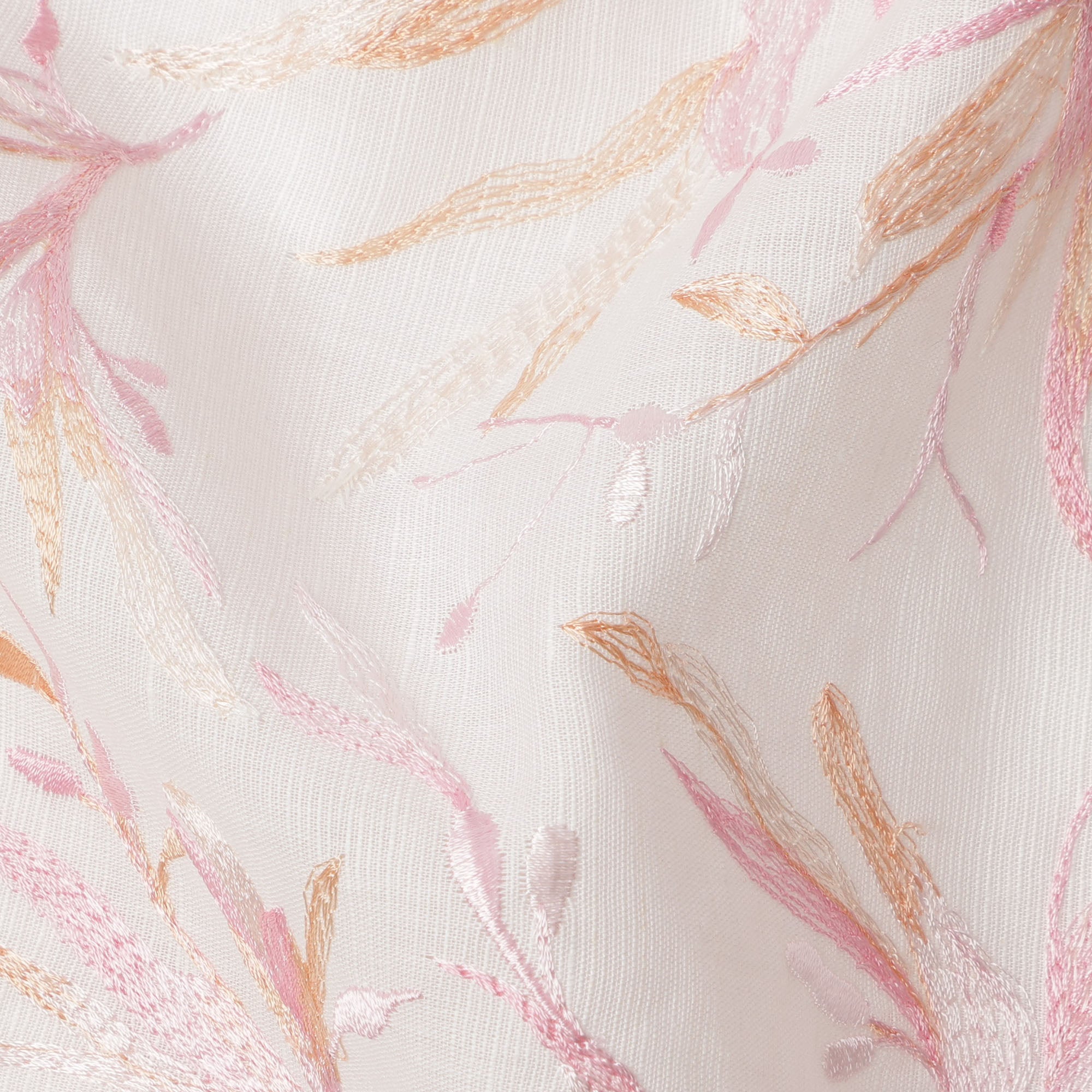 White cotton voile base with soft pink and peach floral leaf embroidery