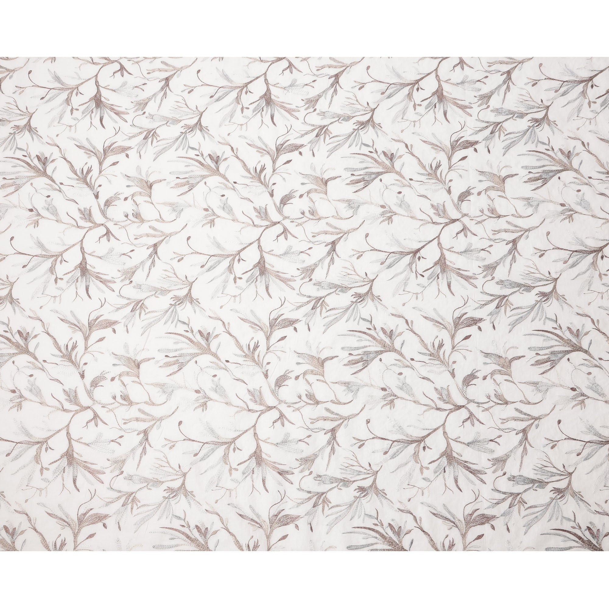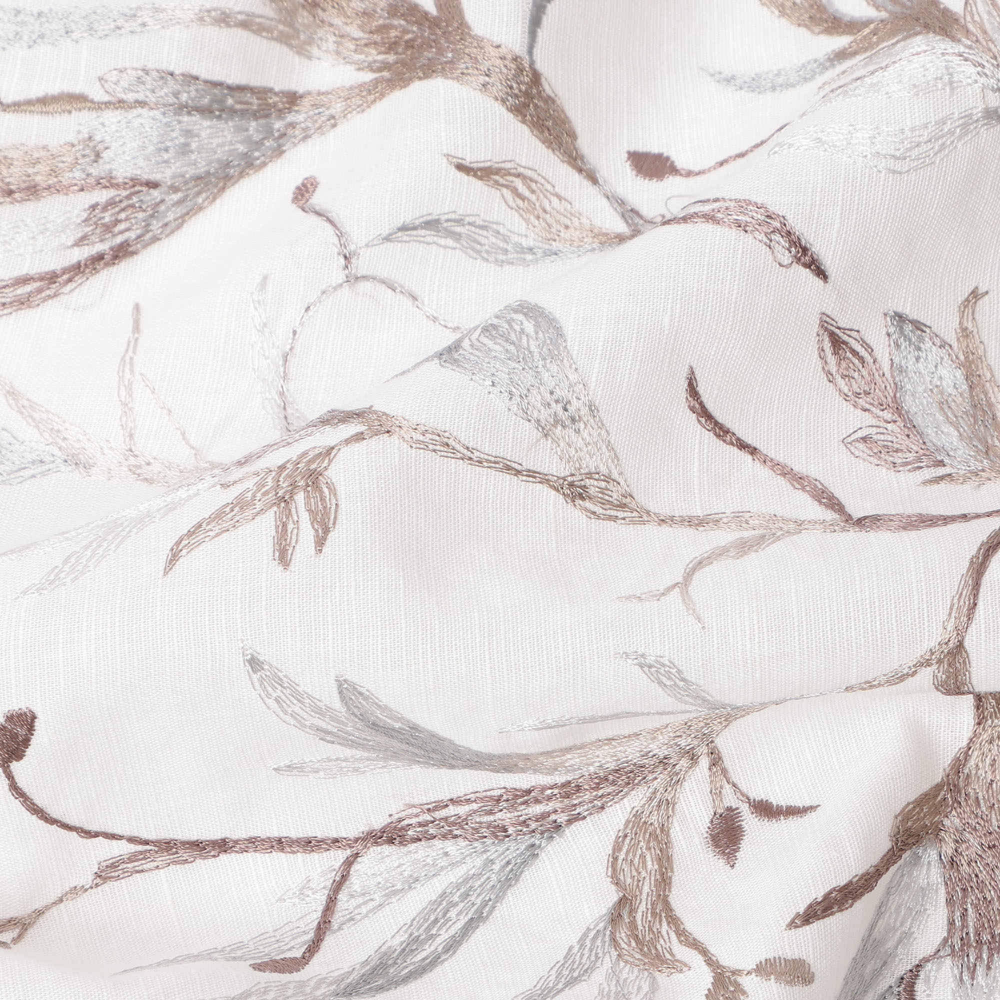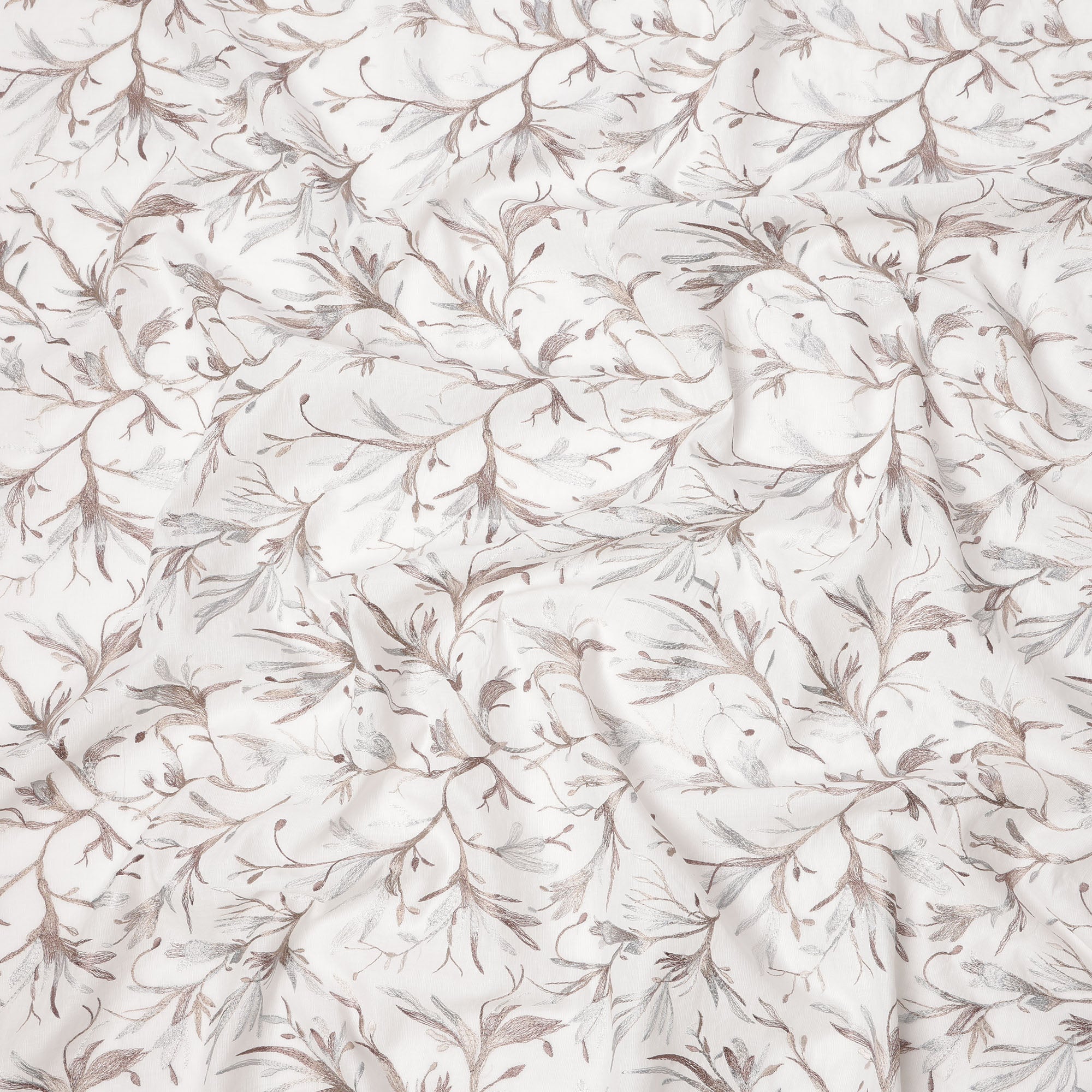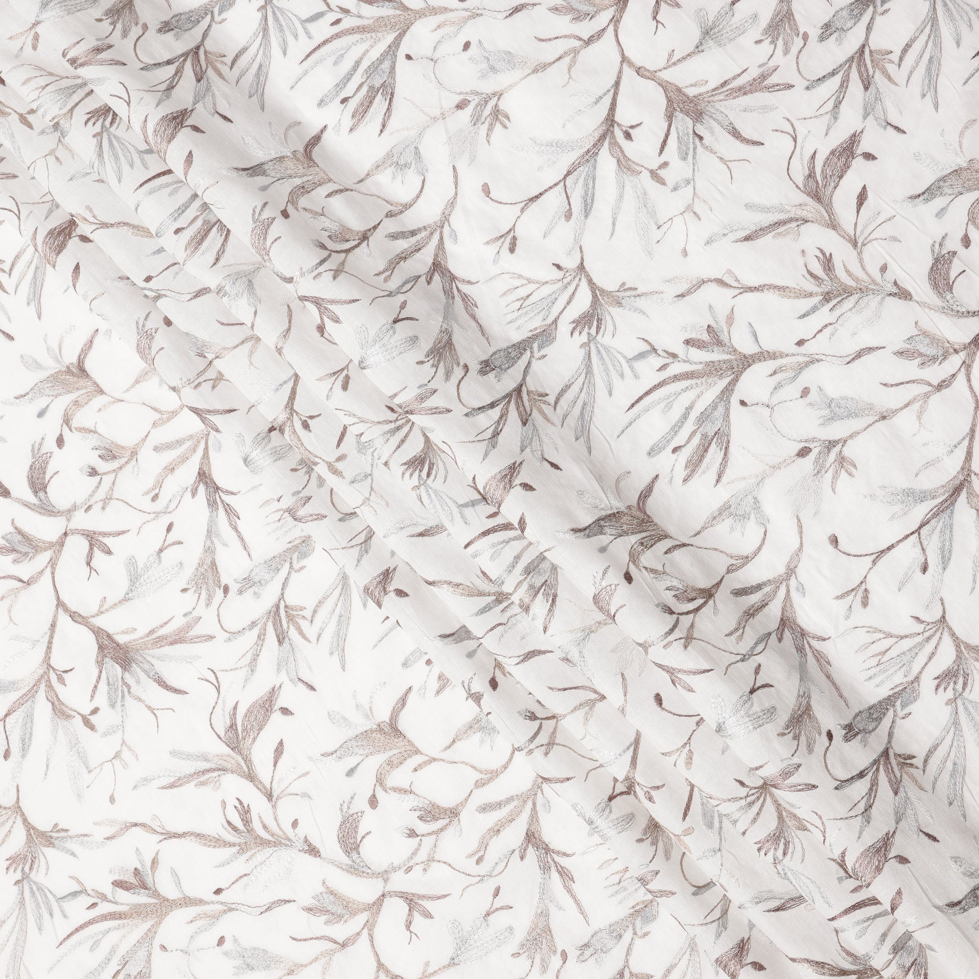 White Base with Subtle Brown and Grey Leaf Embroidery Cotton Voile Fabric, 110 Cms Width, India-D24671