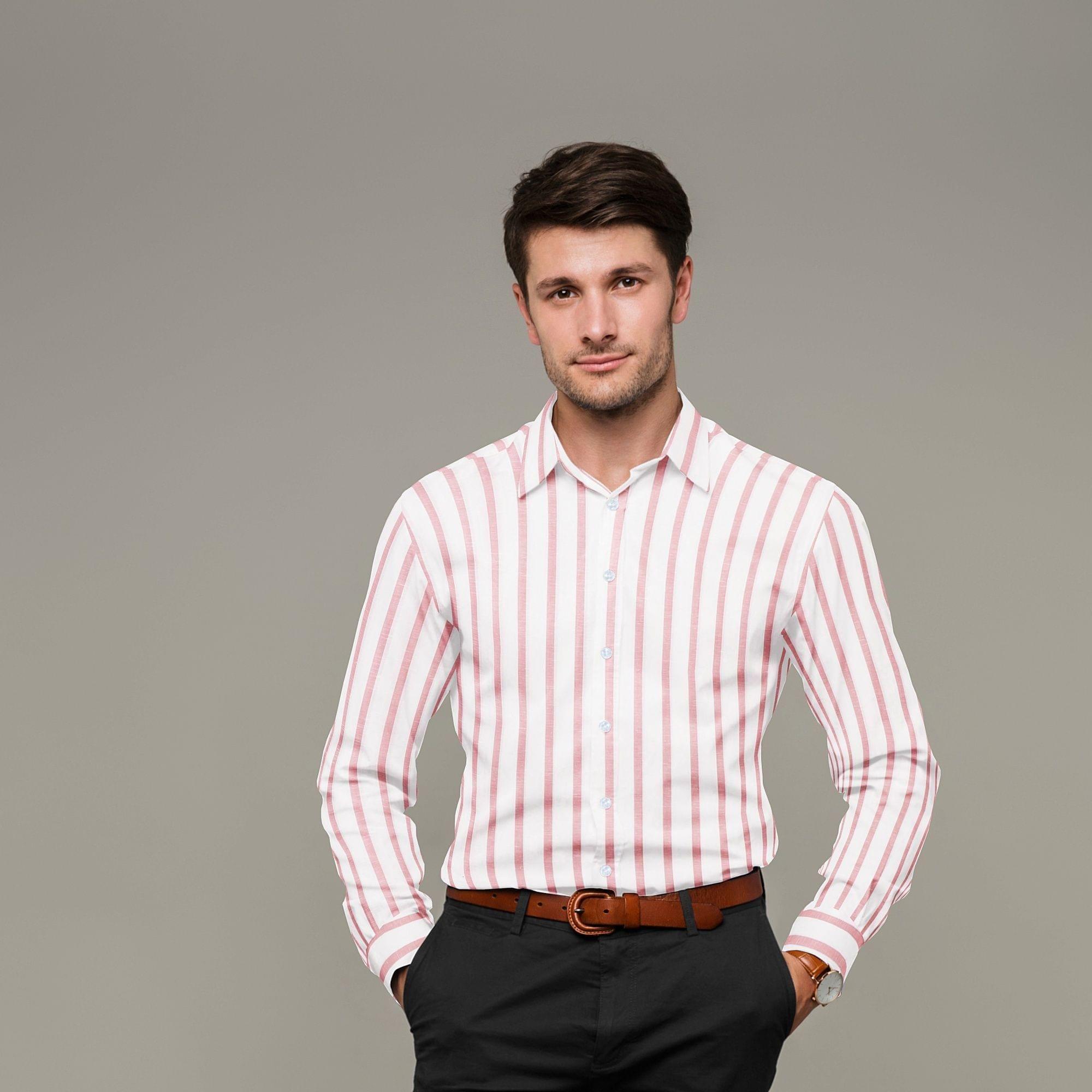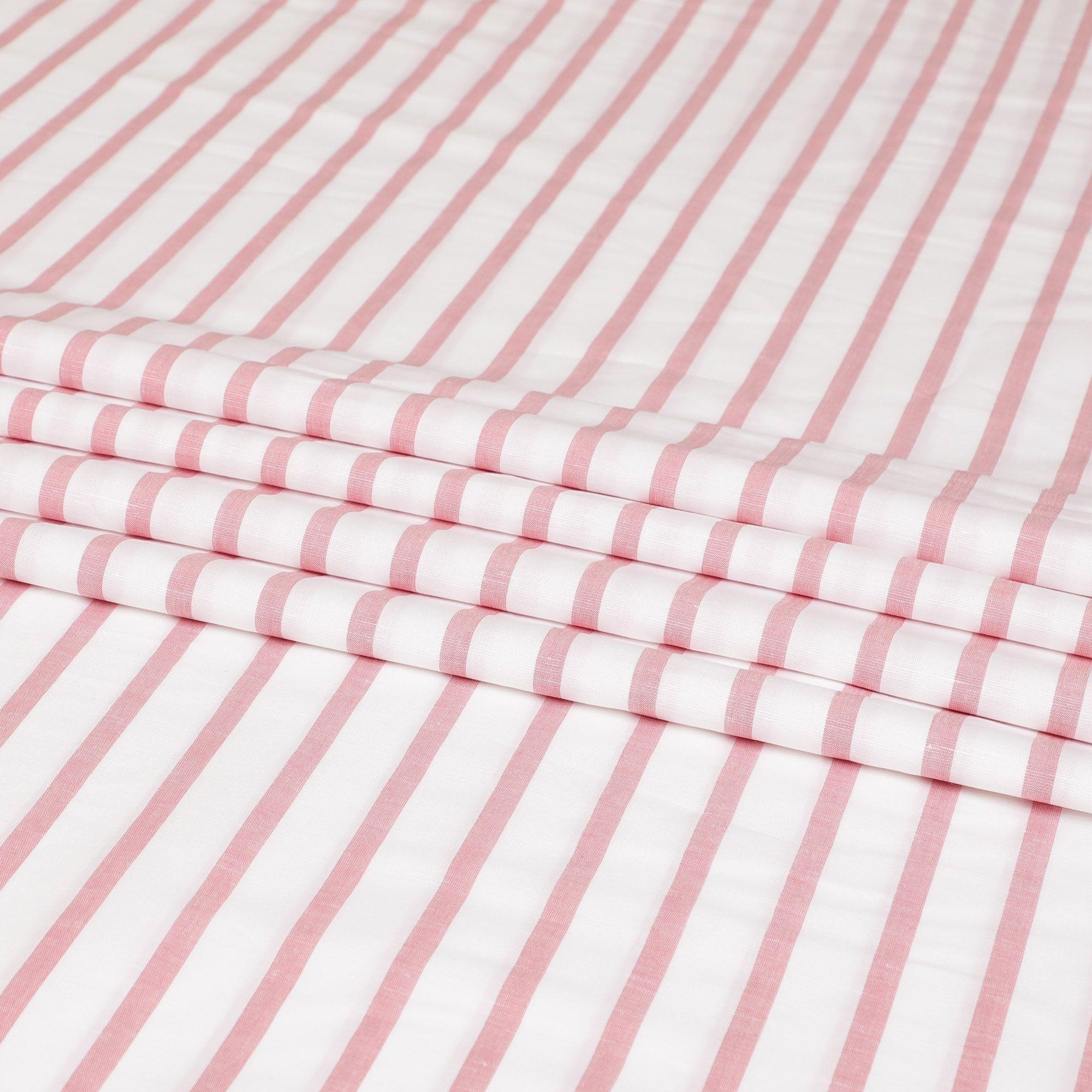 White cotton linen shirting fabric with peach print in stripe design-D7408